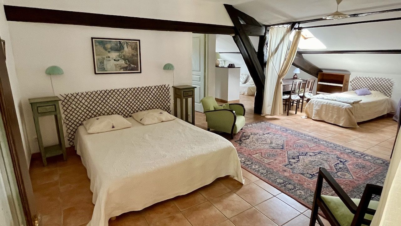 La partie privative propose une cuisine semi ouverte sur le séjour, un salon, une buanderie, une cave, des pièces de service ainsi que quatre chambres et une salle d'eau. La partie chambres d'hôtes propose cinq chambres ou suites, chacune dotée de sa propre salle d'eau et toilettes. L'ancienne étable a été aménagée en salle de petits déjeuners. Différents espaces de détente, trois terrasses, une piscine, une marre, un puits et deux dépendances complètent l'offre.