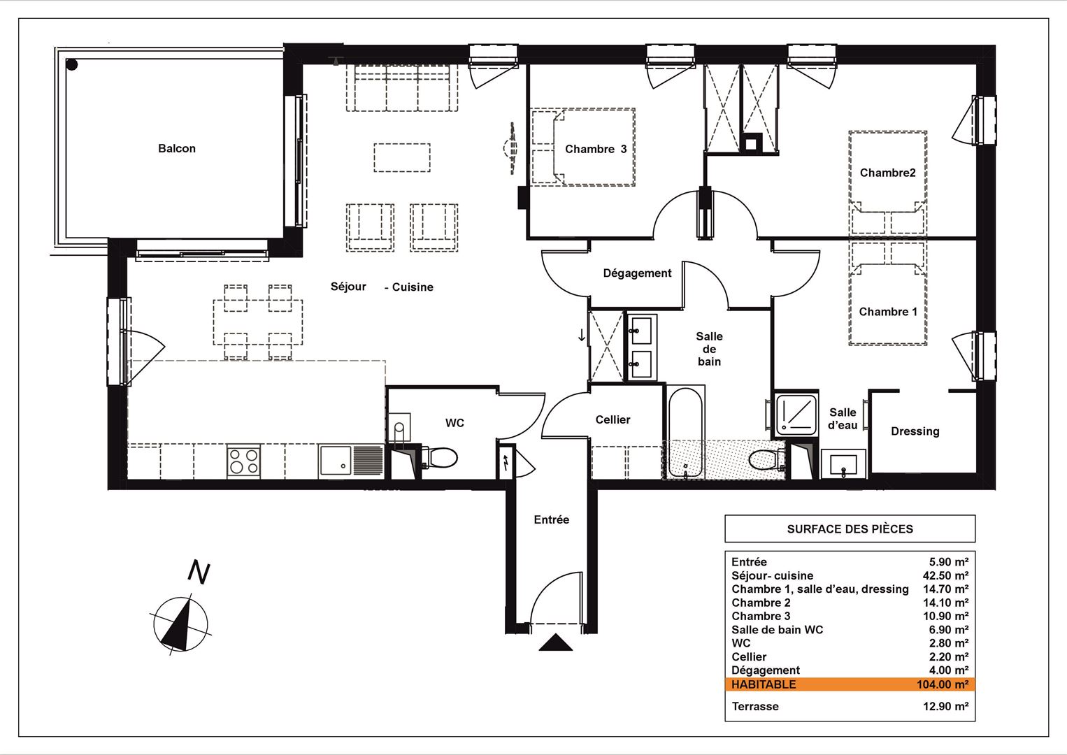Pessac-Alouette proche du parc Cazalet, des écoles, de la gare et de la piscine, bel appartement T4 de 104 m² habitables, au premier étage. Il se compose dune entrée, dun grand séjour-cuisine de 43 m² ouvrant sur une loggia de 13 m² orientée Ouest, de trois chambres, dont une avec dressing et salle deau, d'une salle de bain avec wc, dun wc indépendant et dun cellier. Conforme à la norme BBC-RT 2012, il est doté dun chauffage individuel au gaz. Il dispose de deux places de stationnement, au sous-sol. Larrêt du Trams B « Alouette » est distant de 500 m et le quartier alentour héberge une grande diversité de commerces. La copropriété compte 34 lots. Les charges seront de 170 euros par mois et la taxe foncière de 1 800 euros. Les honoraires dagence sont à la charge du vendeur.
