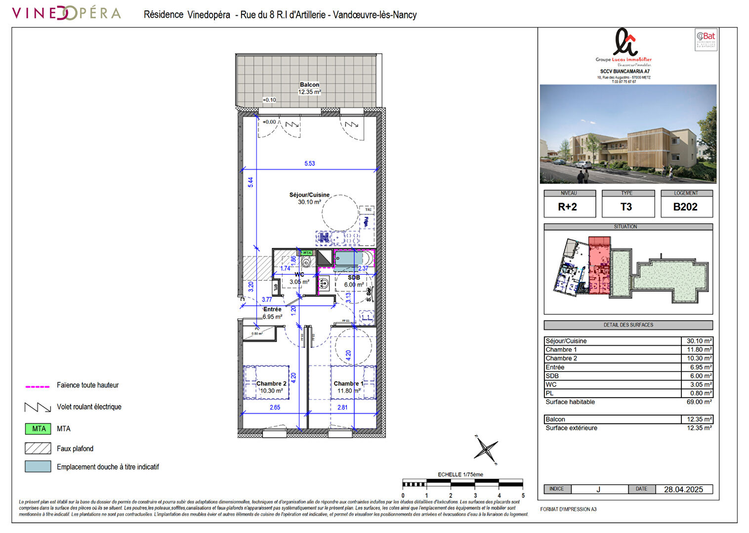 La résidence Vinedopéra située au coeur de l'écoquartier Biancamaria offre un environnement verdoyant. La résidence de 12 logements a été conçue pour vous offrir une qualité de vie optimale et des prestations de qualité parfaitement adaptée à vos besoins. Découvrez sans plus tarder ce T3 de 69m² comprenant un balcon, une entrée avec emplacement de placard, un séjour-cuisine, deux chambres, une salle de bains, un WC séparé. Contactez nous au 03 87 75 67 67 ou par e-mail : accueil@immogeorges.com PTZ + TVA 5,5% (sous réserve d'éligibilité) Copropriété de 12 lots - dont 12 lots habitation.