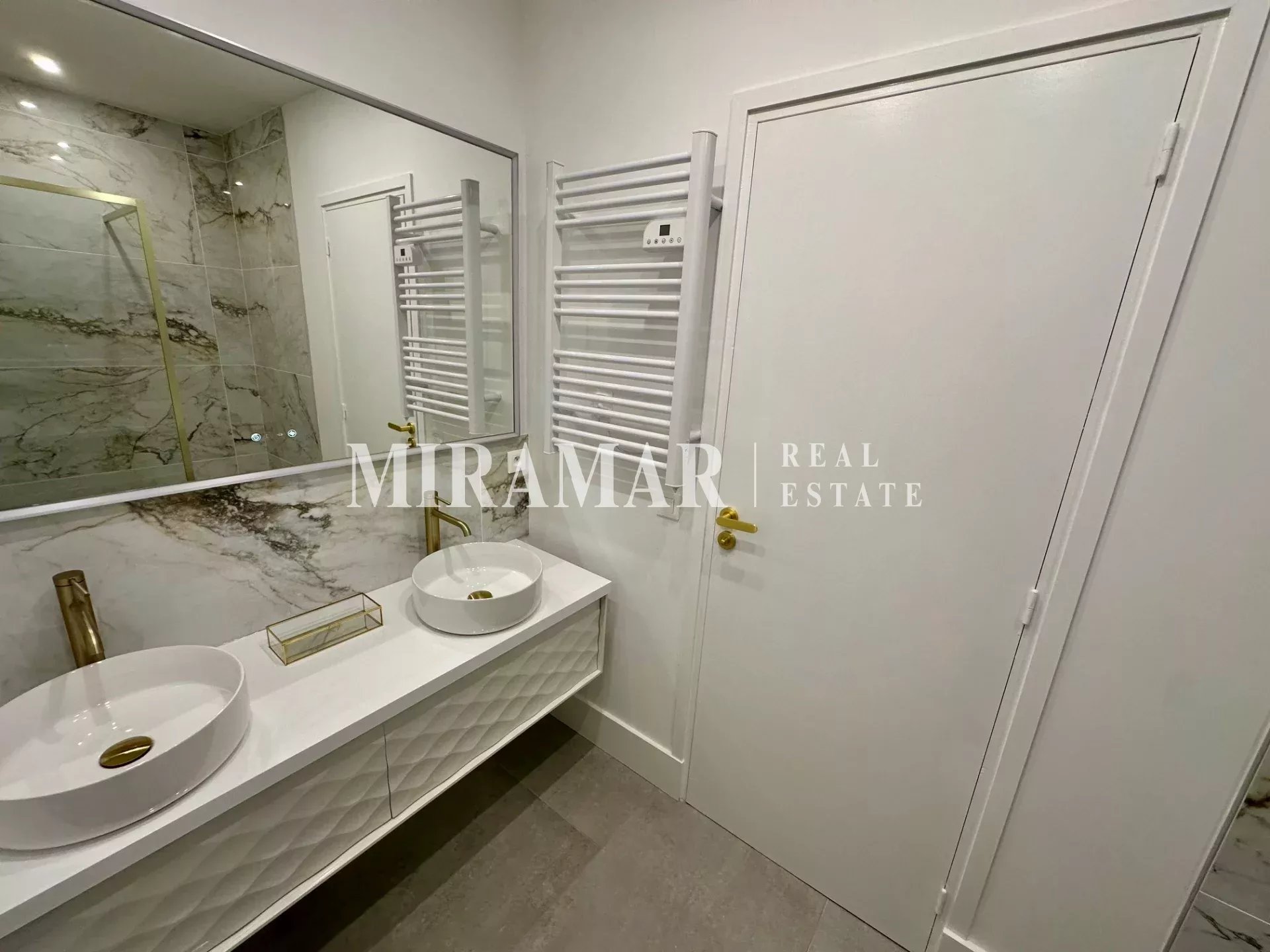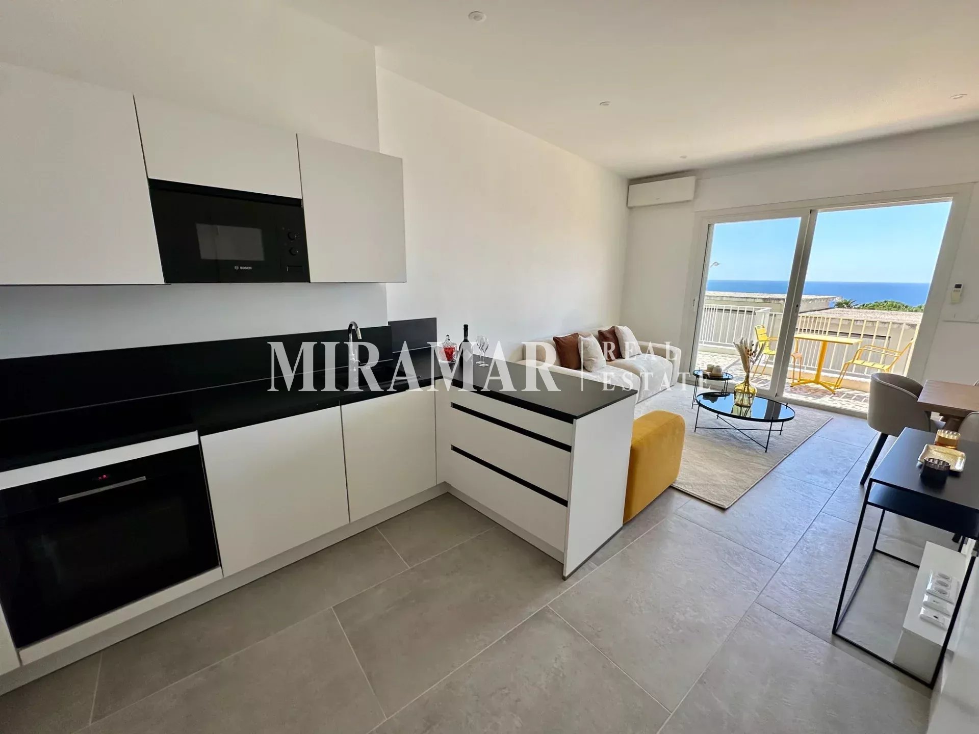 Cap de Nice Dans résidence de standing, superbe 3 pièces de 58 m² avec belle vue mer. Séjour avec cuisine américaine et chambre de maitre donnant sur une agréable terrasse exposée Sud. Une deuxième chambre avec placards. Salle de douche avec double vasque. Prestations de très bonne facture. Entièrement meublé. A proximité des commerces.