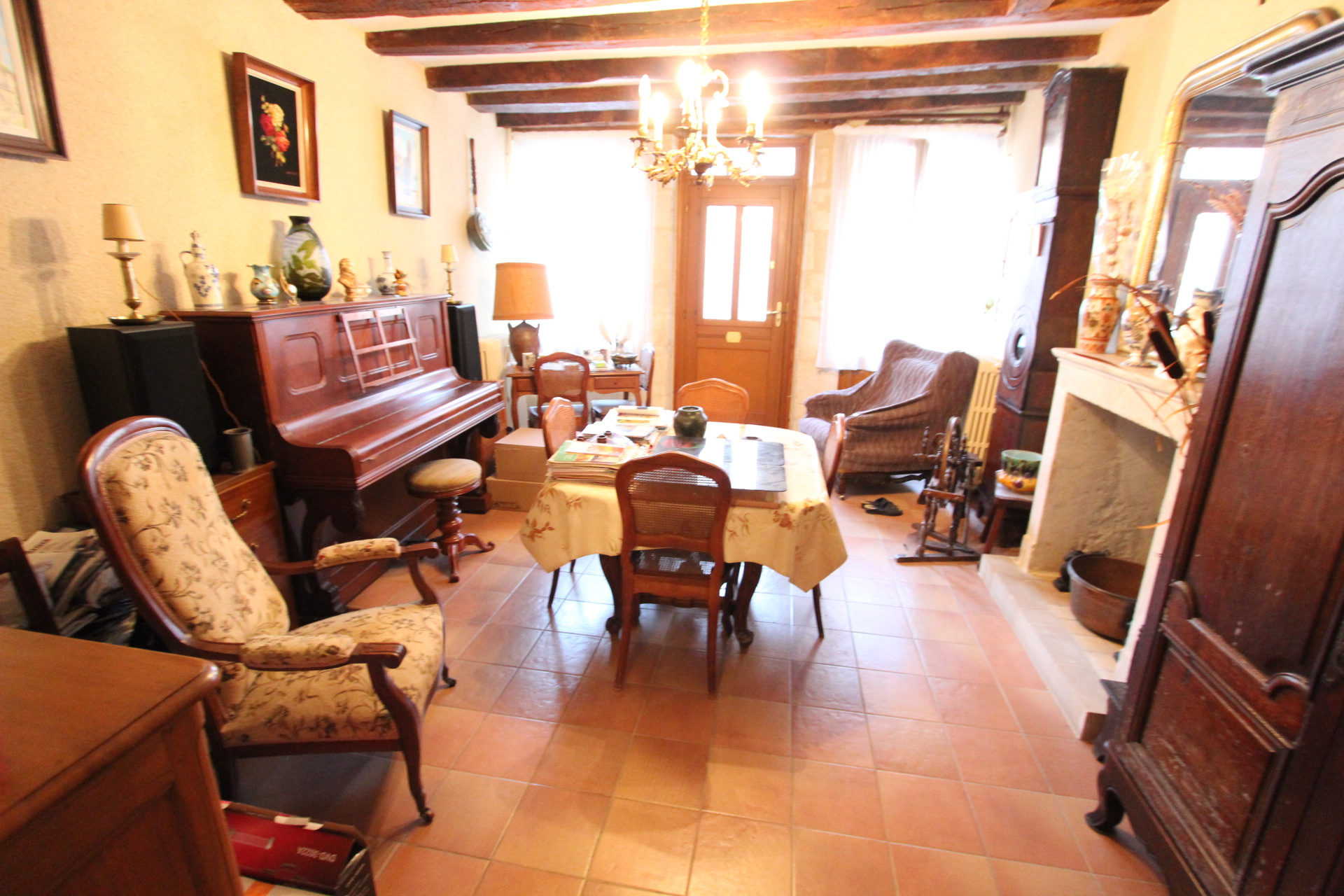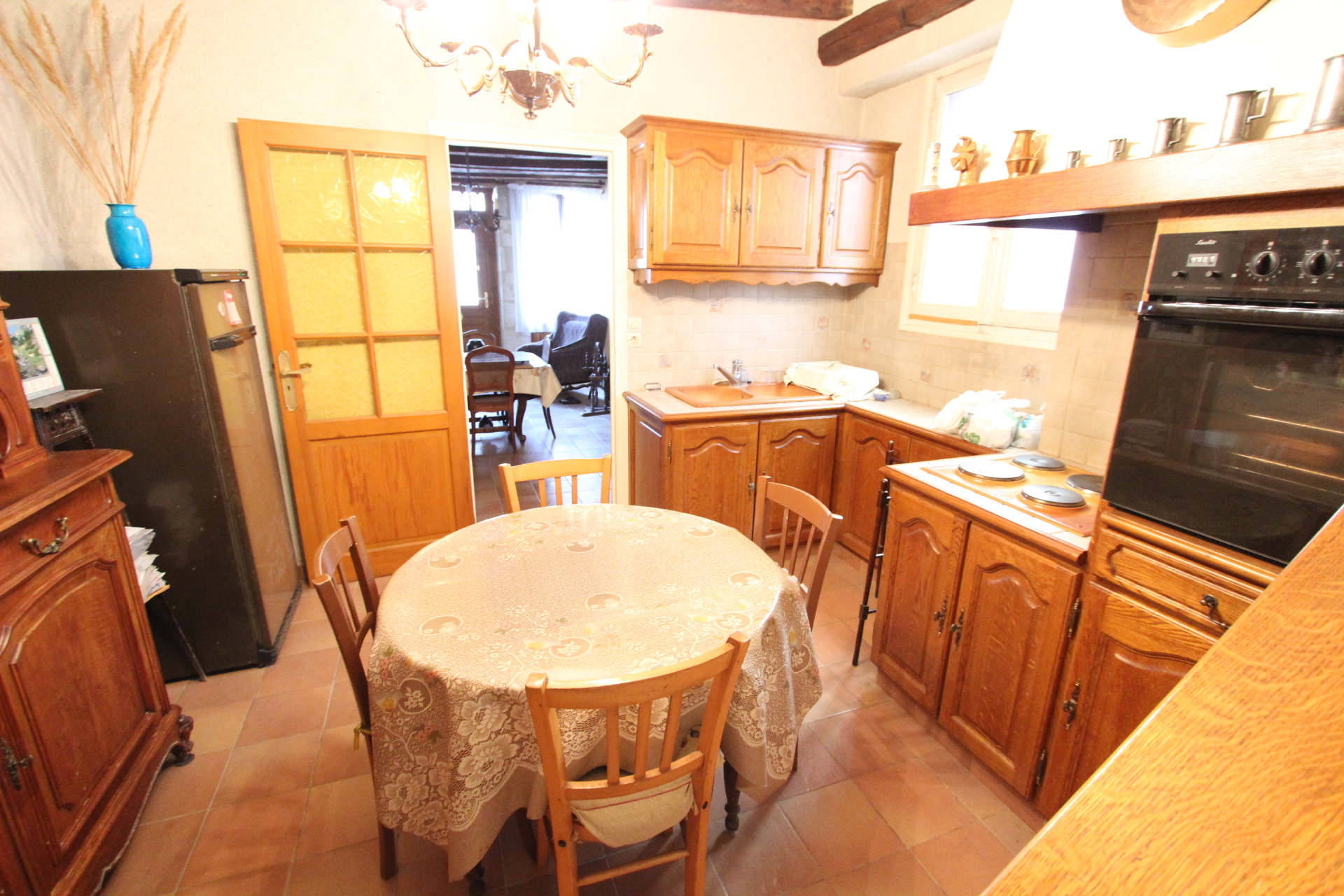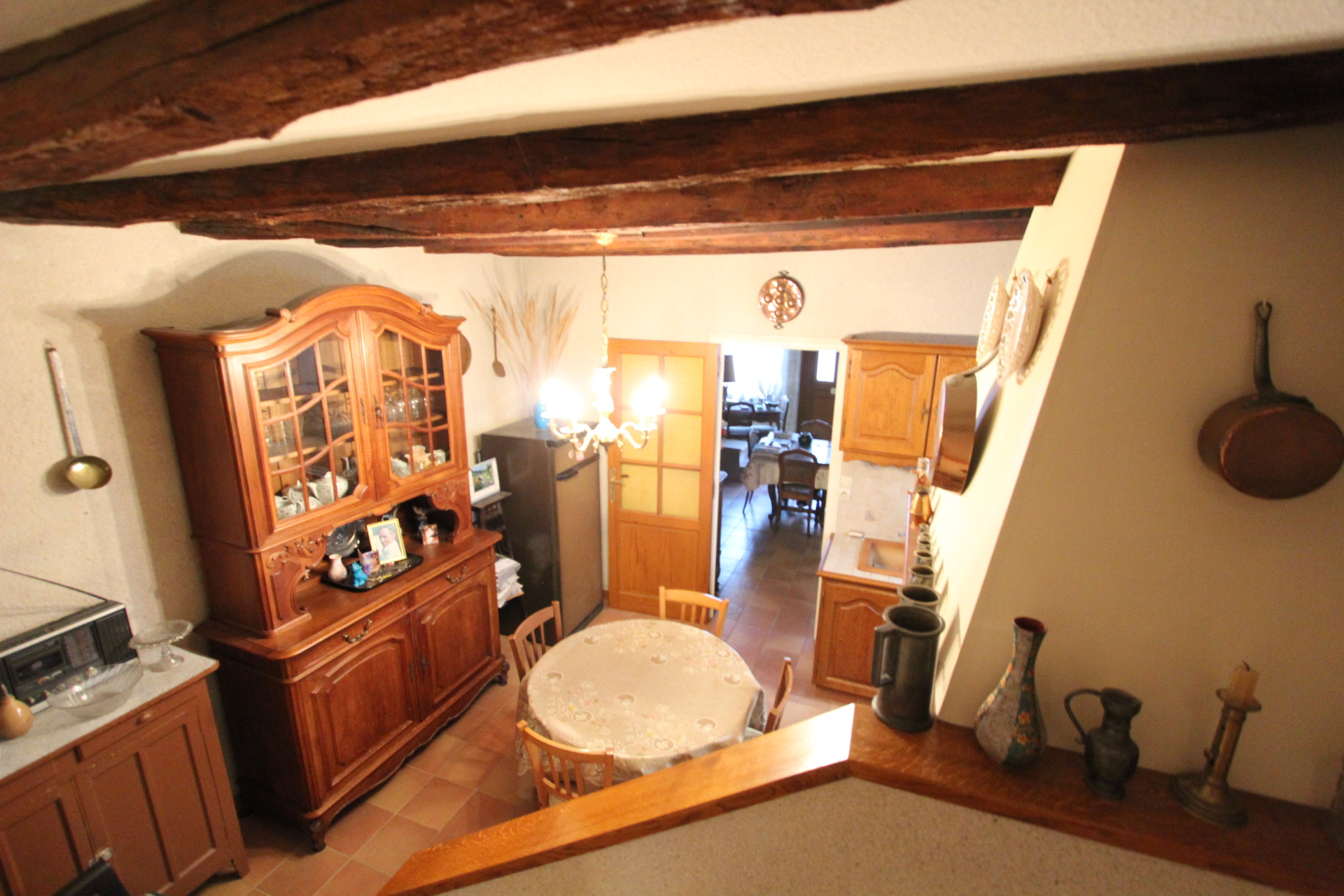 maison sur deux niveaux avec cave et buanderie comprenant un séjour avec cheminée et poutres , une cuisine équipée , un w.c ; à l'étage trois chambres ,