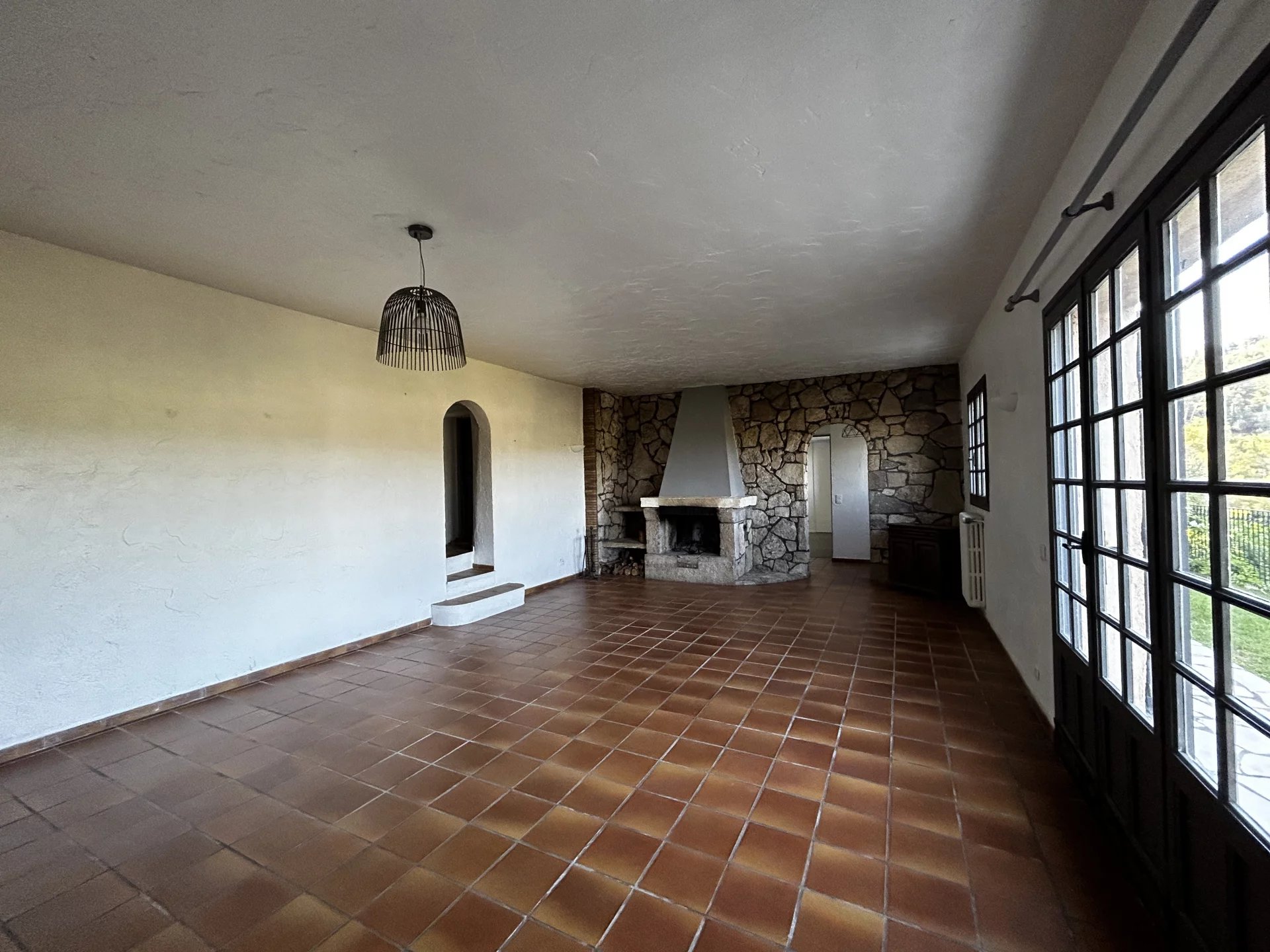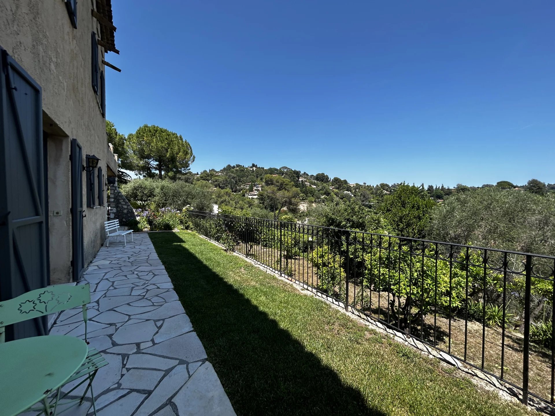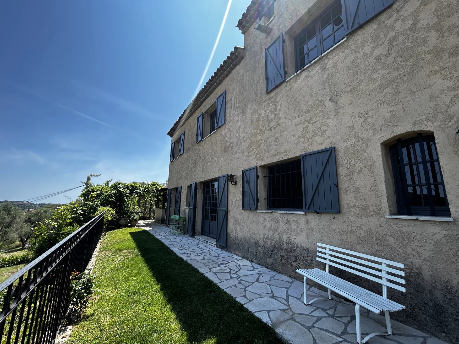 Bel Appartement en Rez de Jardin - avec terrain Dans une maison en pierre, au calme absolu, vue dégagée et aucun vis à vis. A 2 minutes du centre de Mougins avec tous ces commerces. Appartement de charme 6 pièces, sur 2 niveaux. Au Rez de jardin : entrée, une chambre de plain-pied avec salle de douche et toilette, un grand salon avec cheminée, cuisine semi-ouverte équipée, le tout donnant sur un beau jardin avec vue dégagée sur les collines. Un coin terrasse avec cuisine extérieure. Un terrain d'environ 600m2 en plus. A l'étage, 3 belles chambres une salle de bain et au niveau supérieur une mezzanine avec terrasse privée. A cela s'ajoute des places de stationnement en extérieur, un garage couvert, un atelier, une cave. Un grand studio indépendant peut en complément du prix être inclus. Un joli bien agréable, en bon état à visiter