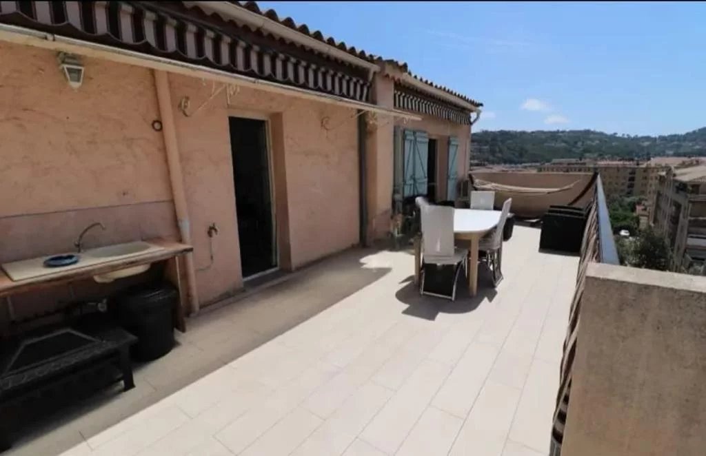 VALLAURIS TAPIS VERT - au DERNIER étage d'une résidence sécurisée avec Piscine du centre-ville mais complétement au calme, spacieux appartement Traversant de 4 Pièces 90m² comprenant entrée-salon de 40m², cuisine américaine équipée,3 belles chambres avec placards et grand placard avec rangements dans le couloir, salle de douche avec fenêtre, wc indépendant. Grande TERRASSE de 35m²avec cuisine d'été ayant superbe Vue Panoramique et stores électriques Une deuxième terrasse de 10m² avec vue dégagée. Un BOX et une CAVE complètent ce bien. Places de PARKING VISITEURS disponibles dans la résidence. Nous vous attendons pour une visite.
