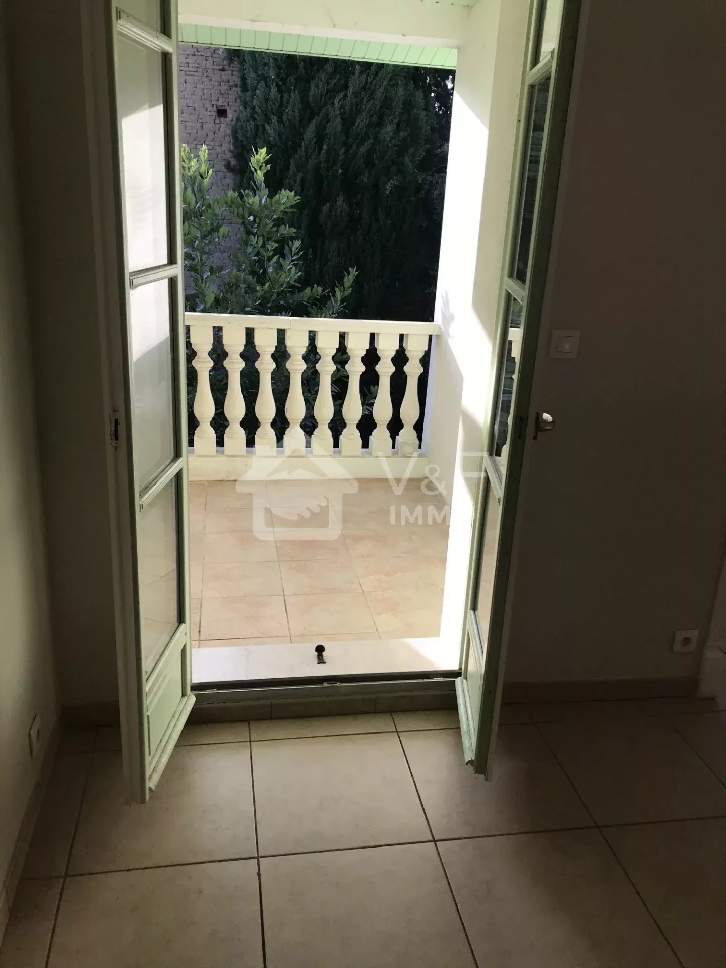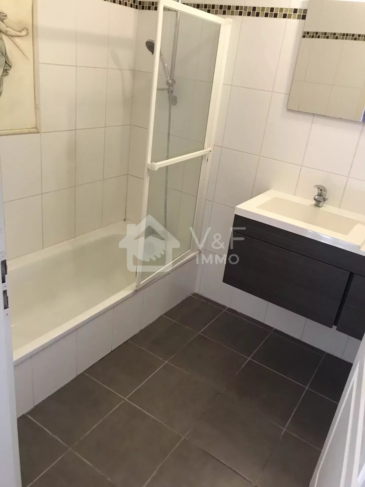 Le premier étage (T3) comprend une entrée, un WC indépendant avec lave-mains, une cuisine équipée avec bar, un salon et une salle à manger, deux chambres avec placard, une salle de bains avec vasque et baignoire, ainsi qu'un balcon. Une place de parking est également attribuée à cet appartement.