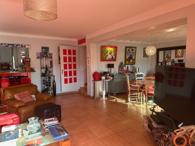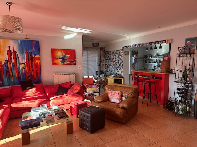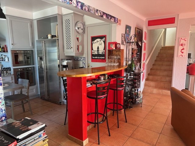 Dans la partie principale vous entrez dans une vaste pièce à vivre très lumineuse avec cuisine ouverte et accés à l'espace piscine .