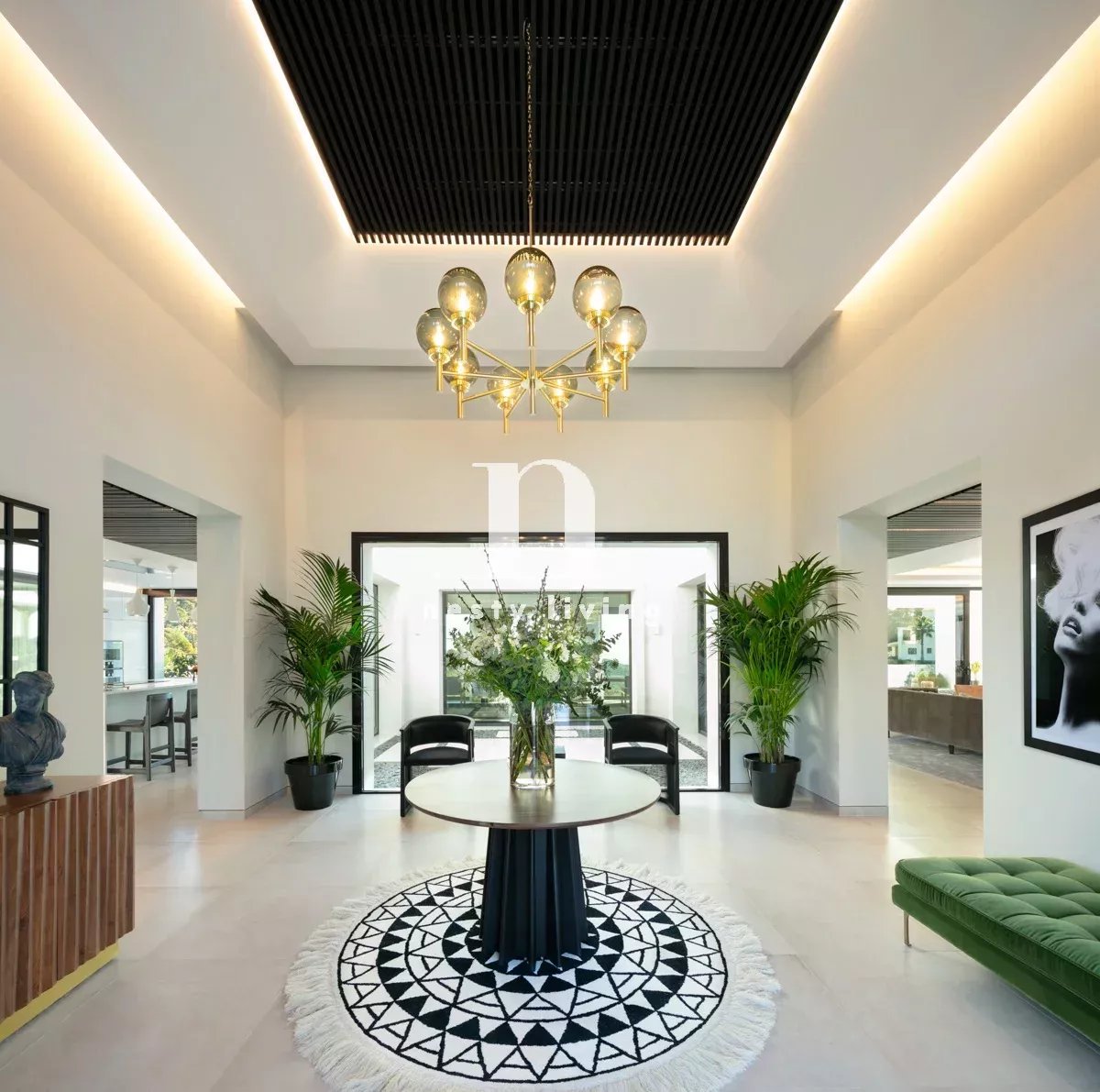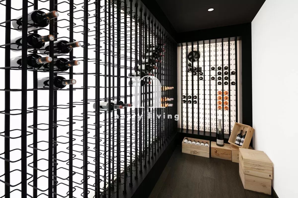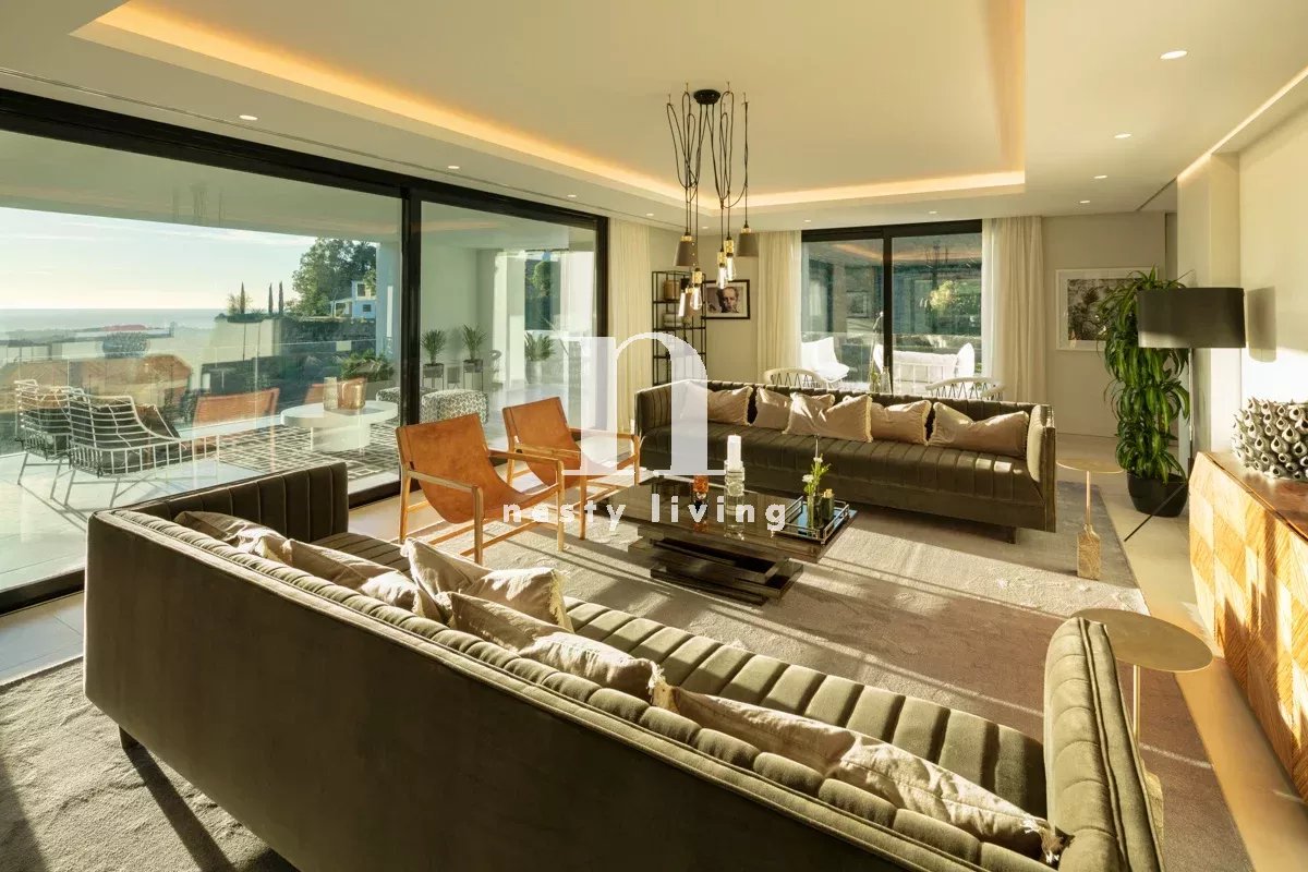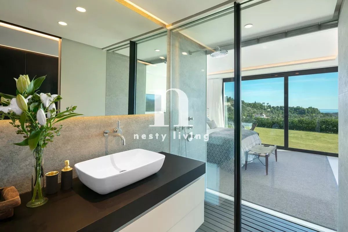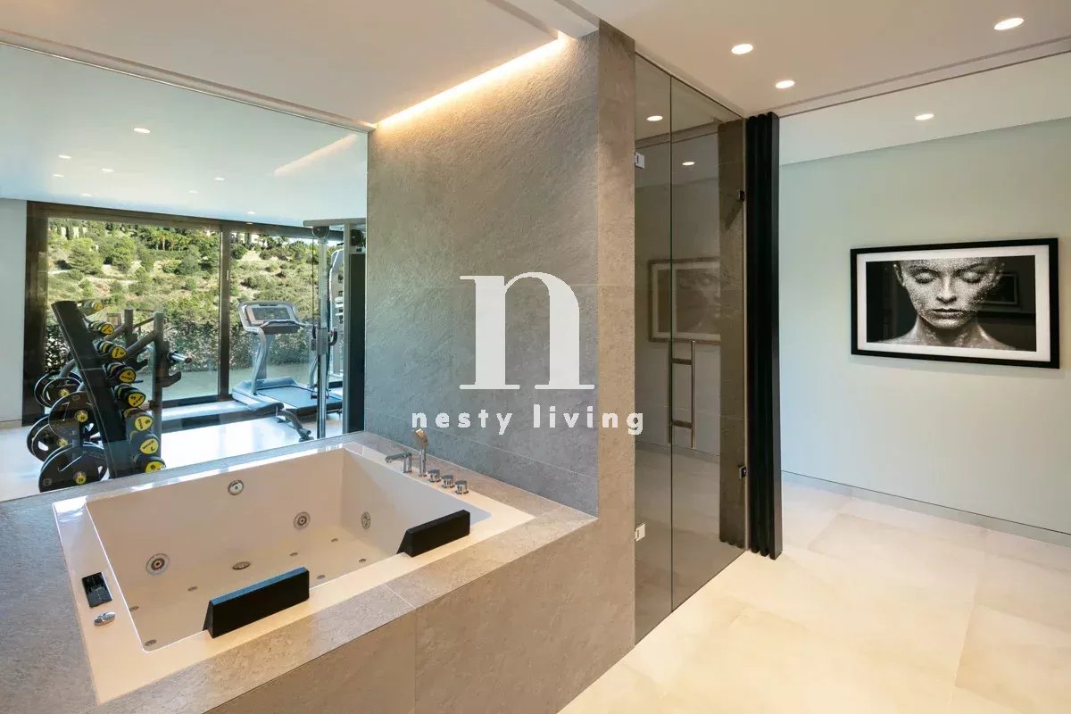 Le rez-de-chaussée comprend un grand hall, deux salons, une salle à manger spectaculaire et une belle cuisine contemporaine. Au niveau inférieur, on trouve quatre chambres de bonne taille, une salle de sport, une buanderie et un spa. Toutes les chambres ont une vue magnifique sur la mer, des fenêtres du sol au plafond, un accès direct au jardin et une salle de bains en-suite.