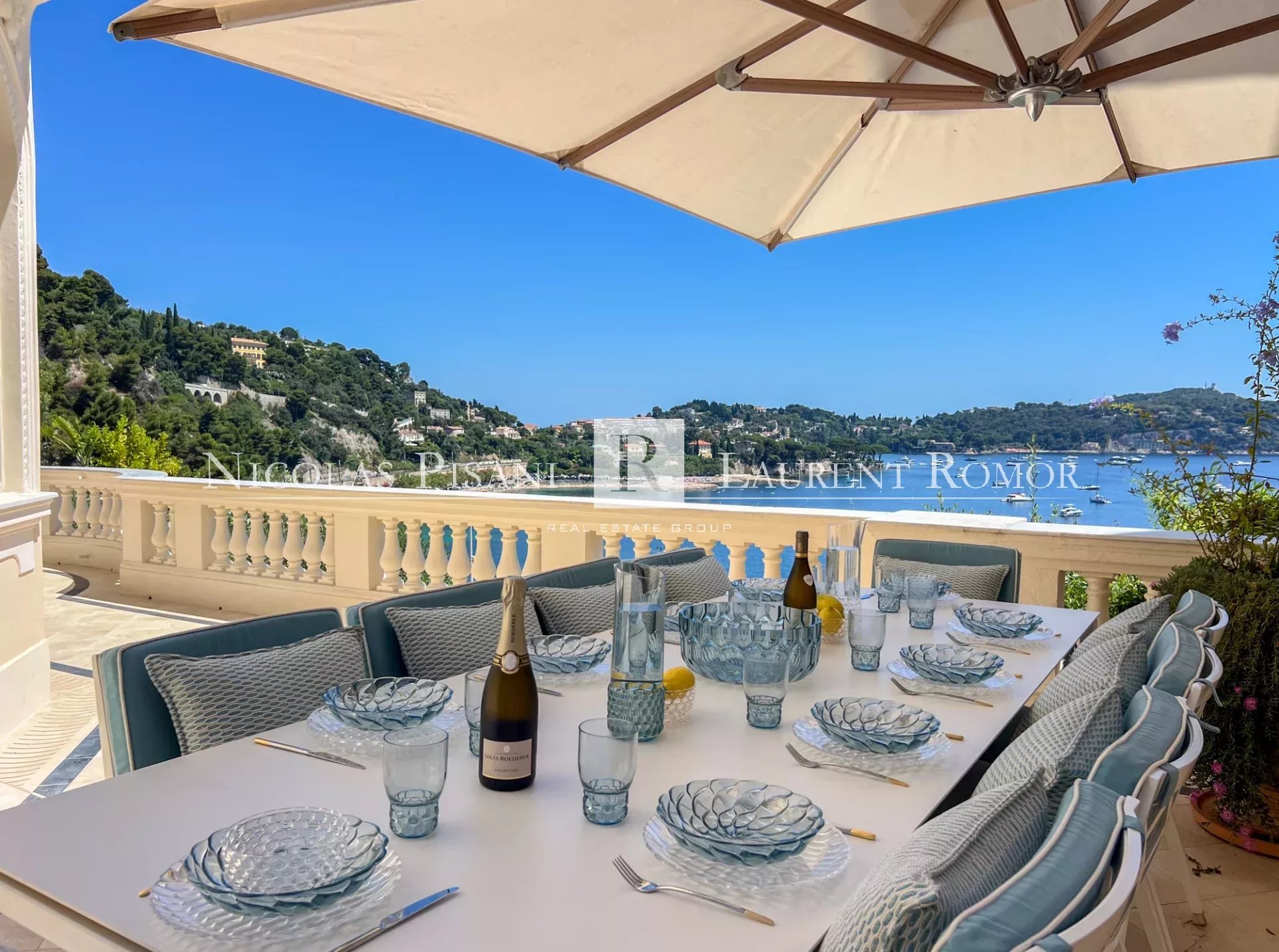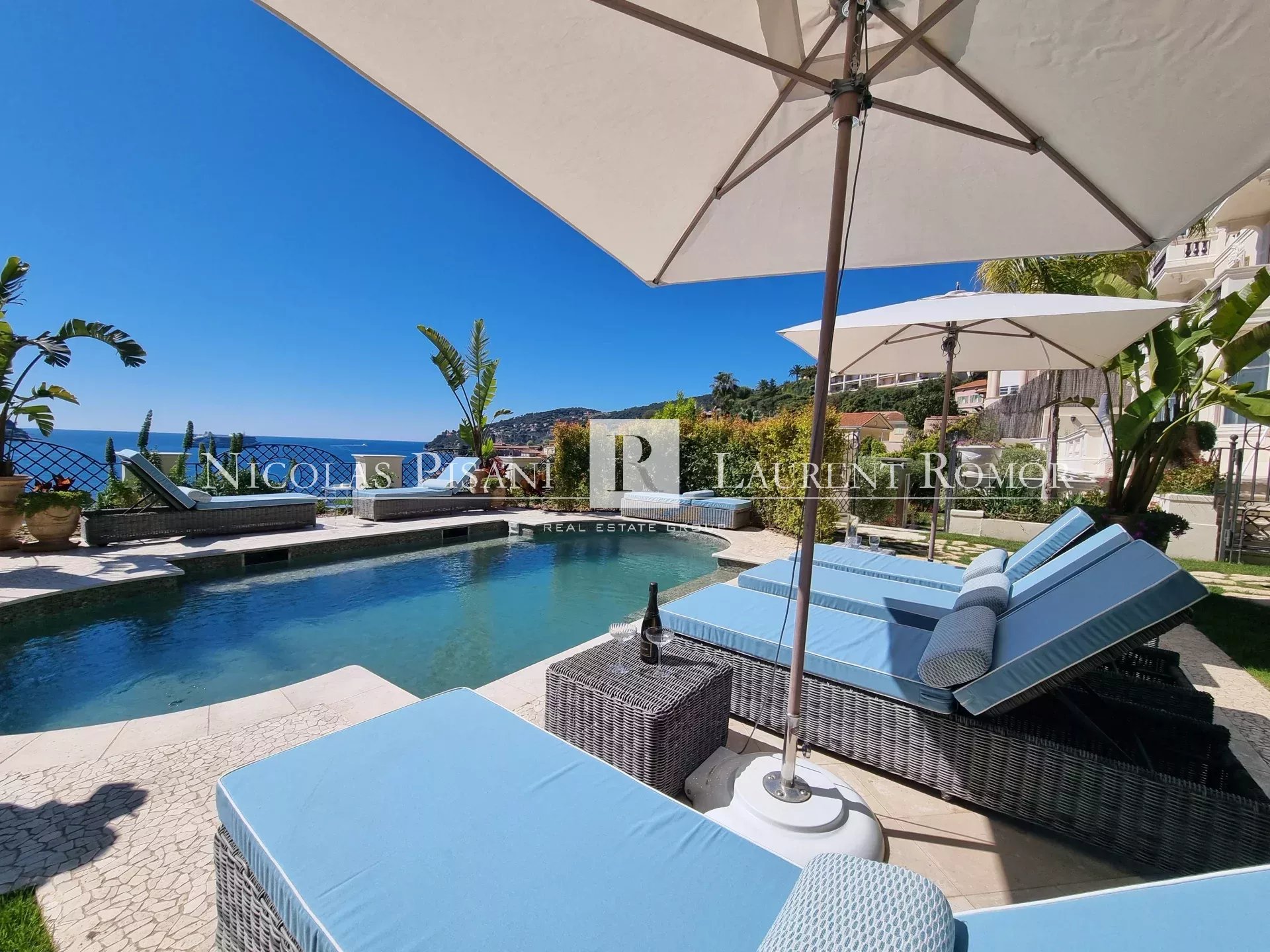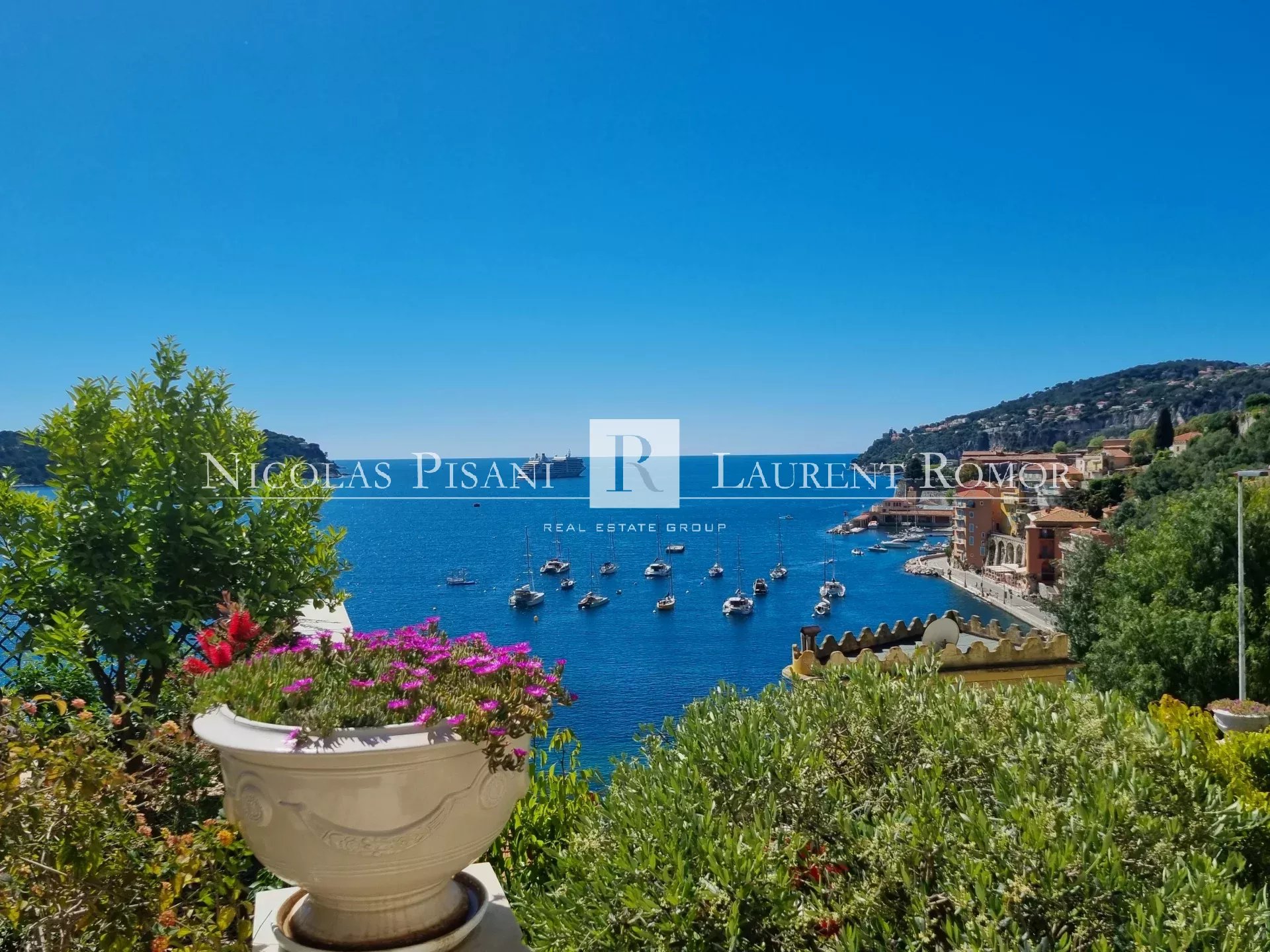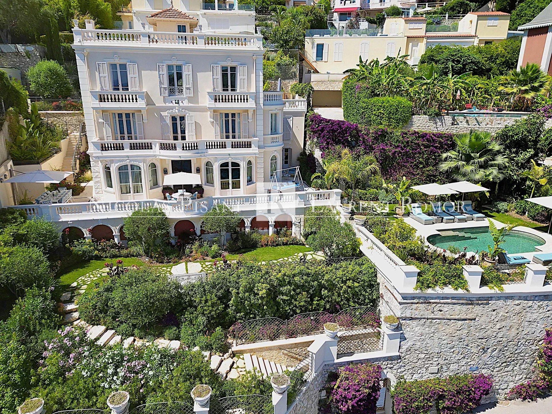 Dominant la Rade de Villefranche et le Cap Ferrat, magnifique villa Belle époque avec piscine et jardin plat offrant une vue mer panoramique sur la Rade de Villefranche sur mer et située à deux pas des plages . La villa bénéficie d'un spacieux séjour, d'une belle salle à manger donnant accès direct sur la terrasse, d'une cuisine véranda parfaitement pensée et de 4 chambres équipées ainsi: Au premier étage : 1 chambre de Maître avec une salle de douche, un dressing et un balcon et une chambre, avec salle douche avec système hammam, un dressing et un balcon. Au second étage : 1 chambre avec deux balcons, un dressing et une salle de douche , et une chambre avec balcon, salle de bain et dressing. A ceci, vous avez la possibilité de profiter d'un studio indépendant avec sa cuisine, sa salle de douche et sa chambre. En annexe : un pool house avec salle de douche, matériel de sport et un petit frigo. A cela s'ajoute une grande piscine, plusieurs jardins complantés d'arbres méditerranéen, un garage pour trois voitures et un ascenseur. Les prestations sont : barbecue, internet, climatisation, système d'alarme, vidéo surveillance.