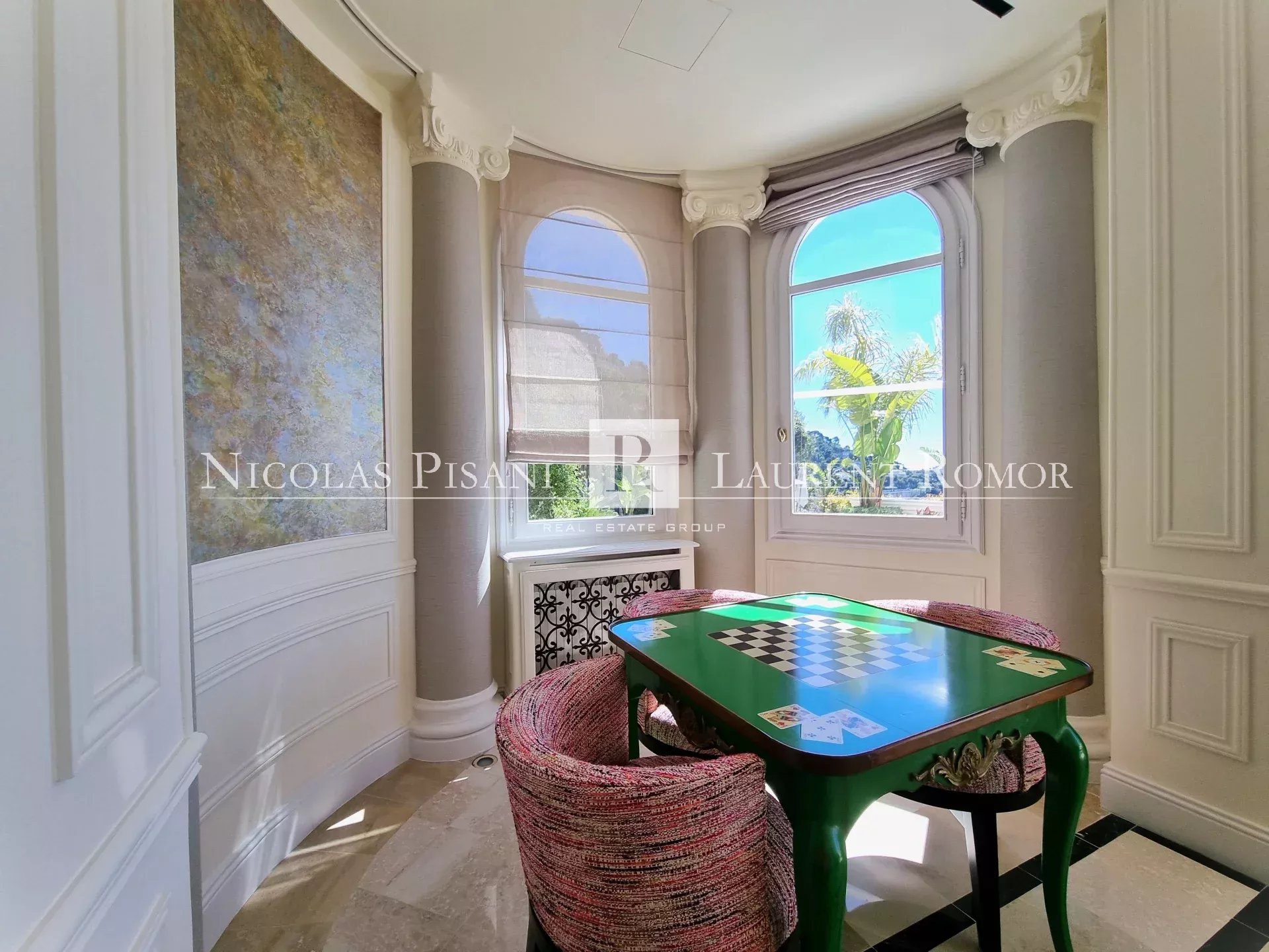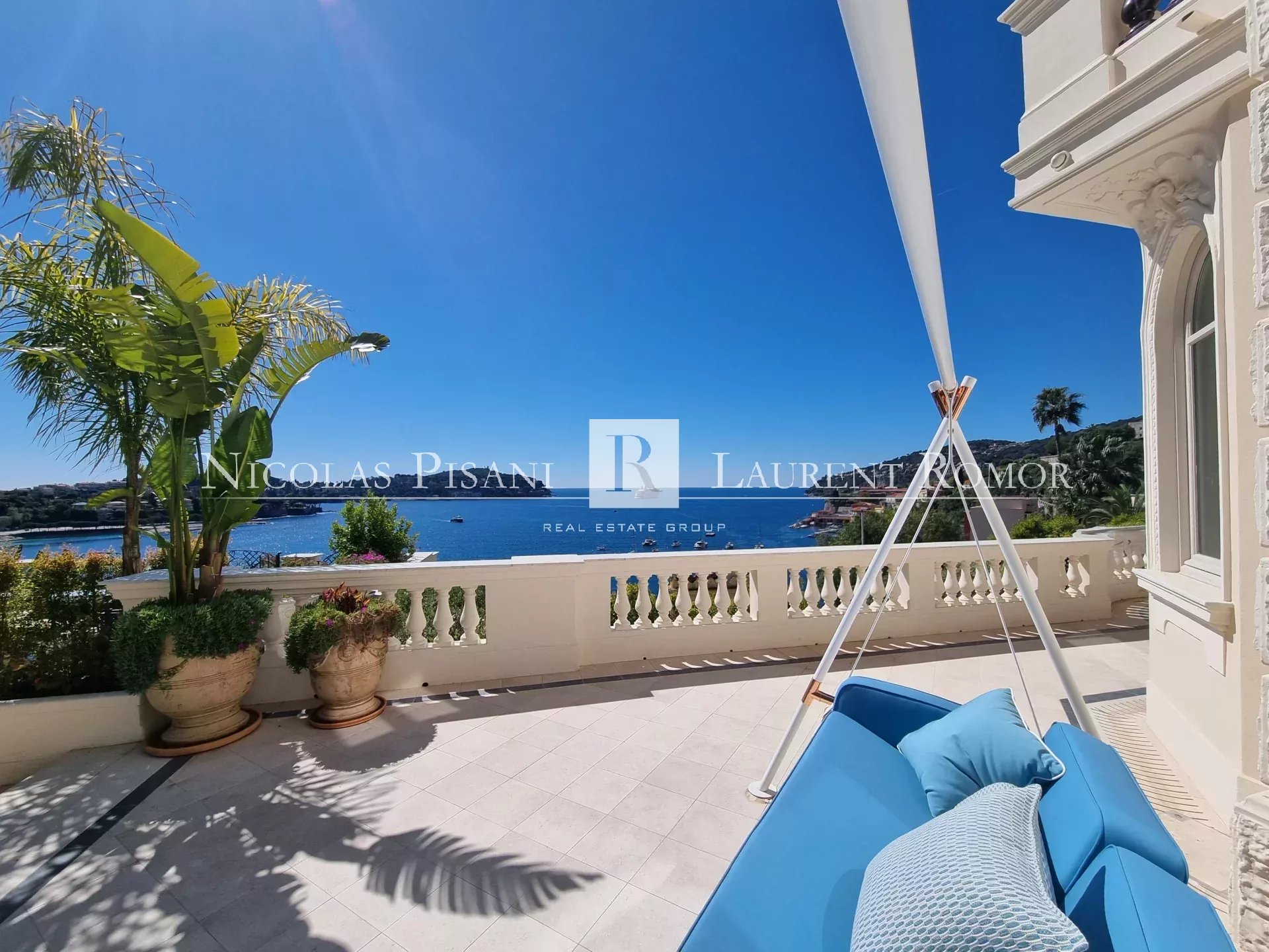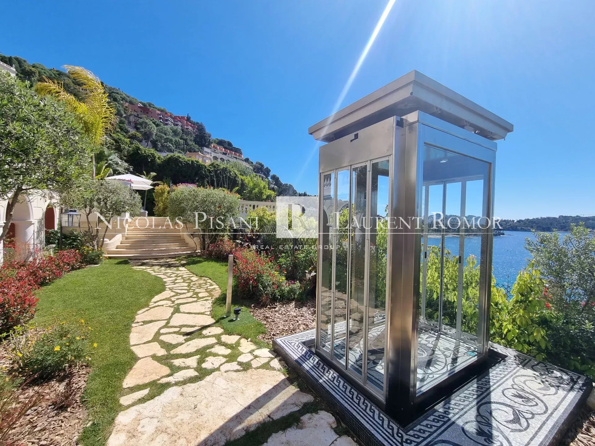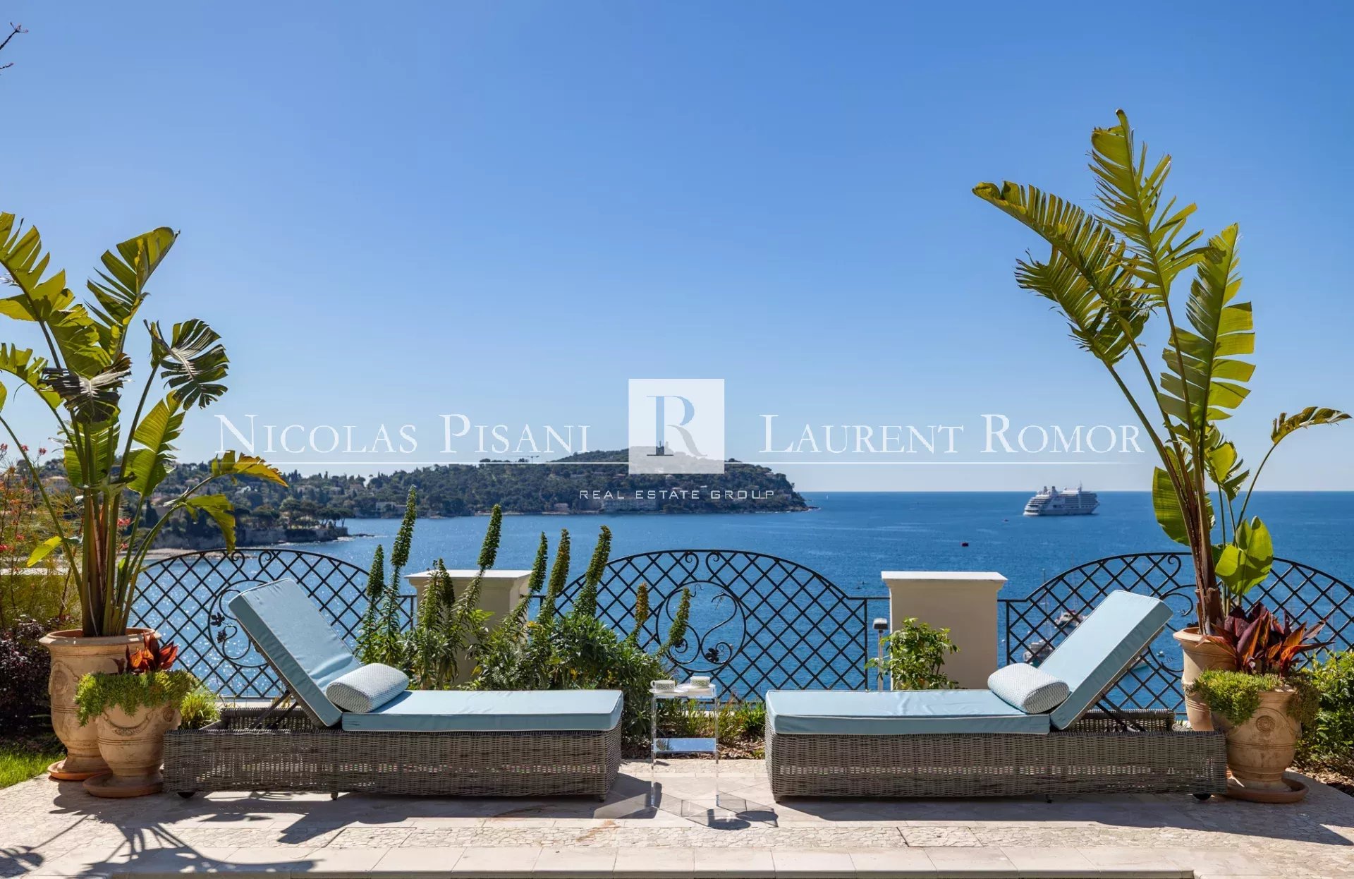 Dominant la Rade de Villefranche et le Cap Ferrat, magnifique villa Belle époque avec piscine et jardin plat offrant une vue mer panoramique sur la Rade de Villefranche sur mer et située à deux pas des plages . La villa bénéficie d'un spacieux séjour, d'une belle salle à manger donnant accès direct sur la terrasse, d'une cuisine véranda parfaitement pensée et de 4 chambres équipées ainsi: Au premier étage : 1 chambre de Maître avec une salle de douche, un dressing et un balcon et une chambre, avec salle douche avec système hammam, un dressing et un balcon. Au second étage : 1 chambre avec deux balcons, un dressing et une salle de douche , et une chambre avec balcon, salle de bain et dressing. A ceci, vous avez la possibilité de profiter d'un studio indépendant avec sa cuisine, sa salle de douche et sa chambre. En annexe : un pool house avec salle de douche, matériel de sport et un petit frigo. A cela s'ajoute une grande piscine, plusieurs jardins complantés d'arbres méditerranéen, un garage pour trois voitures et un ascenseur. Les prestations sont : barbecue, internet, climatisation, système d'alarme, vidéo surveillance.