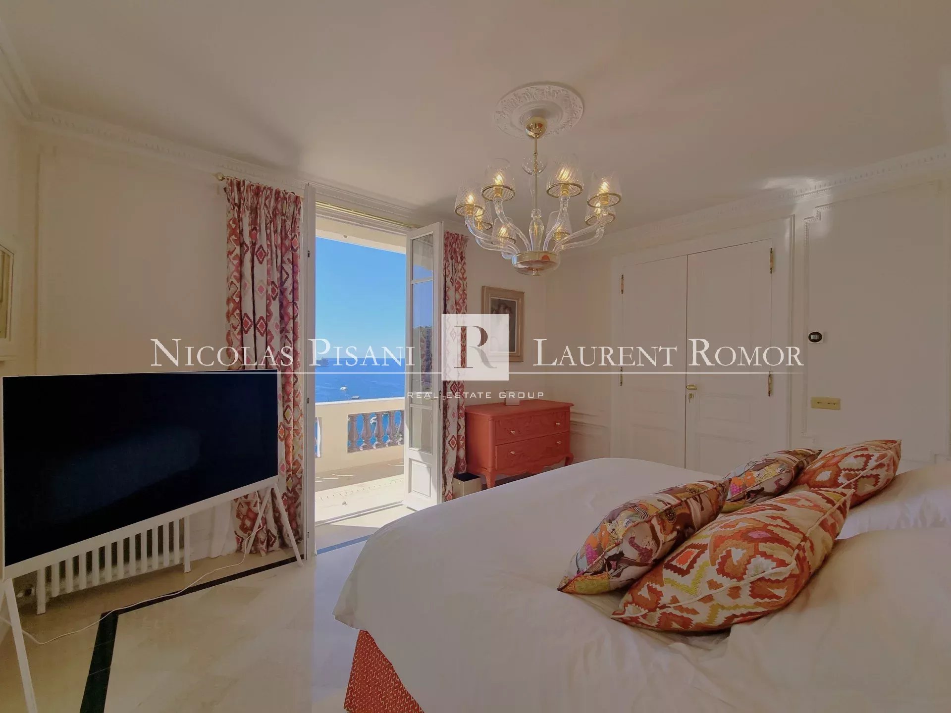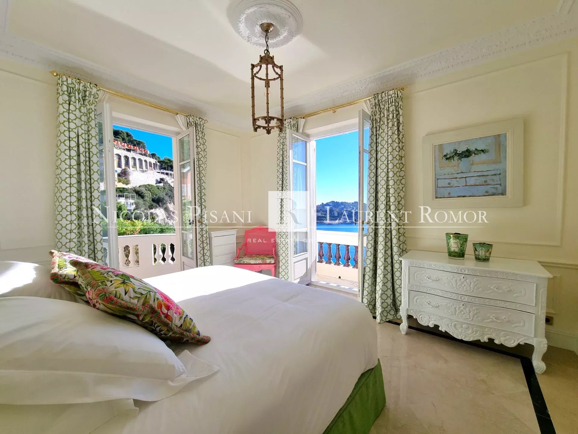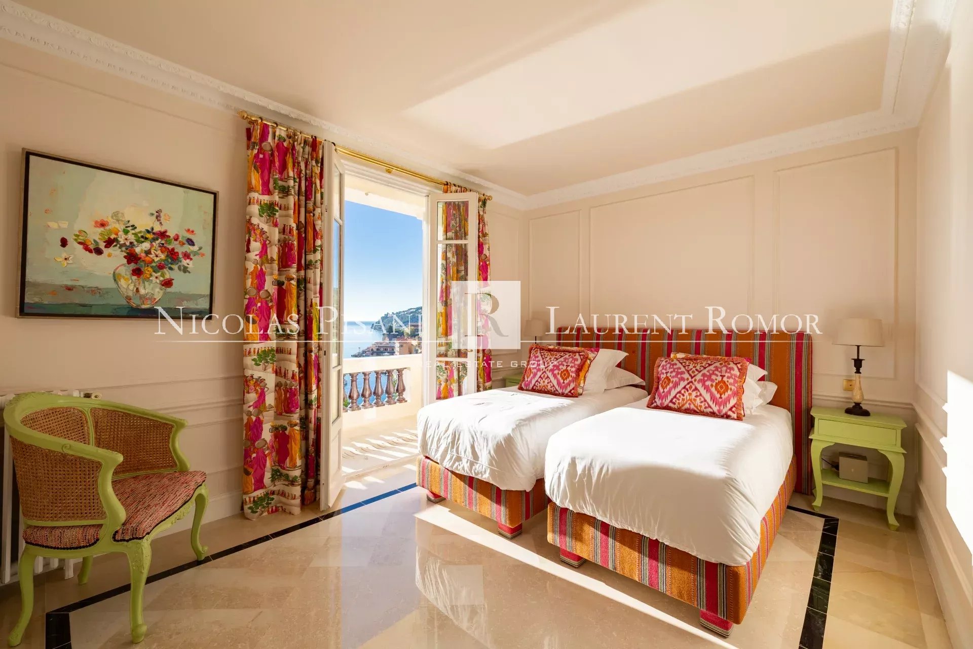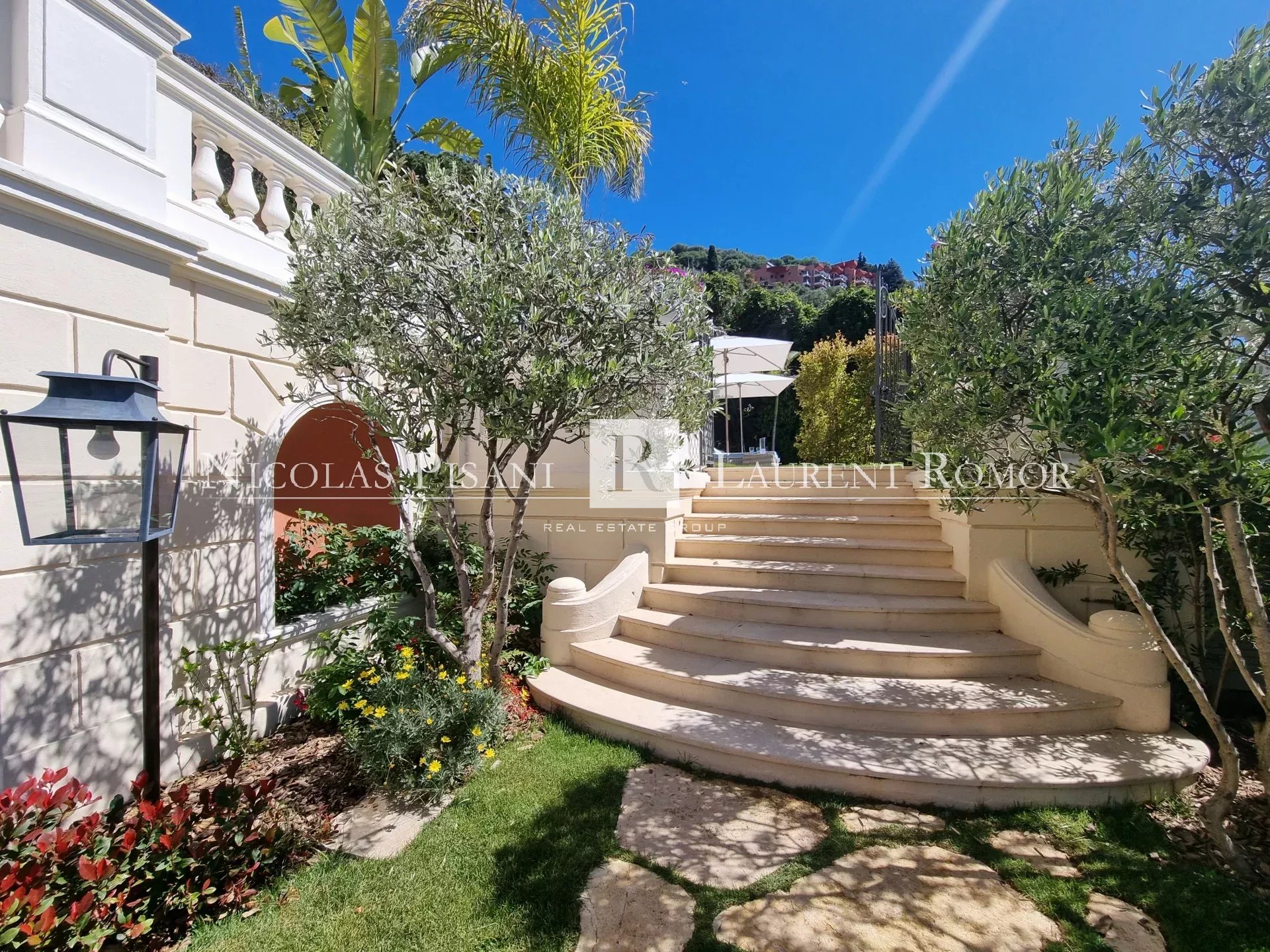 Dominant la Rade de Villefranche et le Cap Ferrat, magnifique villa Belle époque avec piscine et jardin plat offrant une vue mer panoramique sur la Rade de Villefranche sur mer et située à deux pas des plages . La villa bénéficie d'un spacieux séjour, d'une belle salle à manger donnant accès direct sur la terrasse, d'une cuisine véranda parfaitement pensée et de 4 chambres équipées ainsi: Au premier étage : 1 chambre de Maître avec une salle de douche, un dressing et un balcon et une chambre, avec salle douche avec système hammam, un dressing et un balcon. Au second étage : 1 chambre avec deux balcons, un dressing et une salle de douche , et une chambre avec balcon, salle de bain et dressing. A ceci, vous avez la possibilité de profiter d'un studio indépendant avec sa cuisine, sa salle de douche et sa chambre. En annexe : un pool house avec salle de douche, matériel de sport et un petit frigo. A cela s'ajoute une grande piscine, plusieurs jardins complantés d'arbres méditerranéen, un garage pour trois voitures et un ascenseur. Les prestations sont : barbecue, internet, climatisation, système d'alarme, vidéo surveillance.