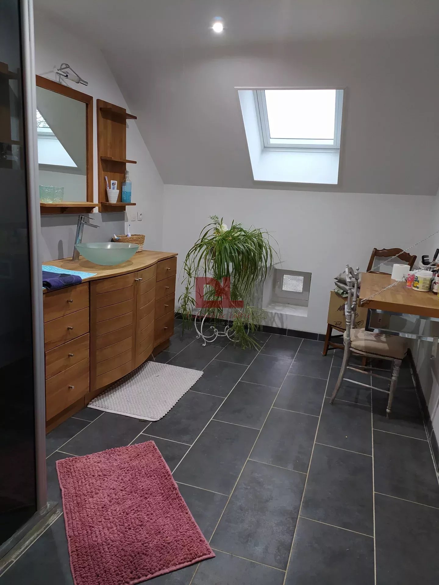 - A l'étage, auquel on accède par un bel escalier en métal et bois, on trouve un grand palier de 22 m2, une grande chambre de plus de 20m2, une grande salle d'eau de 10 m2 et un second WC séparé.