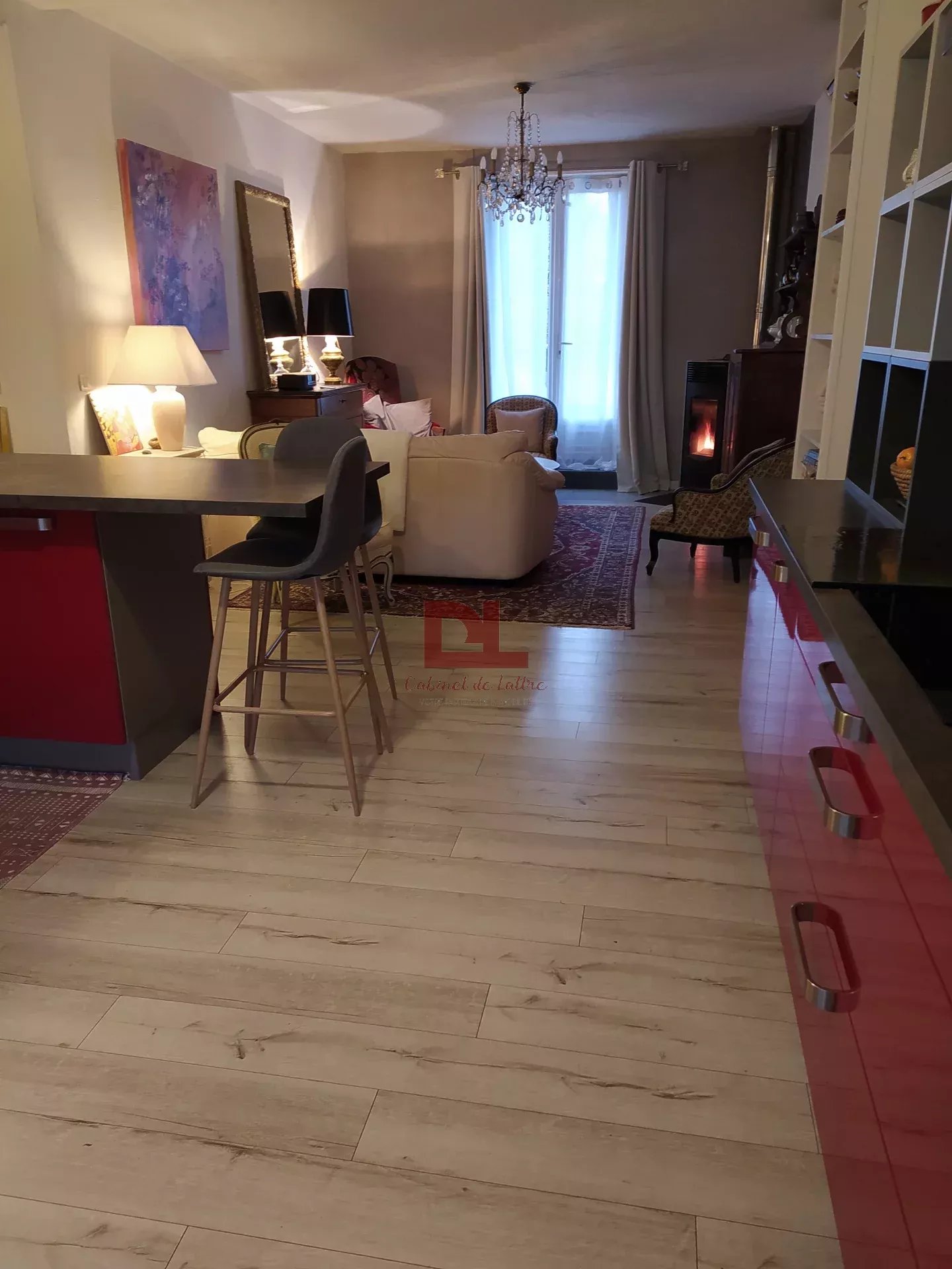 - R de CH de 116 m2 environ comportant un espace salle à manger/ cuisine aménagée de 32 m2 , un salon de 19m2 et son poêle à granules, accédant sur une terrasse à l'arrière.