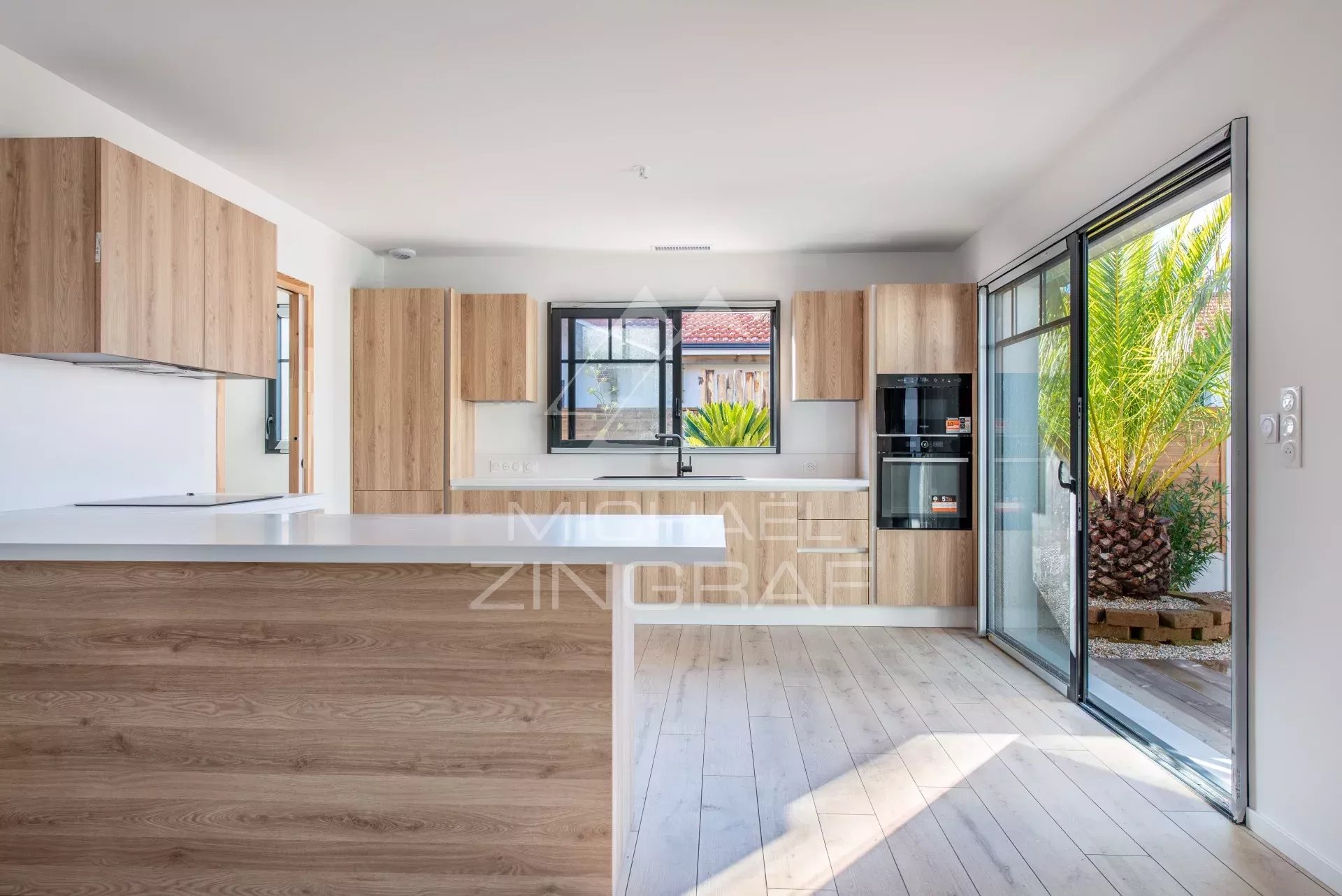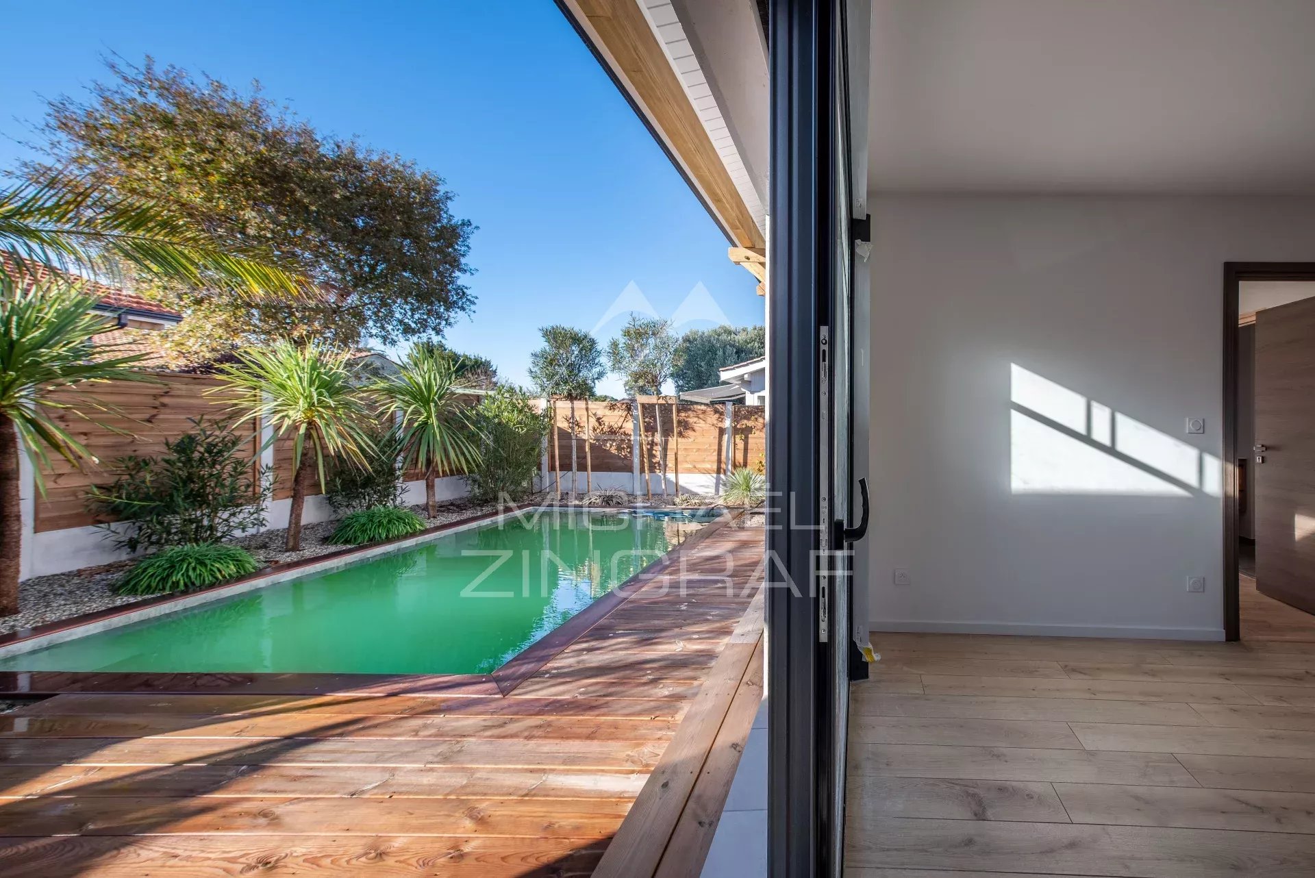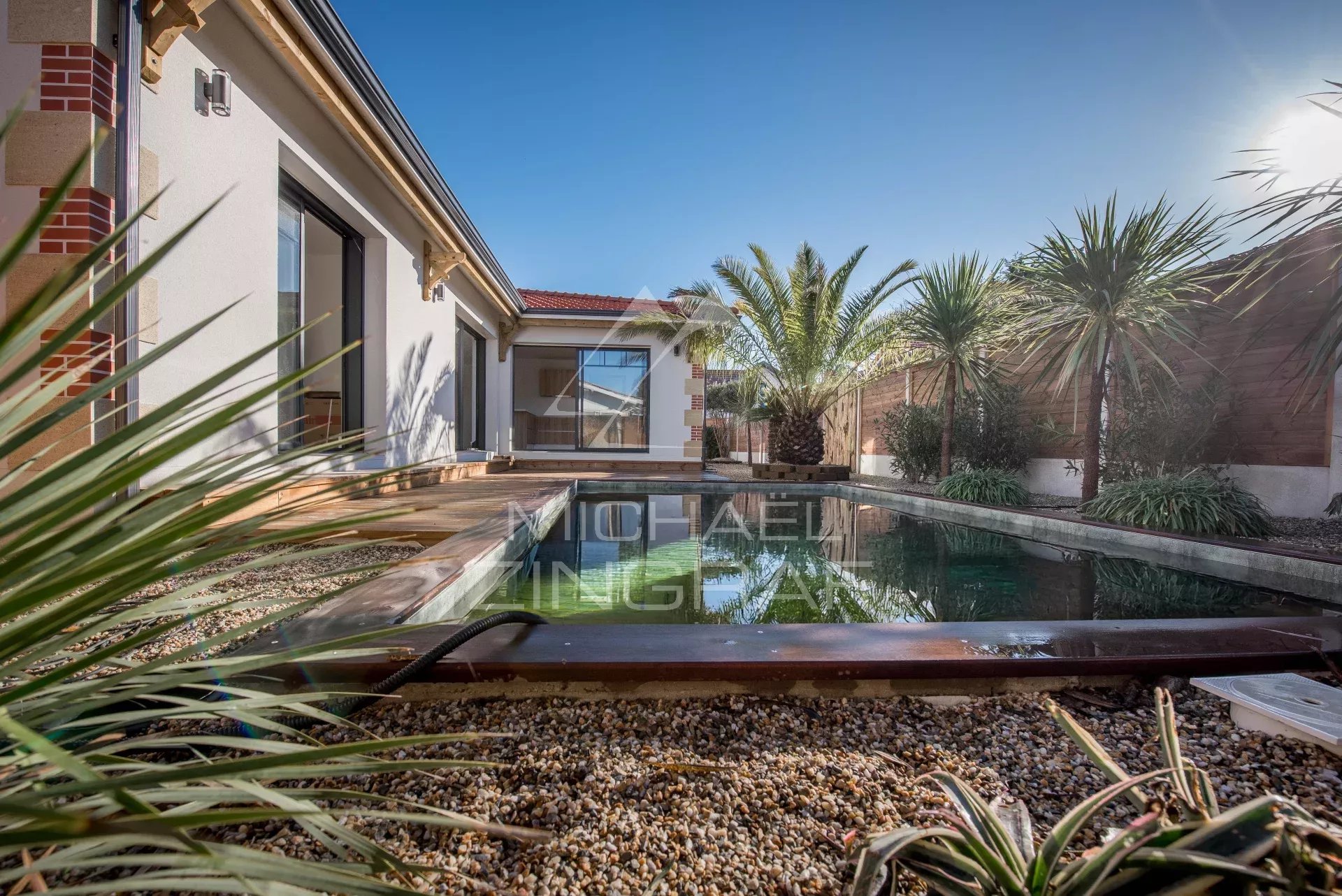 **À vendre : Villa d'exception à Gujan-Mestras - Quartier Meyran** Découvrez cette magnifique villa de plain-pied, récemment construite, nichée au cœur du quartier prisé de Meyran. Avec ses lignes contemporaines et ses prestations soignées, cette propriété est un véritable havre de paix. Profitez d'un espace de vie lumineux et chaleureux, idéal pour accueillir famille et amis. Composée de 4 chambres spacieuses, cette villa allie confort et élégance. Le jardin paysagé et la piscine invitent à la détente, tandis que la proximité du littoral et des commodités font de cet emplacement un choix de vie rêvé. Ne manquez pas cette opportunité unique d'acquérir votre coin de paradis à Gujan-Mestras !