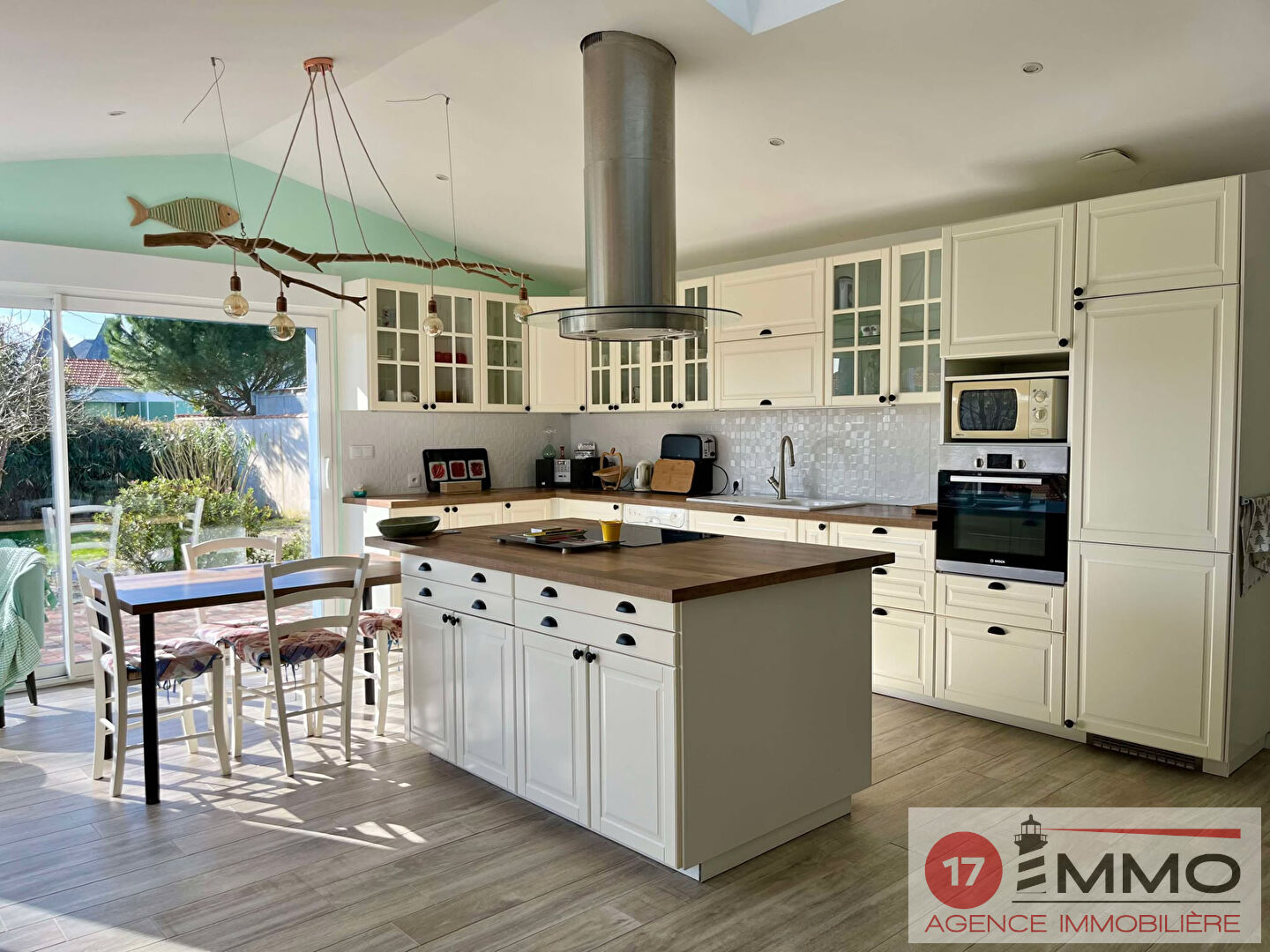 Grande maison familiale, de plain-pied, située à dix minutes du centre-ville de Châtelaillon et de sa plage. Vous trouverez 4 chambres, un bureau, 2 salles de bain, un grand séjour - cuisine de 60 m² orienté sud/ouest donnant sur le jardin paysagé de plus de 700 m². A l'extérieur, vous pourrez profiter d'un bel abri de jardin, d'une piscine hors sol et d'un garage traversant. Une extension et une rénovation ont été réalisées en 2017. Venez découvrir ce bien avec notre agence 17 IMMO pour avoir toutes les informations et précisions importantes avant une acquisition. (3.50 % honoraires TTC à la charge de l'acquéreur.)