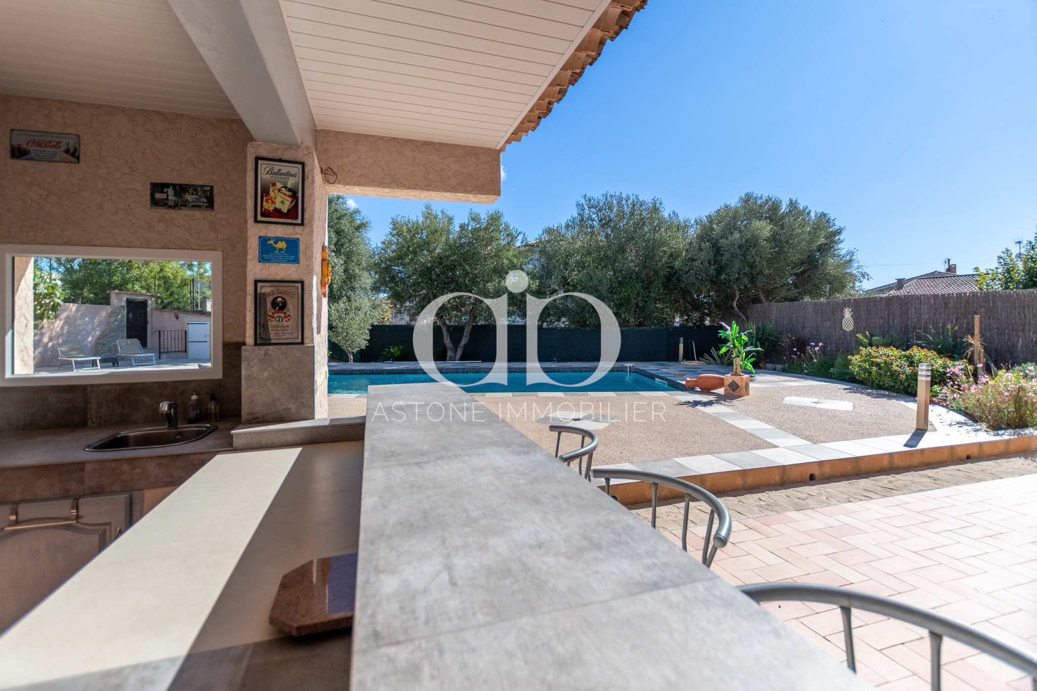 Dehors, à l'abri des regards, un très bel espace piscine avec autour un pool house avec four à pizza, une douche solaire. De l'autre côté de la maison, un jardin potager et un parking.