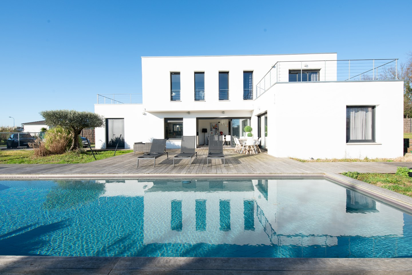 VENDU PAR NOS SOINS. Haut Bouliac, secteur très prisé, belle maison contemporaine baignée de lumière 170m2 de 2017 exposée SUD offrant: entrée, vestiaire, Wcet lave main, magnifique triple réception, cuisine US équipée, cellier-buanderie. A l'étage: palier dégagement, superbe suite parentale avec chambre, deux dressings, SDE douche italienne donnant sur terrasse privative avec vue dégagée. 3 chambres, SDE douche italienne, SDB et Wc indépendant. 2ème terrasse panoramique. Le tout sur un beau terrain clos de 2000m2 avec terrasses en bois, piscine 12X4 au sel, chauffée PAC et rideau de protection éléctrique. Parking plusieurs véhicules. Potentiel constructible 20%. Prestations: huisseries Alu, ballon thermodynamique, chauffage au sol, alarme, domotique..cadre résidentiel recherché, environnement paisible et verdoyant, proximité commerces, écoles et bus. 12mn Bordeaux centre et gare St Jean. Mandat délégué. Les informations sur les risques auxquels ce bien est exposé sont disponibles sur le site Géorisques (4.45 % honoraires TTC à la charge de l'acquéreur.)