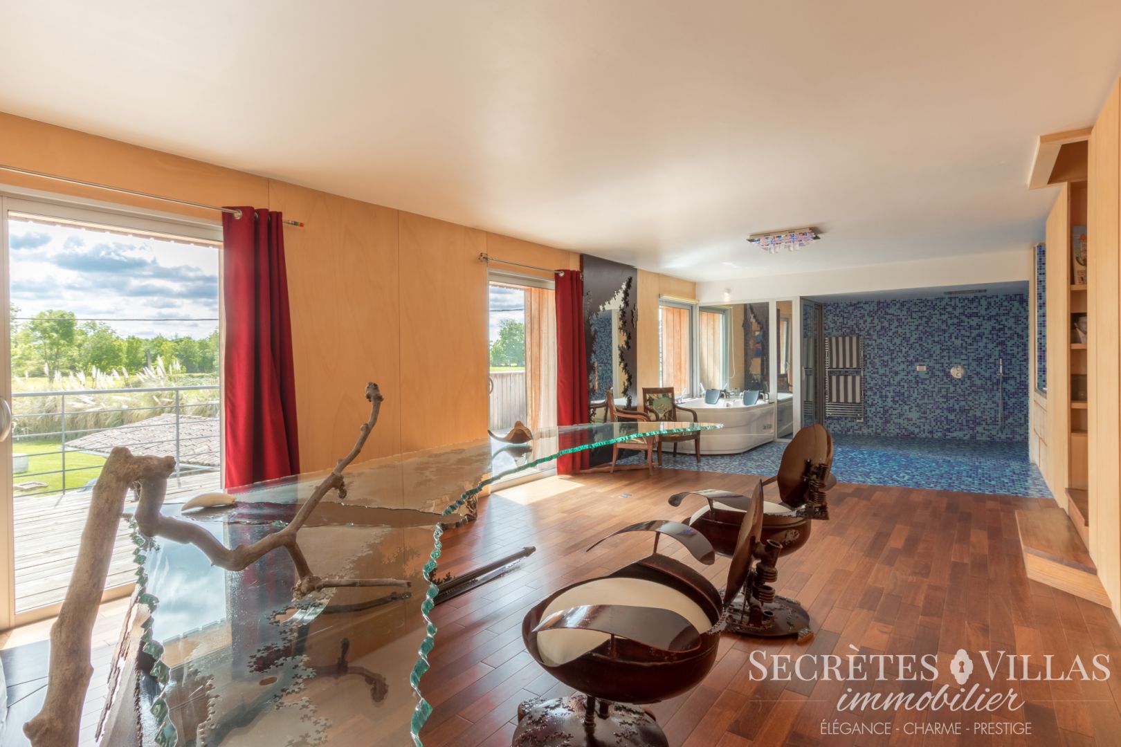 VENDU , dans commune recherchée rive gauche, 15mn Place de la Bourse Bordeaux, au calme en impasse dans environnement verdoyant préservé, SUPERBE PROPRIETE ATYPIQUE DE CHARME 340M2 VUE EXCEPTIONNELLE GARONNE vous offrant au rdc: entrée, magnifique pièce de réception 83m2 cheminée (possibilité grand bureau ou 5ème chambre), vaste espace cuisine équipée dinatoire 60m2 accès direct terrasse couverte, chaufferie, sde et Wc. A l'étage: palier dégagement, suite avec chambre et Sde/Wc, Suite parentale exceptionnelle 65m2 double exposition avec dressings réalisés sur mesure, vaste espace douche/bain balnéo et Wc accès direct terrasse baies à galandage vue dégagée imprenable sur Garonne et ensemble de la propriété. Suite balcon vue garonne plafond cathédrale 4m65 dressing équipé sur mesure et espace Sde grande douche italienne. 4ème chambre. Grenier 3 vélux plancher hourdi. Atelier. Local technique. Parking 3 véhicules. Carport 3 grandes places. Le tout sur un splendide terrain clos de 5560m2 en lisière de garonne vue imprenable!! avec arbres fruitiers, puit, récupérateur d'eau, et piscine 10X5 au sel nage contre courant et terrasse dallée en pierre. Prestations de charme et rénovation de qualité: murs et sols pierre pavés d'église, parquets anciens, parquets massifs, carreaux de ciment, poutres, hauteurs plafond, huisseries Alu double vitrage, chaudière Viessmann, assainissement individuel microstation, rénovation toiture et voies d'accès propriété,extension bardage bois, portail automatique.. Zone natura 2000 non constructible, CADRE DE VIE BUCCOLIQUE à proximité de toutes commodités: 5mn gare pour bordeaux St Jean, 2 mn commerces et centre bourg, 15mn collège à pied. Son environnement, sa situation, son charme, son atypicité font de cette propriété un bien introuvable sur le secteur!! (4.55 % honoraires TTC à la charge de l'acquéreur.)