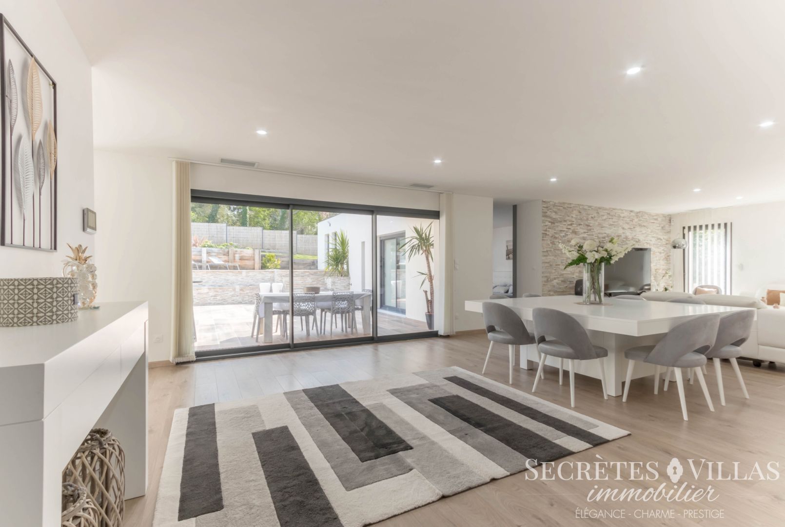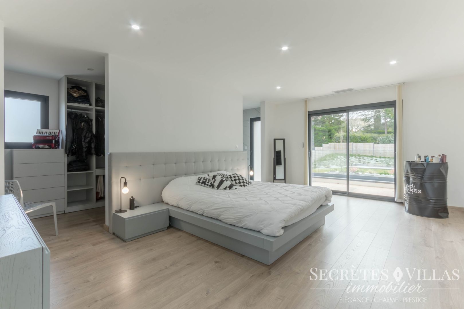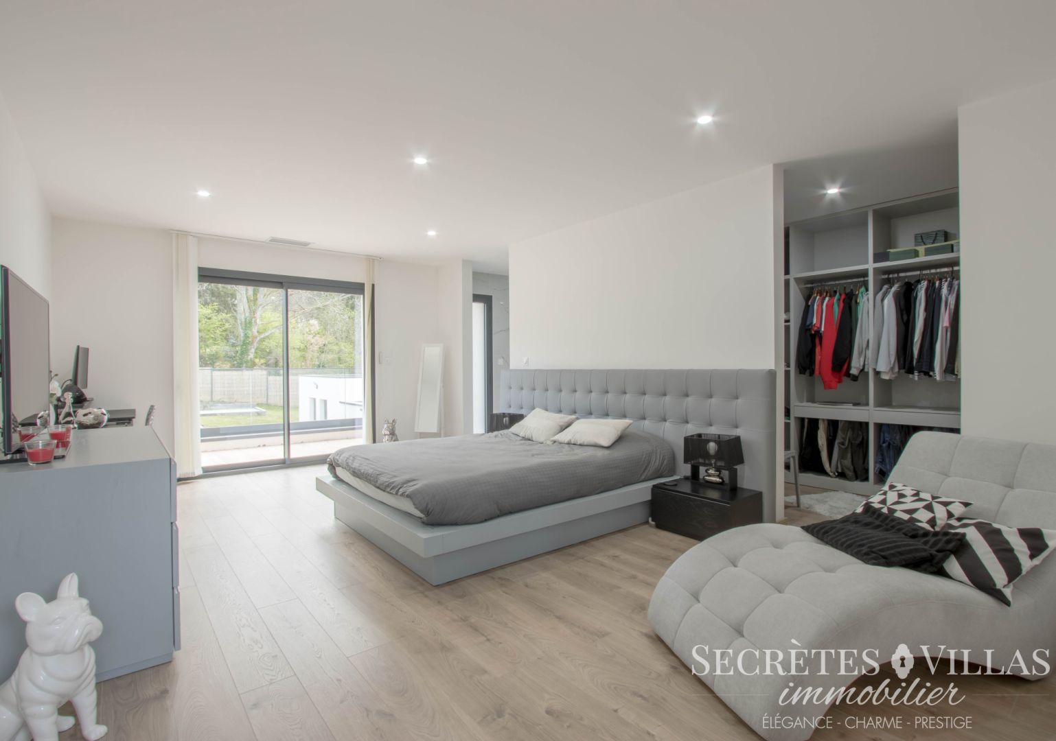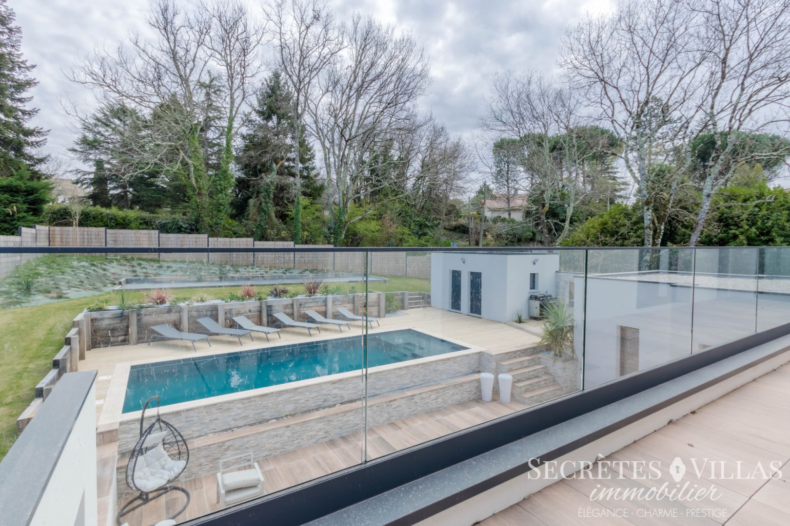 SOUS COMPROMIS.HAUT LATRESNE, SPLENDIDE VILLA CONTEMPORAINE 277M2, année 2021, ETAT NEUF vous offrant au rdc: Entrée, dégagement vestiaire, WC et lave mains, vaste pièce de réception 70m2, superbe cuisine ouverte équipée haut de gamme et plan de travail en granit 25m2, cellier buanderie, jolie suite parentale: chambre, deux dressings et très belle SDB/douche italienne grand bac à douche et WC. A l'étage: palier dégagement, 3 grandes suites accès terrasse vue piscine: chambres, dressings et Sde douches italiennes. 5ème chambre ou bureau. WC. 3 terrasses dont une partie couverte. Garage double carrelé et isolé. Parking pavé granit 110m2 nombreux véhicules. Le tout sur un terrain clos de 1100m2 avec piscine 9X3,5 chauffée pompe à chaleur, local technique, pool house avec douche eau chaude, WC et lave main. Boulodrome. Ensemble état neuf, entretenu et très soigné. Volume et luminosité. Construction et prestations haut de gamme: Fondations 1m30 sur vide sanitaire total, parpaing et briques, murs en briquette claires, drains, chauffage clim réversible pompe à chaleur gainé, huisseries alu double vitrage, fenêtres oscillobattantes, ballon thermodynamique,aspiration centralisée, dressings réalisés sur mesure, alarme, volets centralisés, domotique, portail et porte de garage électriques....Commerces. Ecoles et collège. Bus pour lycée Bordeaux. 10mn gare St Jean et Bordeaux centre. TRES BEAU PRODUIT!! (3.04 % honoraires TTC à la charge de l'acquéreur.)