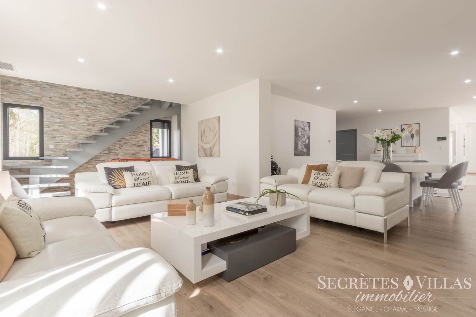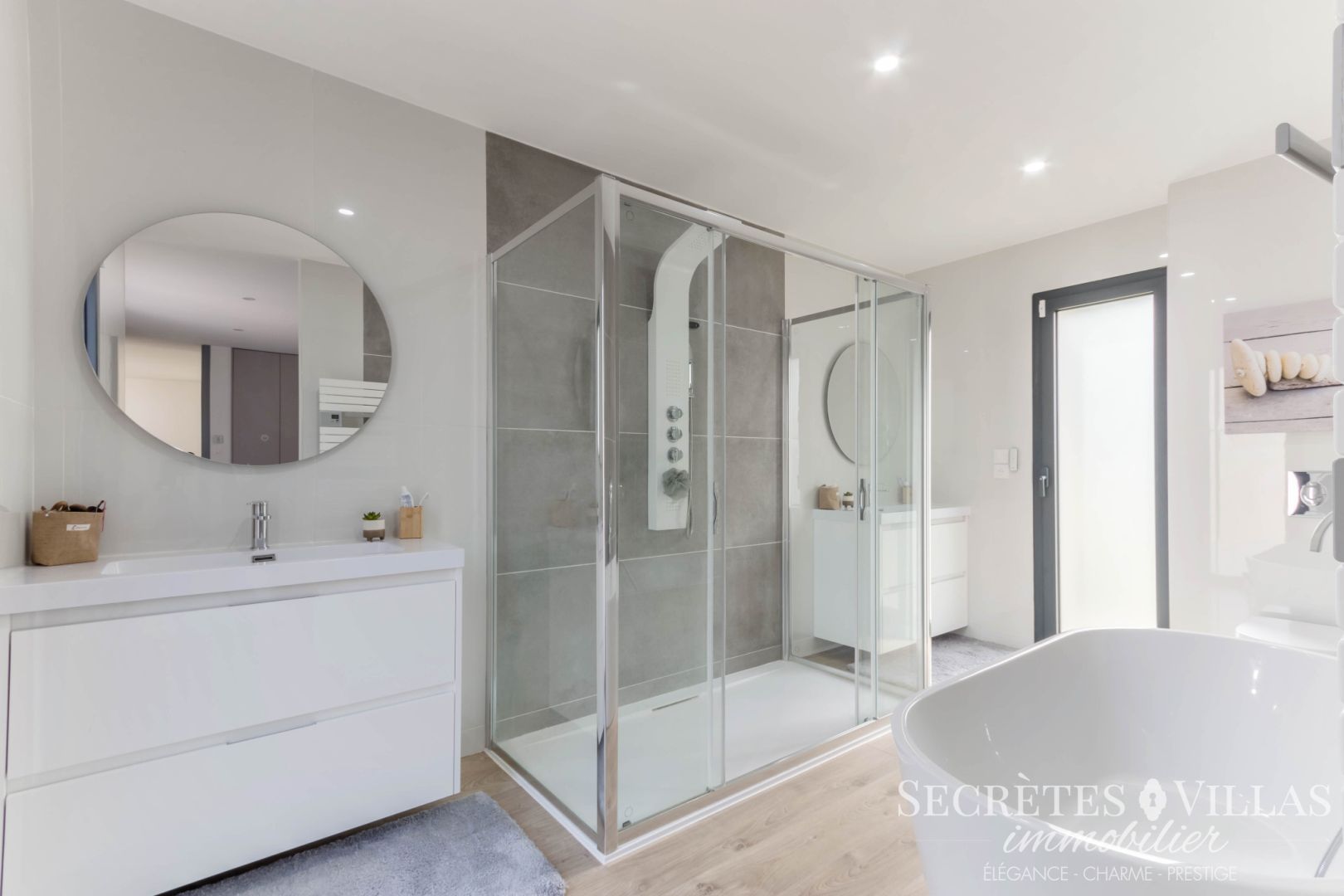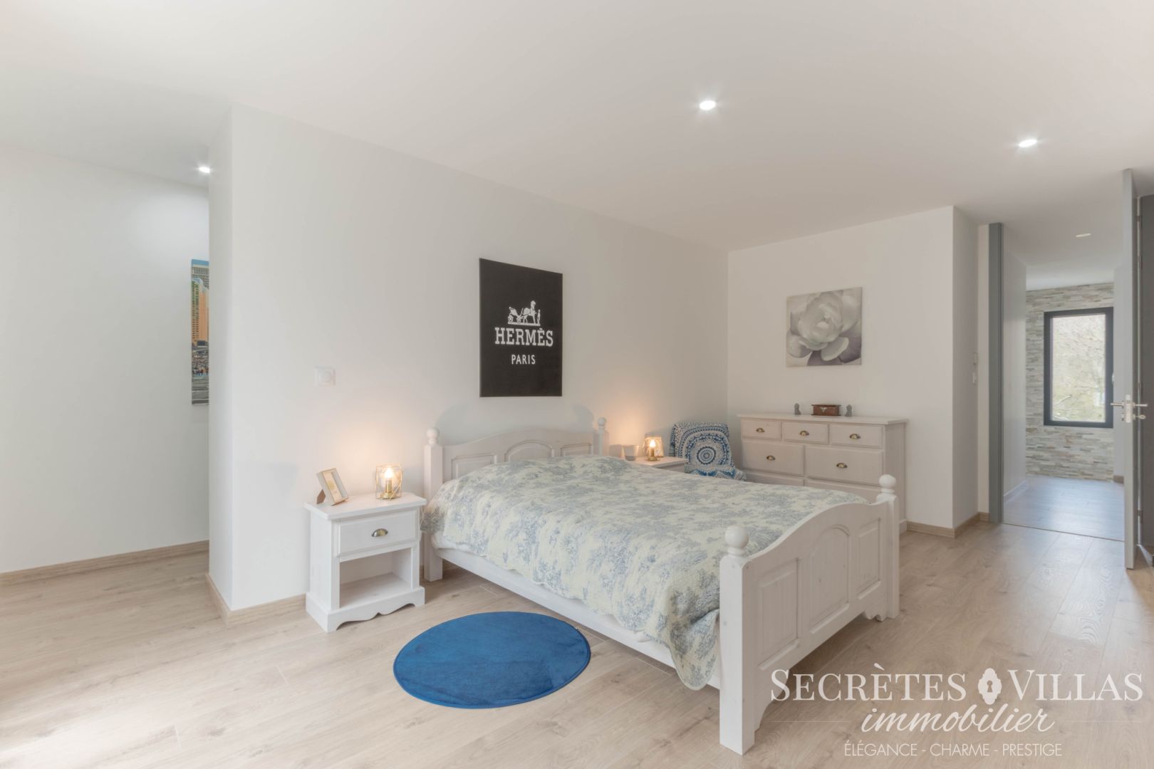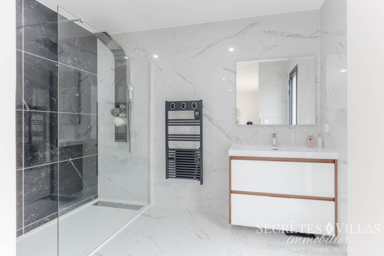 SOUS COMPROMIS.HAUT LATRESNE, SPLENDIDE VILLA CONTEMPORAINE 277M2, année 2021, ETAT NEUF vous offrant au rdc: Entrée, dégagement vestiaire, WC et lave mains, vaste pièce de réception 70m2, superbe cuisine ouverte équipée haut de gamme et plan de travail en granit 25m2, cellier buanderie, jolie suite parentale: chambre, deux dressings et très belle SDB/douche italienne grand bac à douche et WC. A l'étage: palier dégagement, 3 grandes suites accès terrasse vue piscine: chambres, dressings et Sde douches italiennes. 5ème chambre ou bureau. WC. 3 terrasses dont une partie couverte. Garage double carrelé et isolé. Parking pavé granit 110m2 nombreux véhicules. Le tout sur un terrain clos de 1100m2 avec piscine 9X3,5 chauffée pompe à chaleur, local technique, pool house avec douche eau chaude, WC et lave main. Boulodrome. Ensemble état neuf, entretenu et très soigné. Volume et luminosité. Construction et prestations haut de gamme: Fondations 1m30 sur vide sanitaire total, parpaing et briques, murs en briquette claires, drains, chauffage clim réversible pompe à chaleur gainé, huisseries alu double vitrage, fenêtres oscillobattantes, ballon thermodynamique,aspiration centralisée, dressings réalisés sur mesure, alarme, volets centralisés, domotique, portail et porte de garage électriques....Commerces. Ecoles et collège. Bus pour lycée Bordeaux. 10mn gare St Jean et Bordeaux centre. TRES BEAU PRODUIT!! (3.04 % honoraires TTC à la charge de l'acquéreur.)