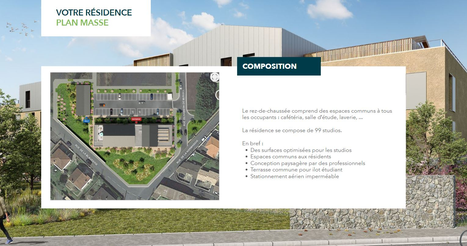 NIORT quartier de la Blauderie, au calme, avec bus au pied de la résidence, T1 pour étudiants et jeunes actifs dans résidence neuve, tout équipé, parkings, espaces communs laverie, cafétéria, terrasse et zones d'études.