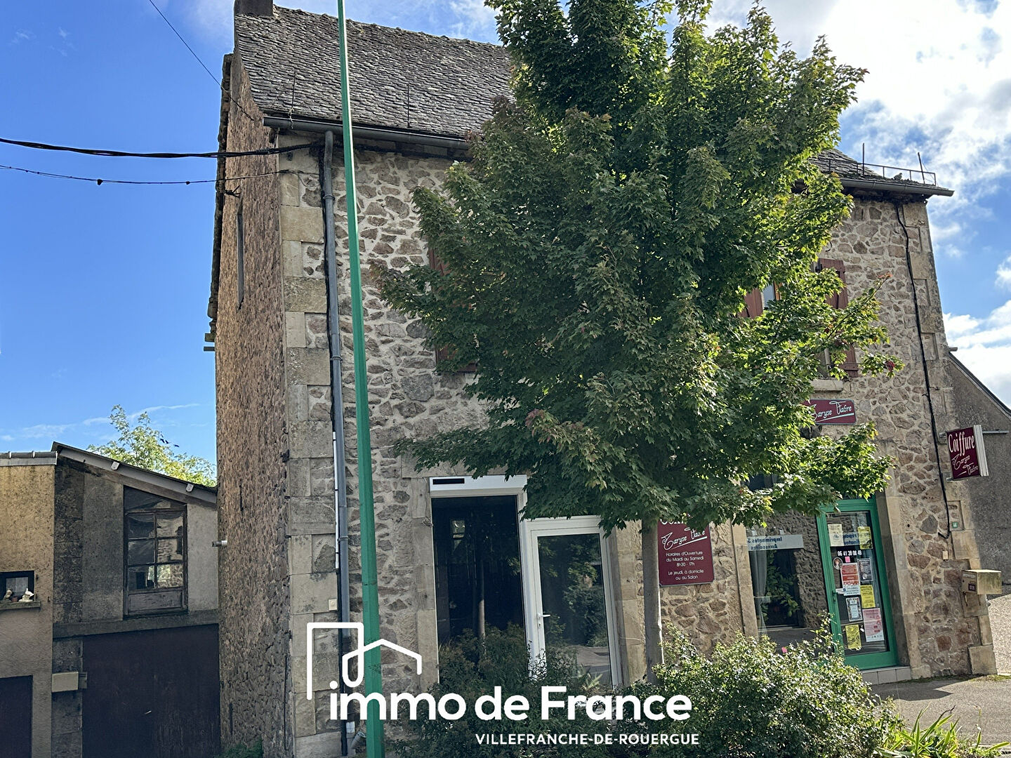 Ensemble immobilier en pierre comprenant une maison de Type 3 avec grange et jardin et un local commercial loué avec appartement T2, terrasse et jardin. La maison comprend en rez de chaussée (ancien café restaurant ) un séjour / cuisine de 36 m² (2 espaces séparés par un meuble), 2 chambres et salle d'eau à l'étage et au second des combles aménageables de 50 m² environ. Chauffage central gaz propane. Grange attenante de 33 m² au sol avec garage en rez de chaussée, possibilité de relier la grange à la maison... Local commercial actuellement loué de 27 m² avec en arrière boutique des toilettes et une cuisine de 10 m² ouvrant sur une terrasse et le jardin. A l'étage présence d'une chambre de 15 m² et d'une salle d'eau de 6 m². Maison lumineuse dotée d'un agréable jardin en plein village sans vis à vis, réel potentiel d'extension sur la grange, au coeur d'un village tous commerces toutes les commodités, école, pharmacie et professionnels de santé. (7.00 % honoraires TTC à la charge de l'acquéreur.) Jérôme PONS (EI) Agent Commercial - Numéro RSAC : 483910717 - RODEZ.