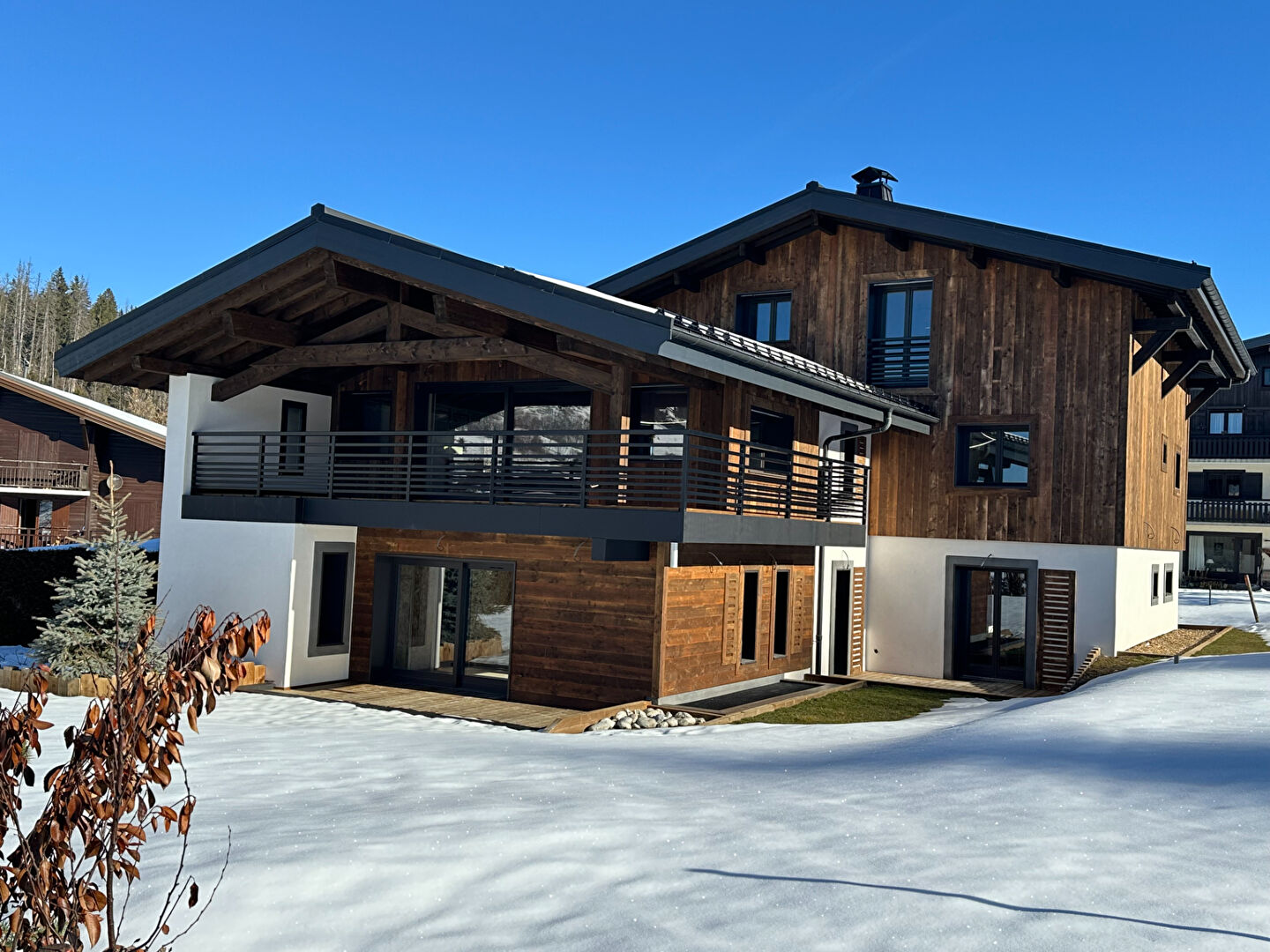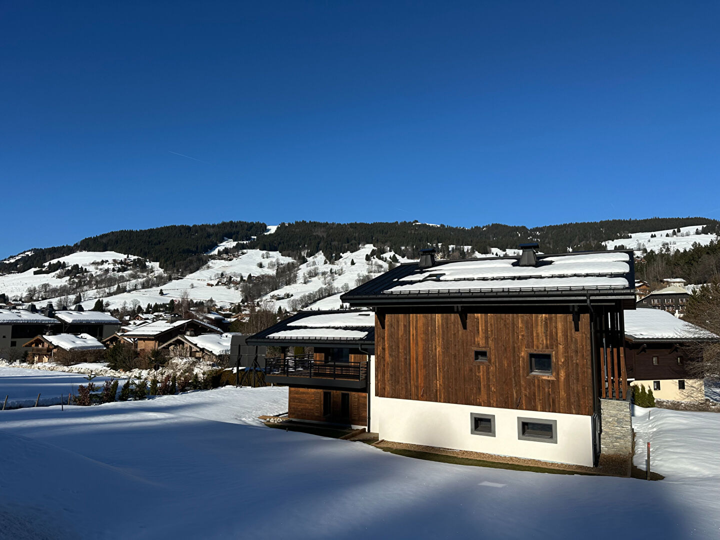 MEGEVE, CHALET NEUF de standing CONSTRUIT à la vente (FRAIS NOTARIES REDUITS - TVA RECUPERABLE), dit chalet A d'une surface de 350 m² plus 2 garages (40 m²) soit 390 m² utiles sur sa parcelle de terrain de 790 m², situé à 1,4 km du coeur du village, du télécabine de la Princesse et du Jaillet. Il offre en rez-de-jardin, un vaste hall d'entrée, une grande chambre principale avec sa salle de bains et son dressing (39 m²) donnant sur une terrasse de 17 m² et jardin, une chambre avec salle de bains et dressing, deux garages ; à l'étage, cuisine équipée avec son coin bar ouvrant sur la salle à manger (avec son balcon) et le salon avec sa cheminée (sous charpente apparente), l'ensemble de cet espace de vie représentant env 90 m² ouvrant sur une terrasse couverte de 30 m², une chambre avec dressing et salle de bains ; dans l'étage sous-toiture, deux chambres avec chacune une salle de bains et un dressing. Sous-sol avec espace SPA et détente (65 m²) . VENTE AVEC AMENAGEMENTS ,MOBILIERS INTERIEURS, ET FINITIONS NON REALISES.
