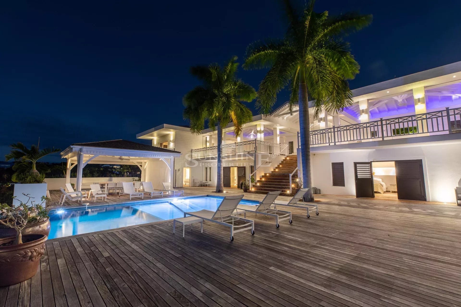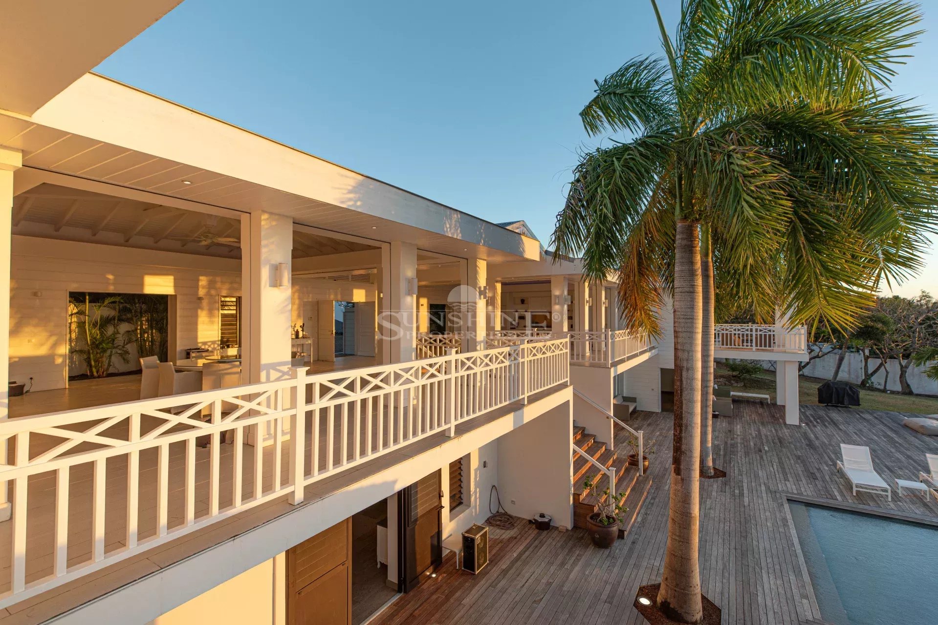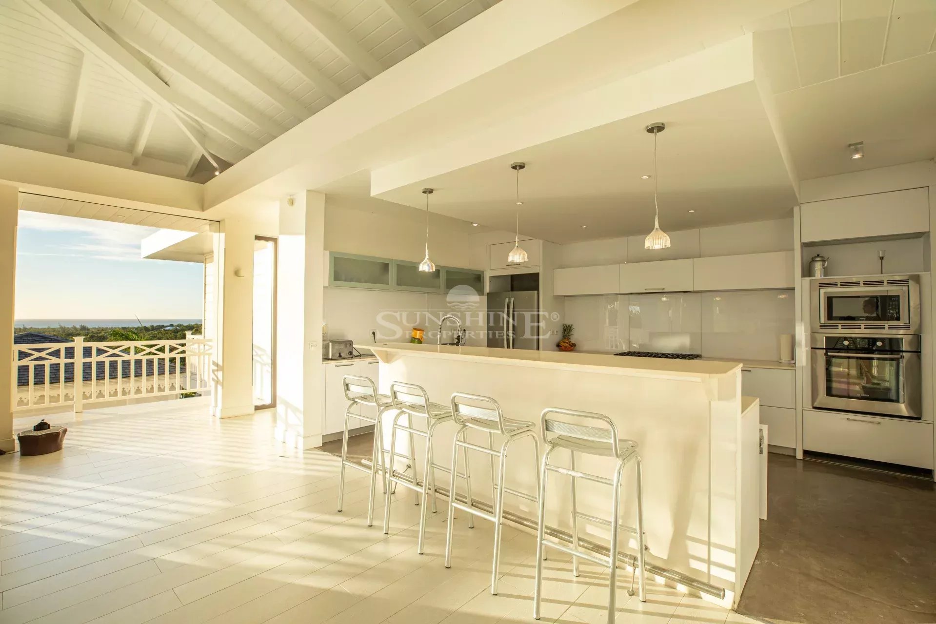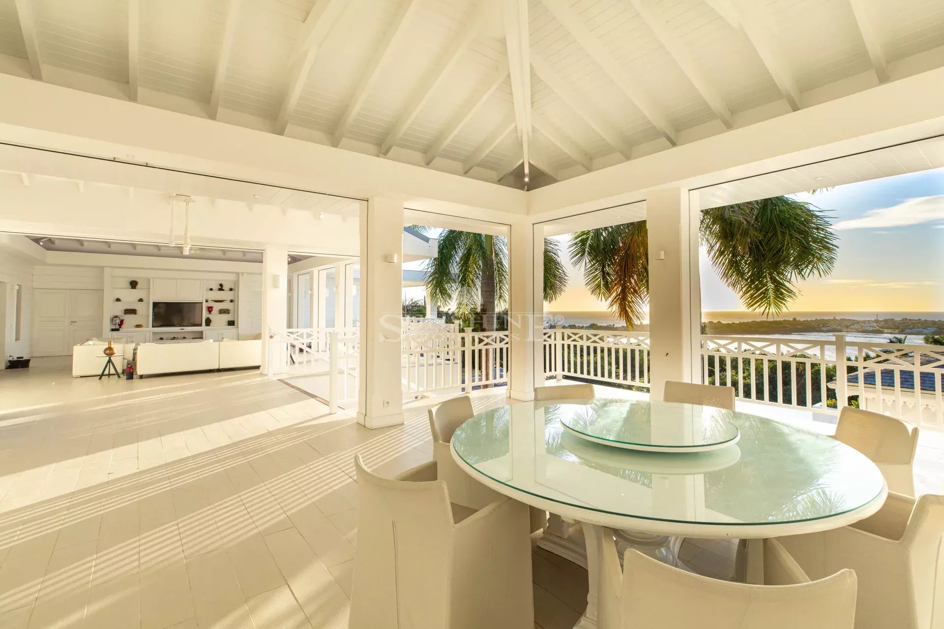 Elle est protégée 24 heures sur 24 et située dans la communauté luxueuse et recherchée des Terres Basses. Elle offre une vue panoramique splendide de 270 degrés s'étendant jusqu'à l'horizon de la mer des Caraïbes. Elle est entourée de magnifiques jardins luxuriants et d'arbres fruitiers tropicaux. Cette luxueuse propriété comprend 6 chambres et 6 salles de bains. La villa jouit d'une vue magnifique sur le coucher de soleil, complétée par des espaces intérieurs et extérieurs spacieux et ouverts. Le salon et la salle à manger sont ouverts et profitent pleinement des hauts plafonds, des murs de la galerie et des immenses portes conçues pour résister aux ouragans. Vous serez ravis de recevoir vos invités dans cette fabuleuse maison à plusieurs niveaux, tout en profitant des vues panoramiques changeantes à chaque coucher de soleil, dans une élégance et une quiétude splendides. Cette villa bénéficie d'une architecture moderne, chic et caribéenne, avec toutes les commodités modernes. Elle est située sur une légère pente sur 2,4 hectares, soit 24 000 m^(2). Veuillez nous contacter pour obtenir de plus amples informations. Veuillez noter que le prix de vente est exprimé en euros.
