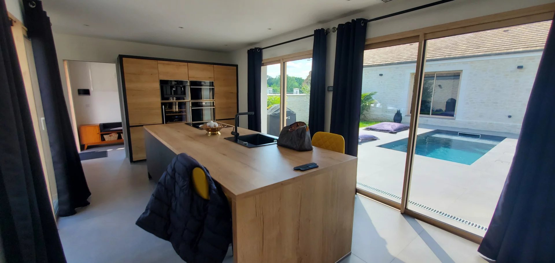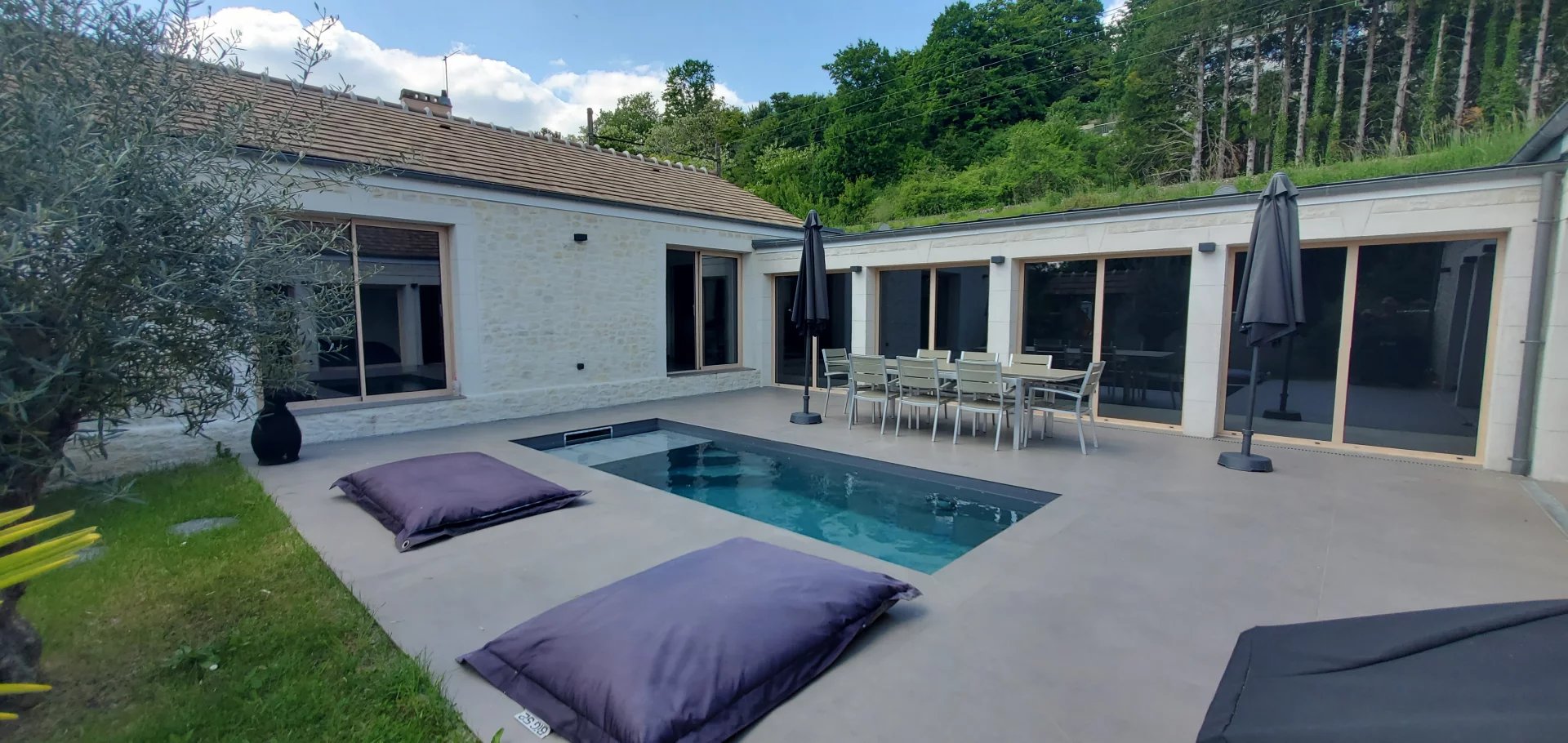 MAISON DE PLAIN-PIED récente, en bord de Seine, à l'abri des regards avec piscine, terrasse et berge privative alliant confort et matériaux de qualité. La maison propose des volumes et une lumière traversante dans les pièces à vivre et offre un hall d'entrée avec cabinet de toilettes et vestiaire, une cuisine haut de gamme avec ilot central, un vaste salon/salle à manger et espace bureau de près de 60 m² qui profite de la vue sur un patio avec terrasse et piscine chauffée et sécurisée. La partie nuit accessible depuis une couloir propose 3 chambres avec dressing, une salle d'eau (douche italienne) et un wc séparé. Berge privative Un double garage avec espace buanderie 3 stationnements dans la cour pavée 2 portails motorisés Pompe à chaleur et ballon thermodynamique Propriété rare sur le secteur !