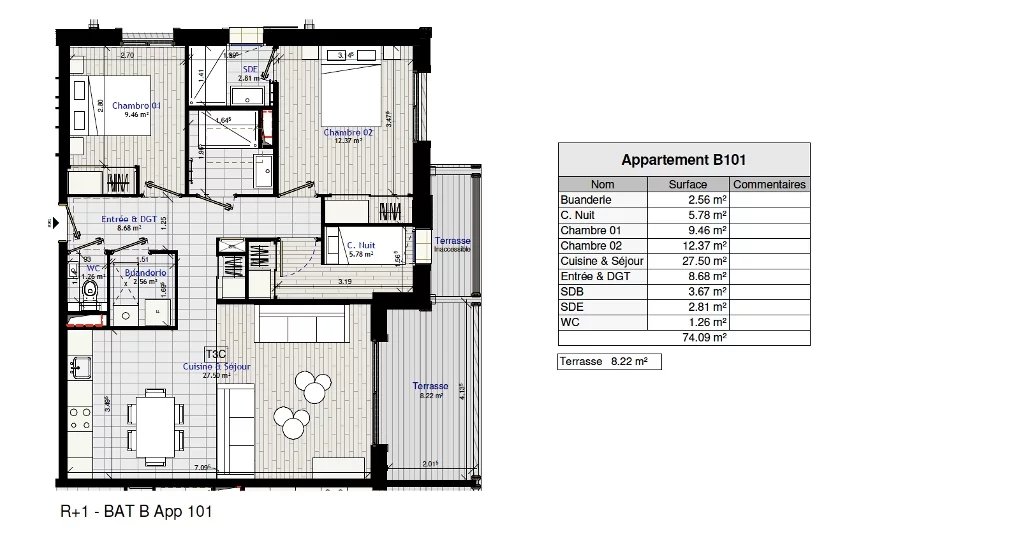 T3 de 74 m² au 1er étage d’une résidence haut de gamme RE2020, avec pièce à vivre lumineuse d’environ 28 m², cuisine équipée, balcon Sud-Est, 2 chambres dont une suite parentale et un coin montagne fermé, buanderie, salle de douche et WC séparés. Cave, local à skis, garage possible. Capacité d'accueil 8 personnes. Finitions personnalisables (carrelage, faïence, parquet) pour un intérieur à votre image. Livraison maîtrisée, frais de notaire réduits en VEFA. Idéal résidence principale, secondaire ou investissement dans la Vallée du Giffre.