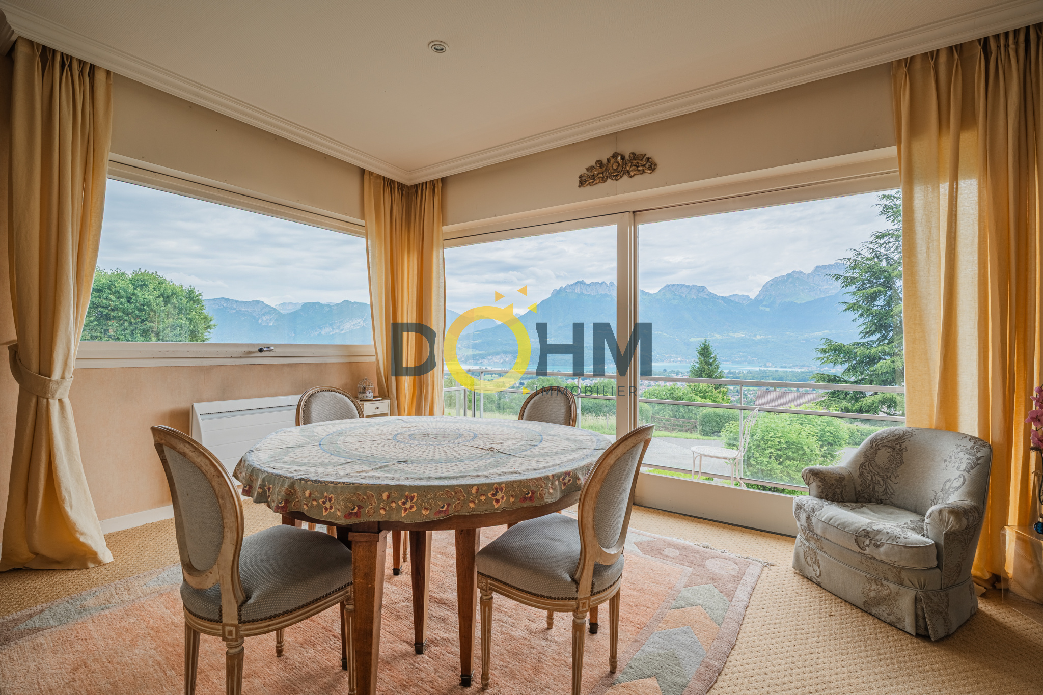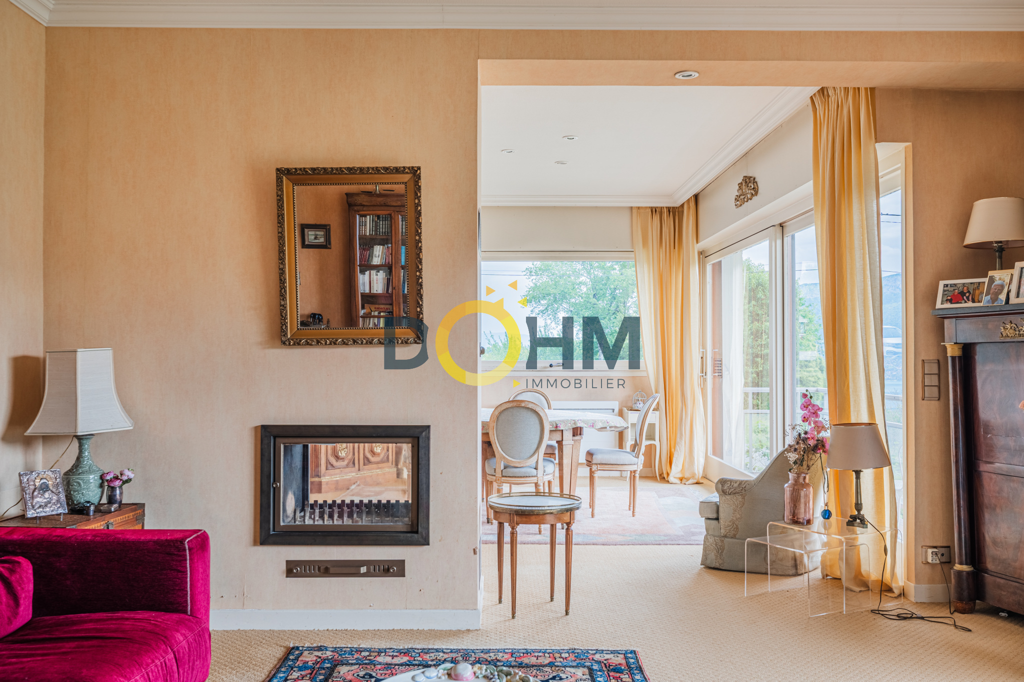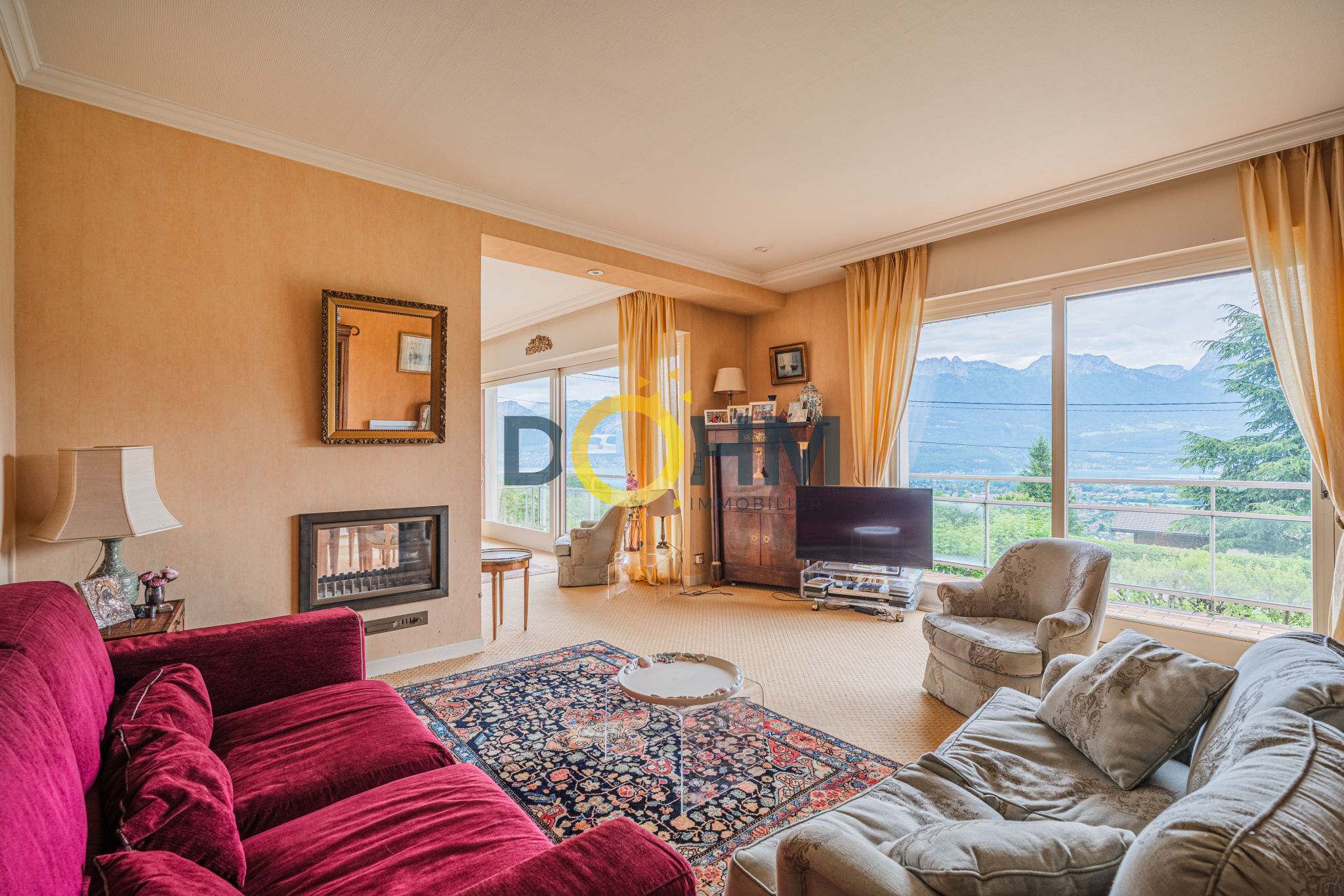 Dohm Immobilier Annecy vend en exclusivité et rare sur le marché actuel un grand appartement T4 de 107m2 avec une belle vue dégagée sur le lac d'Annecy double exposition. Cet appartement est composé d'une entrée avec placard qui dessert soit un couloir vers l'espace chambres et sdb soit le grand salon/ salle à manger qui font plus de 45m2. Ces 2 pièces sont réunies pour faire un bel espace de vie donnant sur un balcon et profiter de la vue sur le lac et les montagnes. Exposition Est. Ce grand espace profite également d'une cheminée double foyer qui sépare les 2 pièces. L'appartement dispose d'une salle de bain double lavabo avec une douche, un WC, 2 grandes chambres avec placards et une véranda arrière qui sert de débarras bien utile ainsi qu'une grande cave au sous sol. Il est situé sur un petit immeuble de 1963 composé en tout de 15 lots principaux (appartements) et se trouve au RDC de cet immeuble qui fait 3 étages. Une décoration restée dans son état d'origine, avec un vrai potentiel de personnalisation. Classe énergétique E. Sa particularité par rapport au reste de l'immeuble est un chauffage individuel avec des convecteurs électriques récents. Par conséquent les charges de copropriété de 450EUR/ trimestre incluent l'eau chaude et les autres postes de dépenses mais non le chauffage. Vous ne serez donc pas tributaires d'un changement de chaudière inévitable prochainement dans ce type d'immeuble de cette décennie. Point d'attention: les 2 dernières photos de cette annonce sont des photos Home Staging pour vous aider à vous projeter sur l'appartement décoré et revu selon d'autres styles d'intérieur.