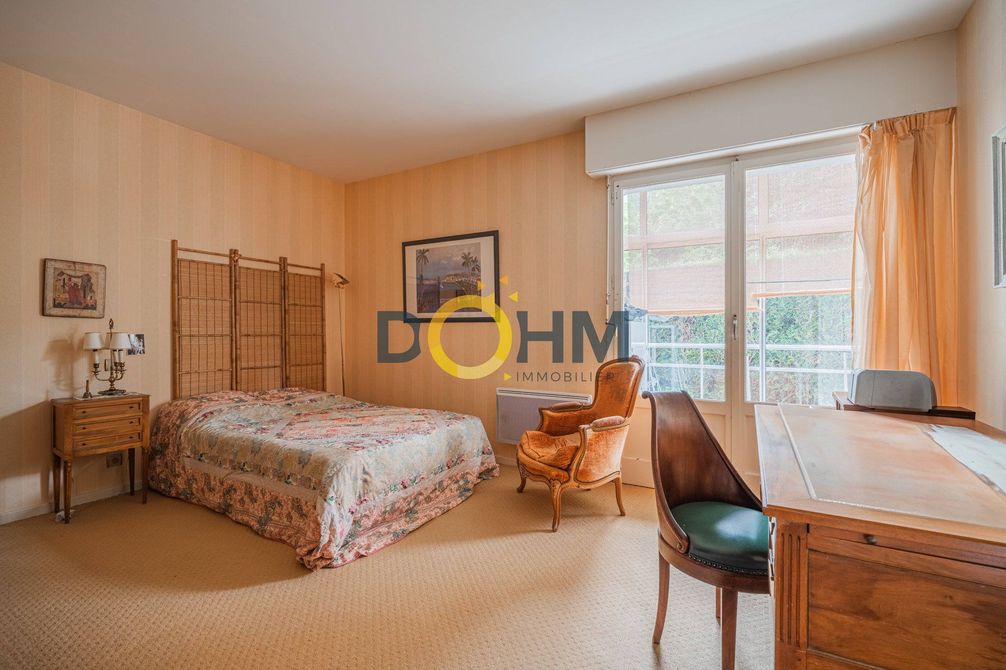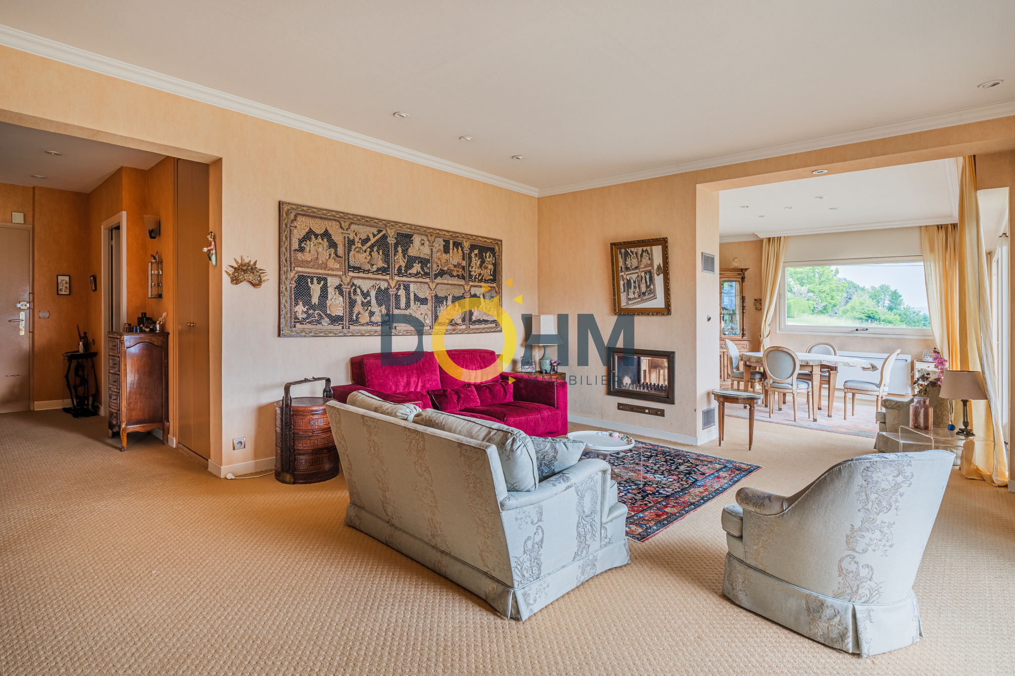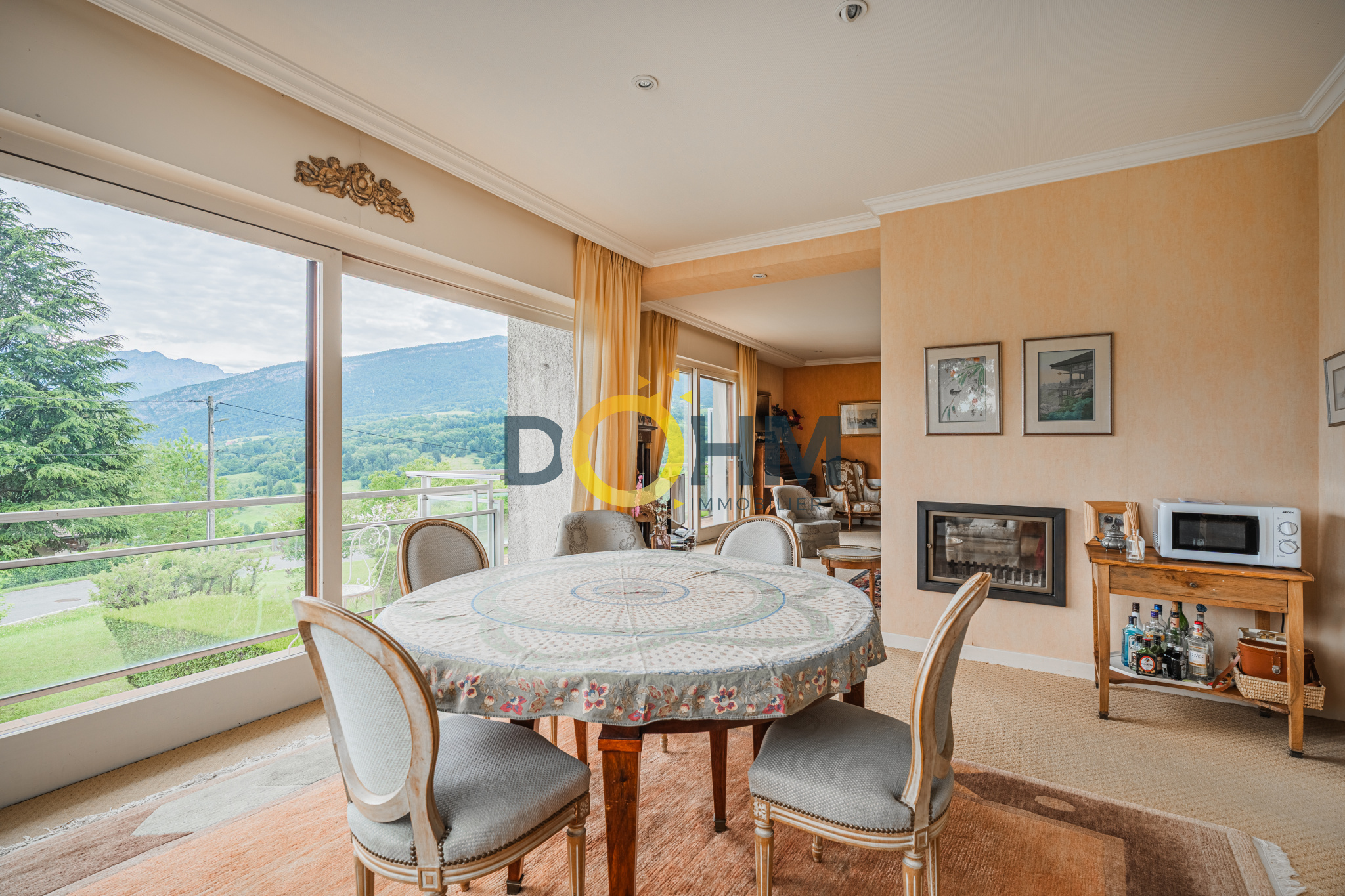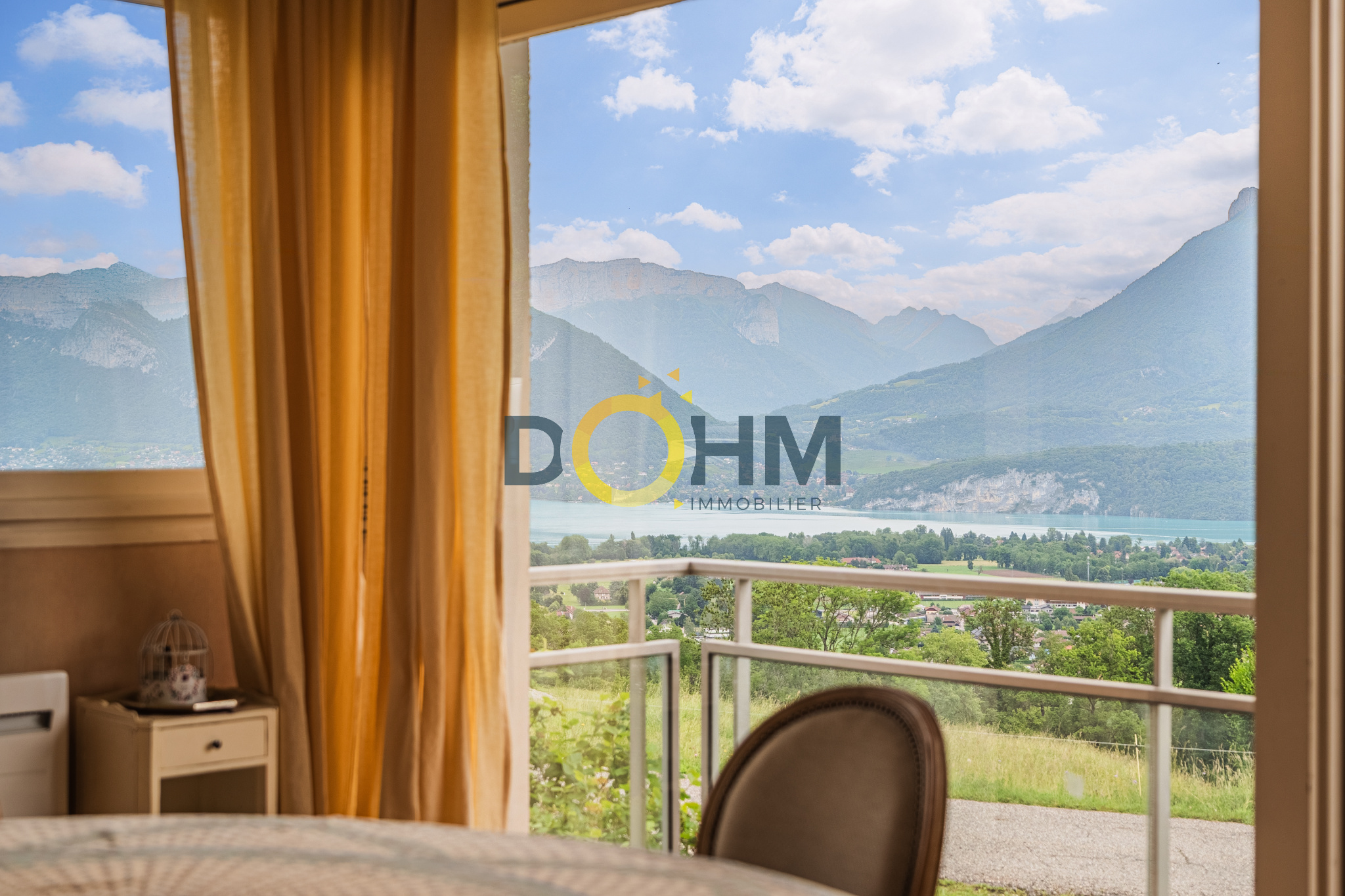 Dohm Immobilier Annecy vend en exclusivité et rare sur le marché actuel un grand appartement T4 de 107m2 avec une belle vue dégagée sur le lac d'Annecy double exposition. Cet appartement est composé d'une entrée avec placard qui dessert soit un couloir vers l'espace chambres et sdb soit le grand salon/ salle à manger qui font plus de 45m2. Ces 2 pièces sont réunies pour faire un bel espace de vie donnant sur un balcon et profiter de la vue sur le lac et les montagnes. Exposition Est. Ce grand espace profite également d'une cheminée double foyer qui sépare les 2 pièces. L'appartement dispose d'une salle de bain double lavabo avec une douche, un WC, 2 grandes chambres avec placards et une véranda arrière qui sert de débarras bien utile ainsi qu'une grande cave au sous sol. Il est situé sur un petit immeuble de 1963 composé en tout de 15 lots principaux (appartements) et se trouve au RDC de cet immeuble qui fait 3 étages. Une décoration restée dans son état d'origine, avec un vrai potentiel de personnalisation. Classe énergétique E. Sa particularité par rapport au reste de l'immeuble est un chauffage individuel avec des convecteurs électriques récents. Par conséquent les charges de copropriété de 450EUR/ trimestre incluent l'eau chaude et les autres postes de dépenses mais non le chauffage. Vous ne serez donc pas tributaires d'un changement de chaudière inévitable prochainement dans ce type d'immeuble de cette décennie. Point d'attention: les 2 dernières photos de cette annonce sont des photos Home Staging pour vous aider à vous projeter sur l'appartement décoré et revu selon d'autres styles d'intérieur.