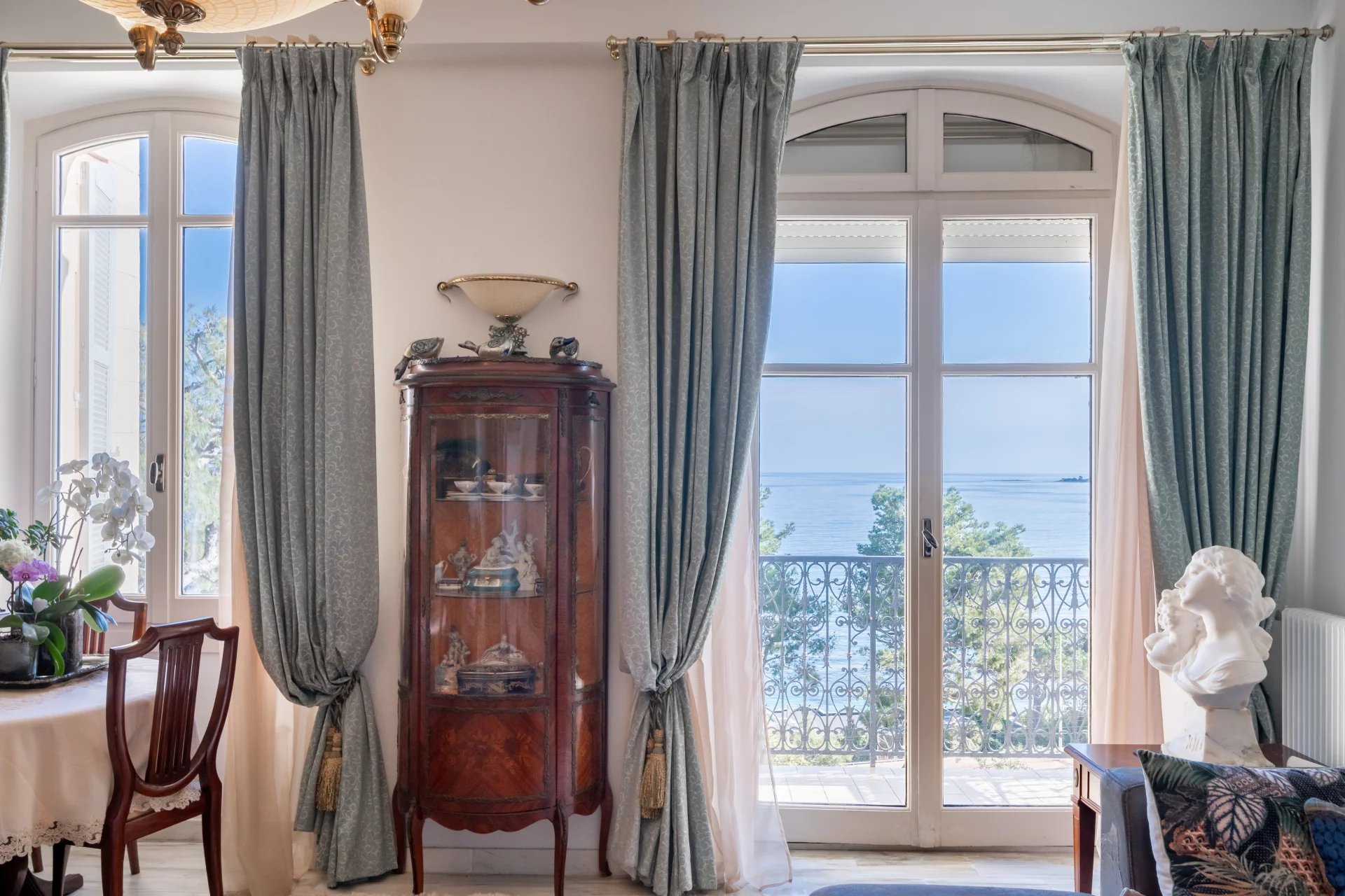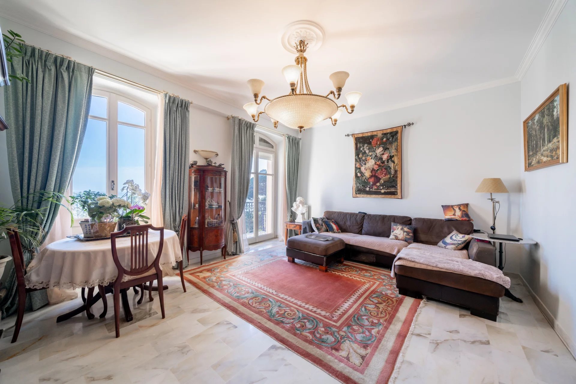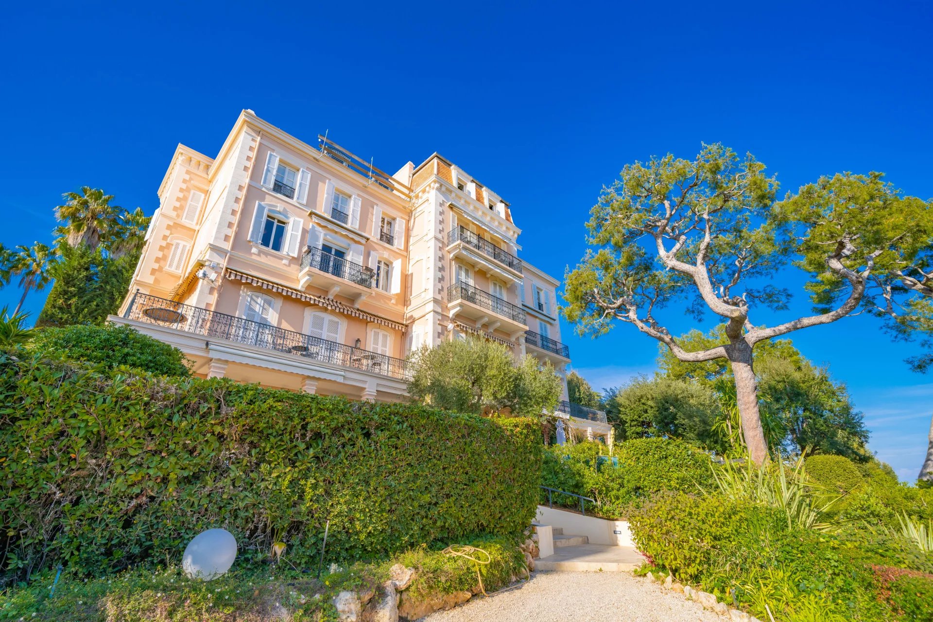Dans une résidence fermée un beau palais d'époque, appartement d'exception style 'bourgeois' de 3 pièces avec la vue mer magnifique. Belles prestations: Hall avec rangements, 1 séjour/ salle à manger, 1 cuisine équipée, 1 chambre en suite avec salle de bain et dressing, 1 chambre avec les placards et 1 salle d’eau. Une jolie parc bien entretenu par le jardinier. Une grande place de parking pour une voiture et un deux roues. Et une cave. Copropriété fermée et bien entretenue. Ascenseur.