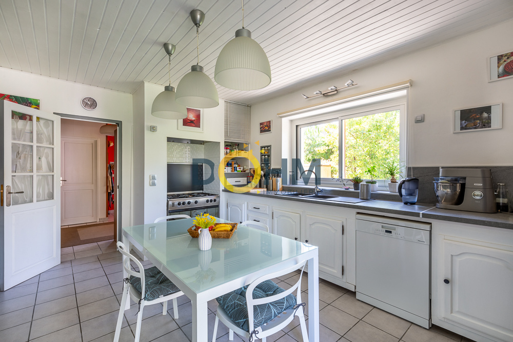 Cette maison est composée d'une grande et lumineuse cuisine équipée ouverte sur terrasse et parc, un séjour de 50m2 avec poêle à bois, une chambre au rez de chaussé, salle de bain