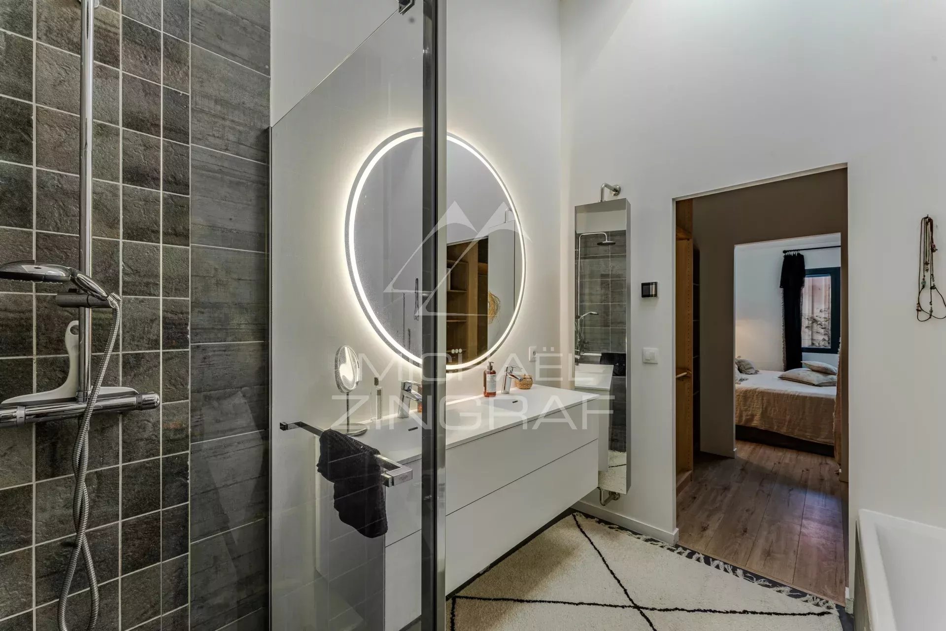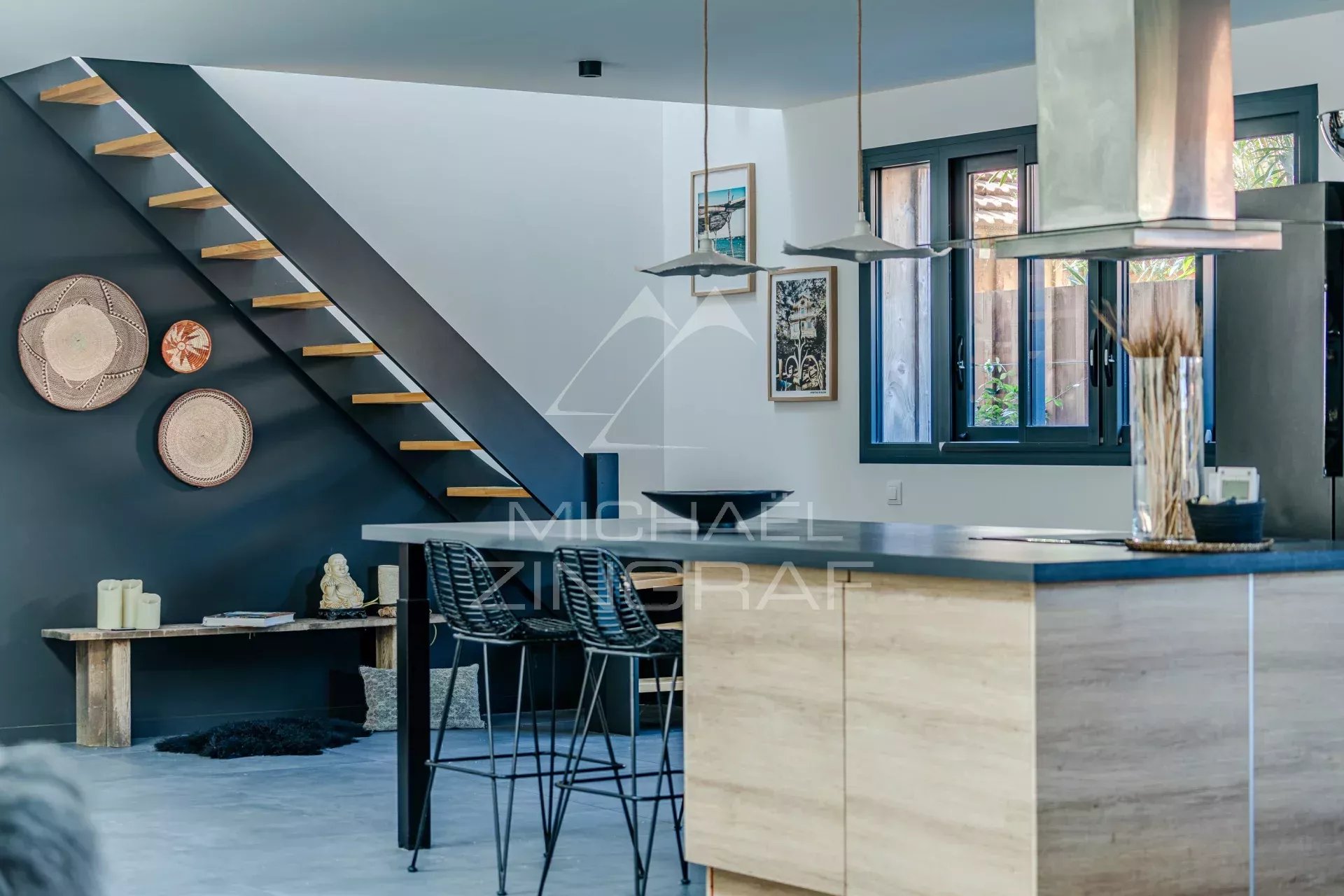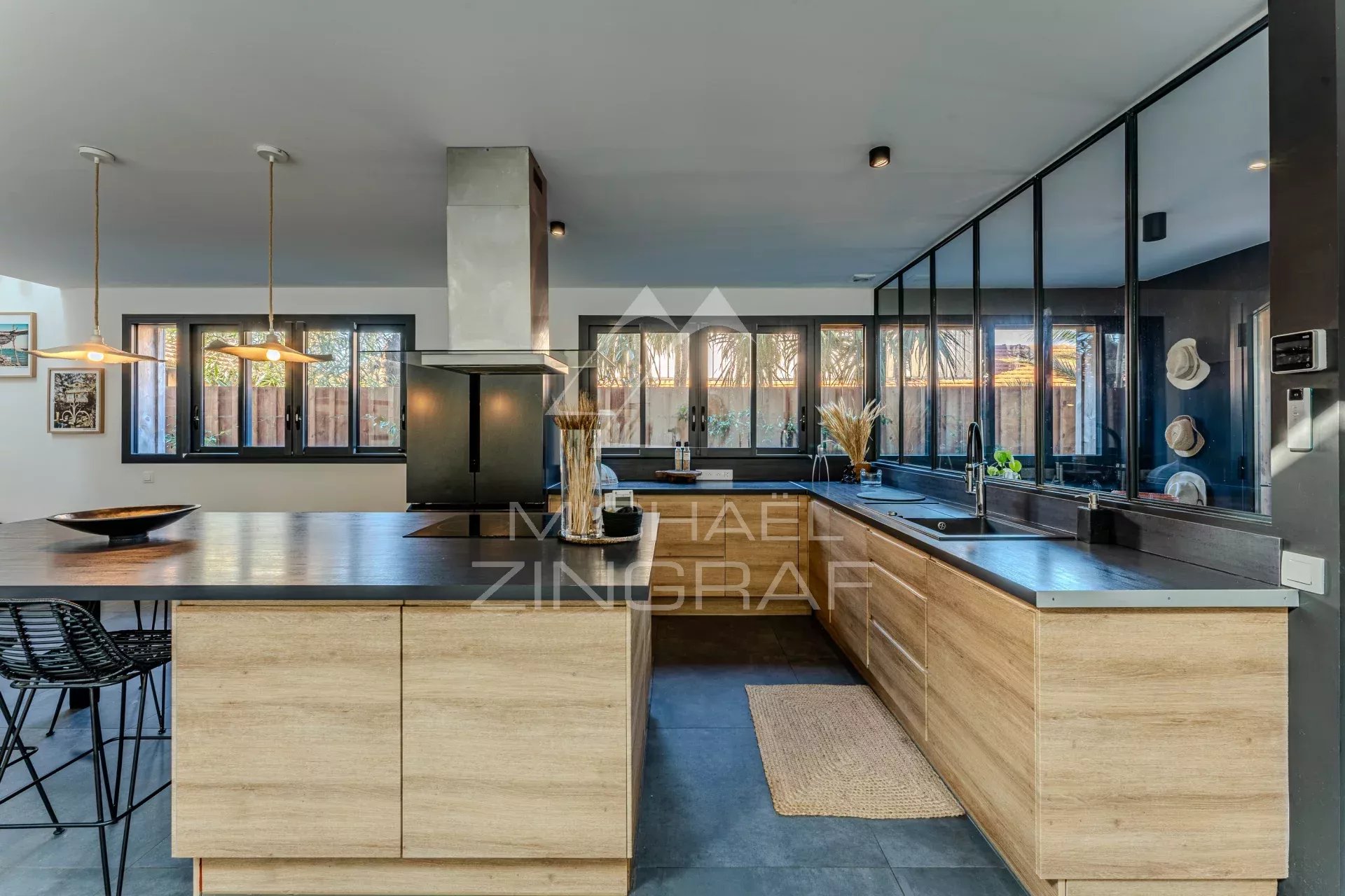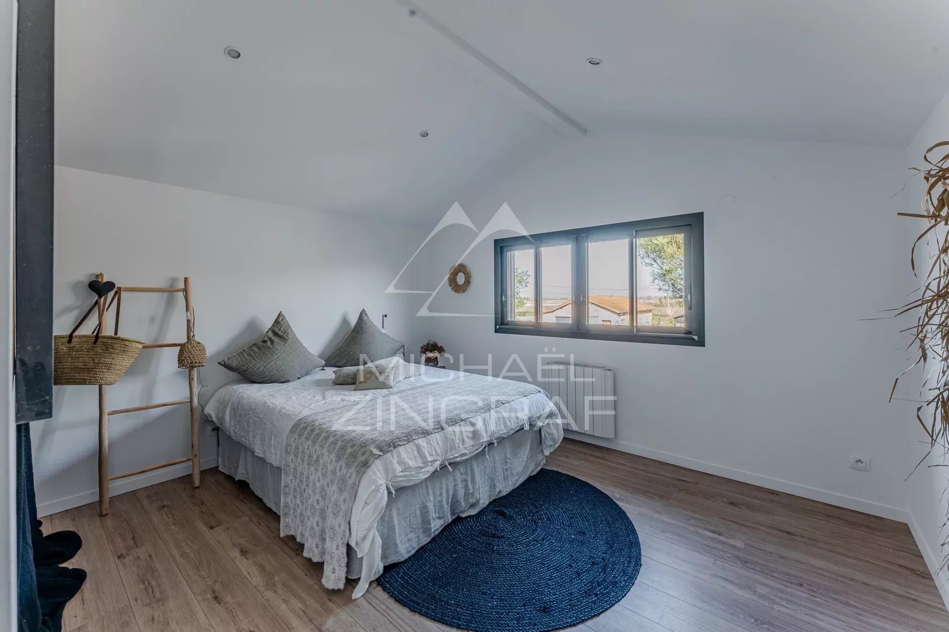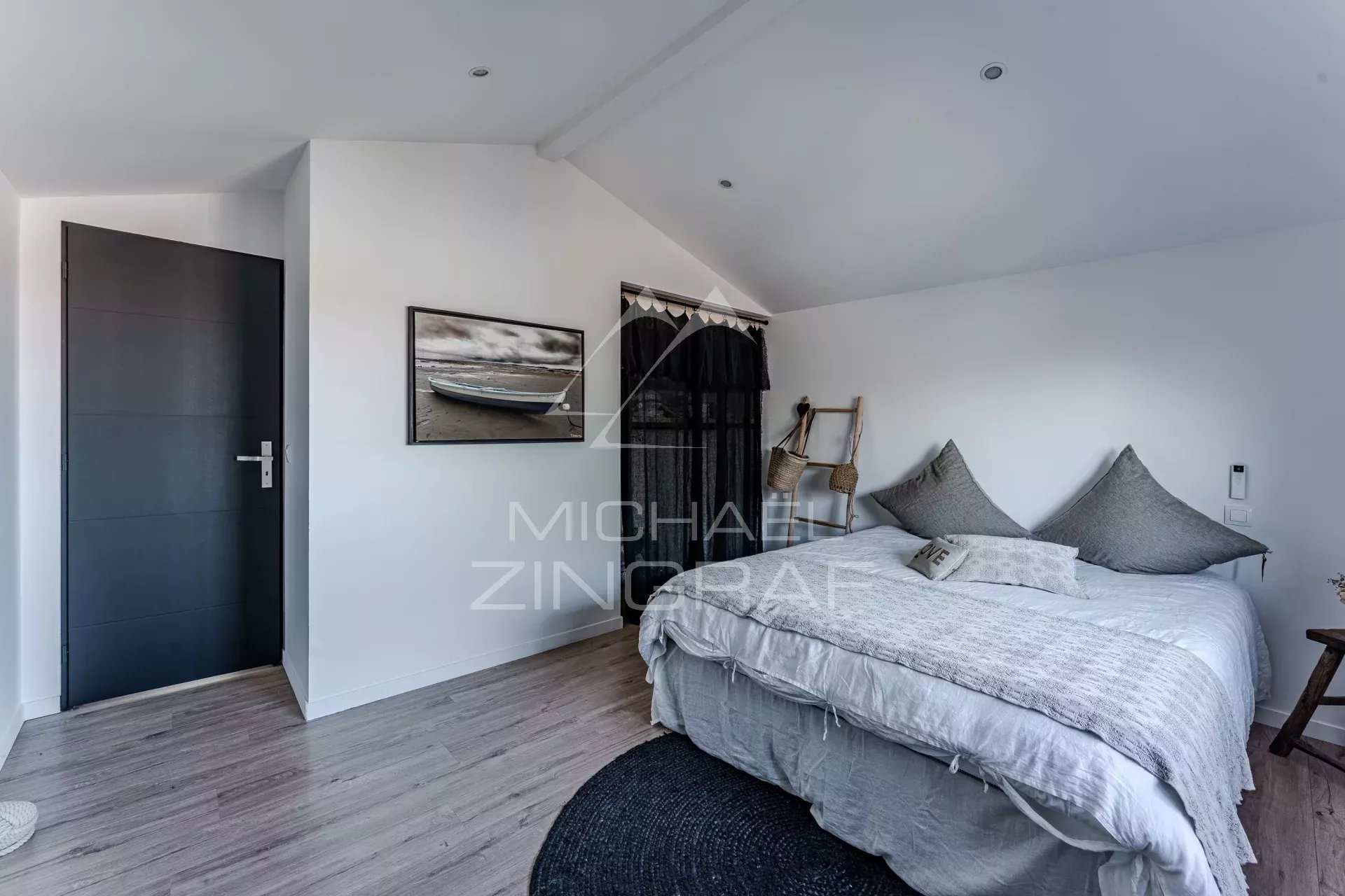 MICHAËL ZINGRAF REAL ESTATE vous invite à découvrir cette magnifique maison contemporaine, idéalement située près du port de La Teste-de-Buch, dans un environnement calme et préservé à deux pas des prés salés. Construite en 2017, cette demeure aux finitions soignées séduit par ses volumes et sa luminosité. Sa spacieuse pièce de vie de 70 m², avec cuisine ouverte entièrement équipée, s’ouvre grâce à une baie à galandage sur une belle terrasse couverte, parfaite pour savourer des moments en extérieur toute l’année. Au rez-de-chaussée, vous profiterez d’un véritable espace privé avec une suite parentale comprenant un dressing et une salle de bain avec douche. S’y ajoutent des toilettes séparées et une buanderie pour plus de confort. L’étage accueille deux chambres lumineuses avec placards, ainsi qu’une salle d’eau avec toilettes. Un cadre de vie paisible et privilégié, alliant modernité et sérénité, à découvrir sans tarder.