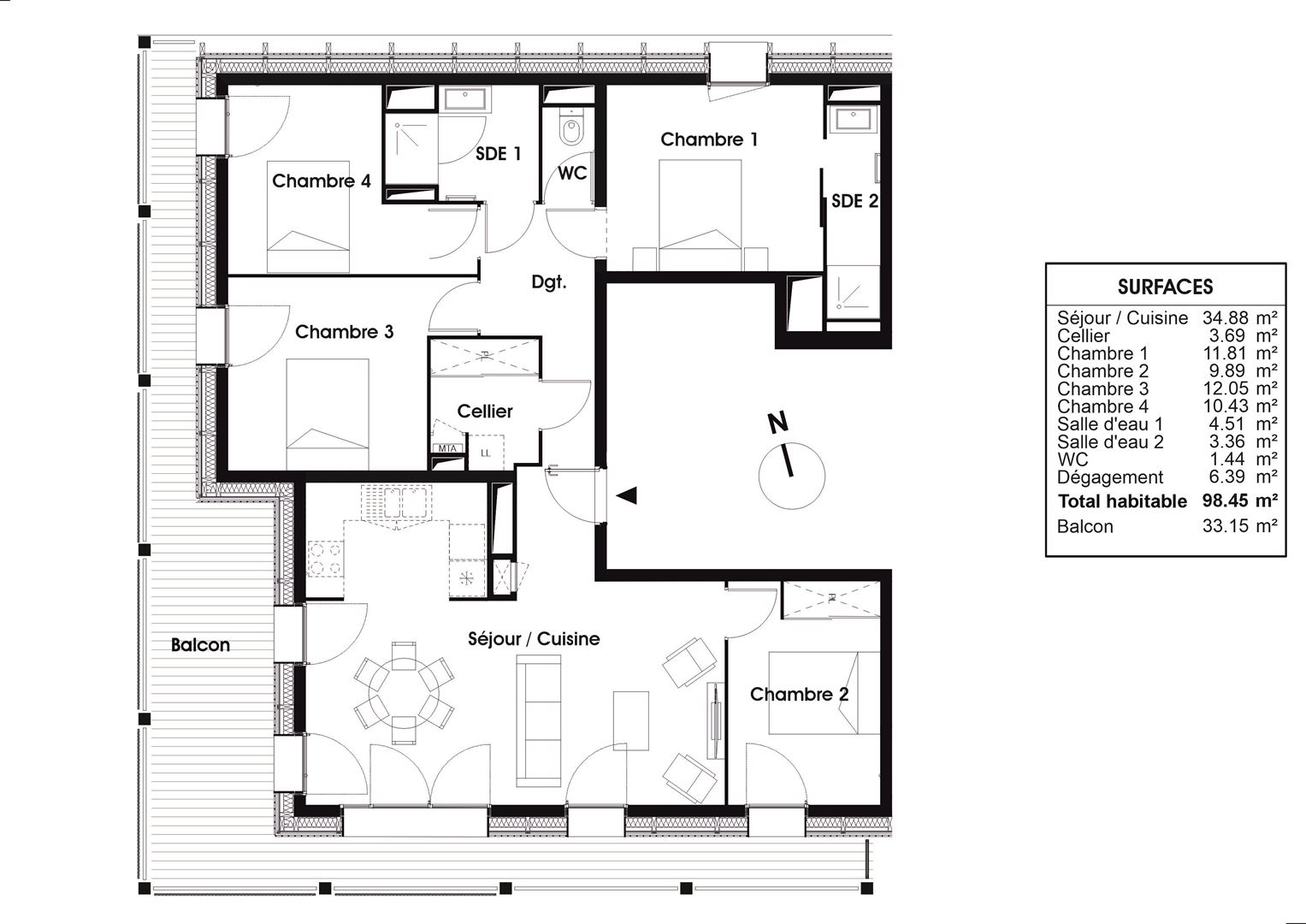 Bel appartement T5, de 98 m², neuf, au 5 ème étage, avec vue imprenable sur le lac de Bordeaux, frais de notaire offerts. Il se compose d'une entrée, d'un séjour cuisine ouvrant au Sud et à l'ouest sur une grande terrasse, de quatre chambres dont une avec salle d'eau privative, d'une salle d'eau, d'un cellier et d'un wc. Conforme à la Règlementation Environnementale 2020, il bénéficie du réseau de chaleur urbaine. Il dispose d'une place de stationnement intérieure dans la résidence. Il sera disponible fin 2026. Le montant de la taxe foncière est de 1950 euros et les charges mensuelles sont de 230 euros (dont chauffage). Les honoraires sont à la charge du vendeur. Les informations sur les risques auxquels ce bien est exposé sont disponibles sur le site Géorisques : www.georisques.gouv.fr.