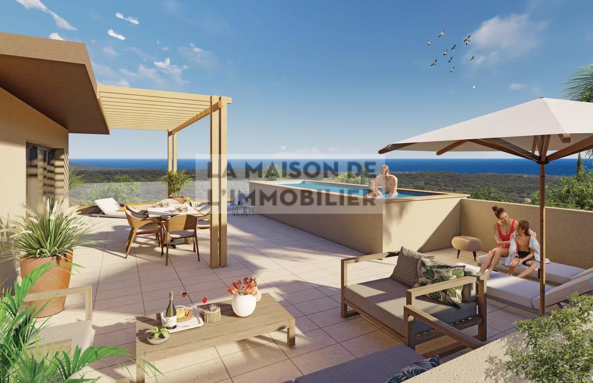 A 40 min des plus belles plages de l'Extrême Sud de la Corse et à 50 min du massif de Bavella, sur la commune de Sari-Solenzara, une résidence de prestige proposant une villa sur toit de type T4 d'une surface habitable de 136,66m² avec une terrasse privée de 91,50m² avec piscine privative bénéficiant d'une vue mer. Idéalement placé au coeur des commerces et non loin des plages, cette villa se compose d'une entrée, d'une pièce à vivre de 65.50m² et sa superbe terrasse de 91,55m², d'un cellier, de 3 chambres de 14,39m² et 11,73m² dont une suite parentale avec salle d'eau, dressing et WC de 20,18m², d'une salle d'eau indépendante ainsi qu'un WC. La résidence réponds aux normes PMR, avec des accès dédiés et un ascensseur. 3 places de parkings privés et sécurisés sont réservés à la villa. Possibilité de compléter l'ensemble avec un box ou cave. Idéal pour investissement locatif ou pied-à-terre à 10 min et 15 min des plages de Canella et Favone offrant une magnifique eau turquoise.