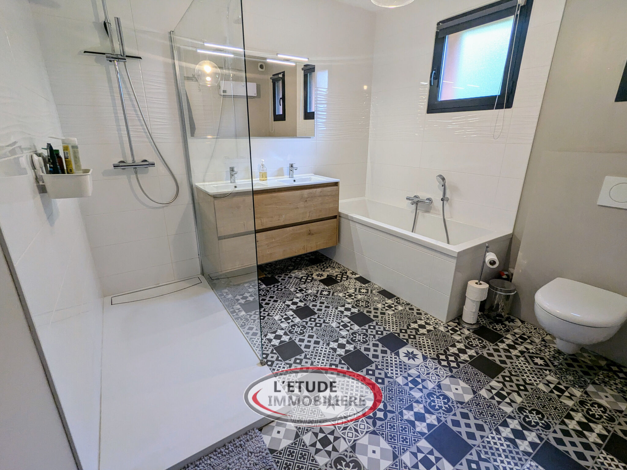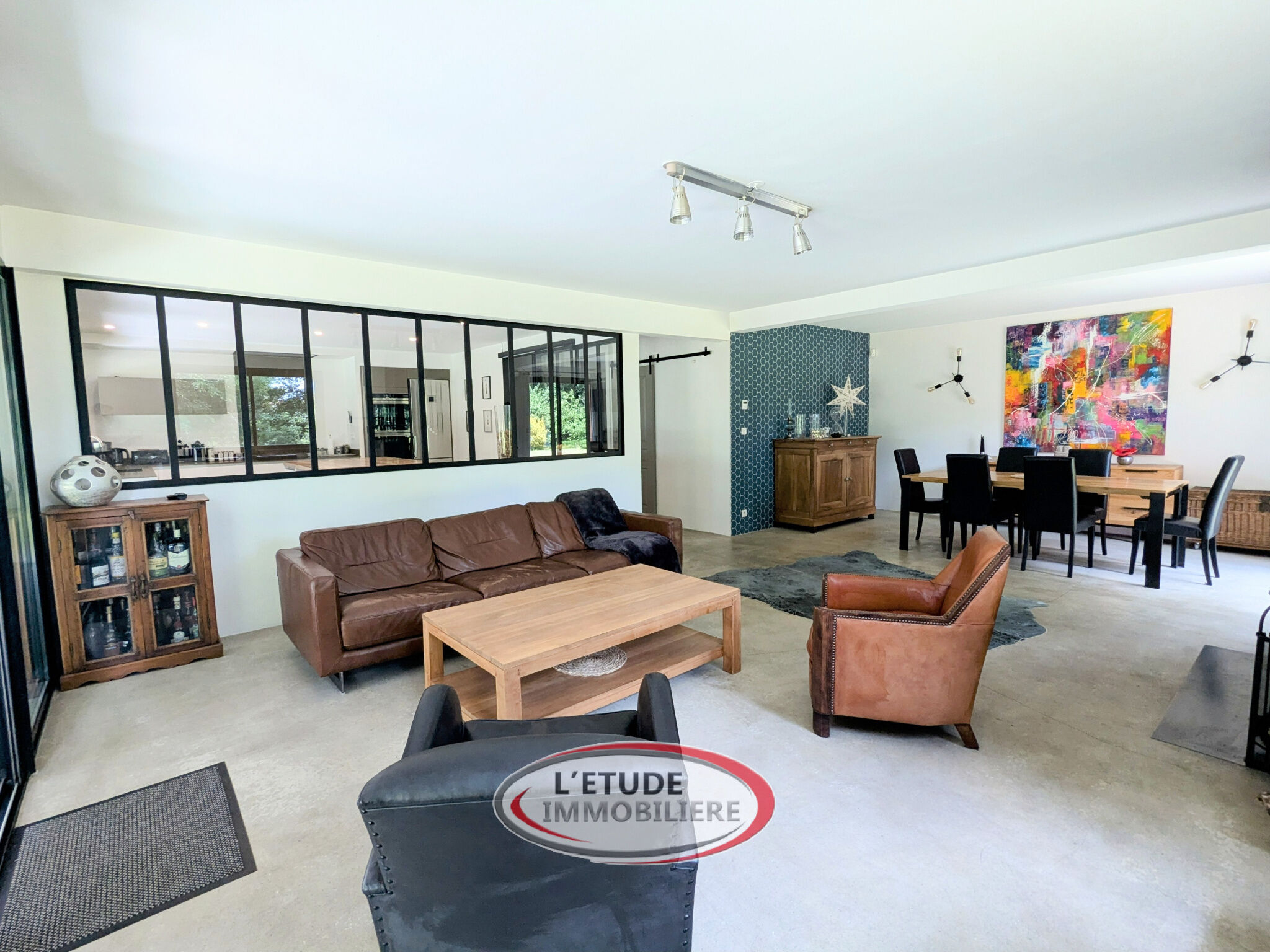 Dès votre arrivée, vous serez accueilli par une large porte d'entrée qui s'ouvre sur un hall joliment décoré, évocateur de l'élégance de la maison. Un dégagement vous conduit vers une pièce de vie lumineuse au sol en béton brut, un choix tendance qui n'appellera que des compliments. De grandes verrières entourent une cuisine de qualité, entièrement équipée et spacieuse (21 m²), où chaque moment passé sera un plaisir.