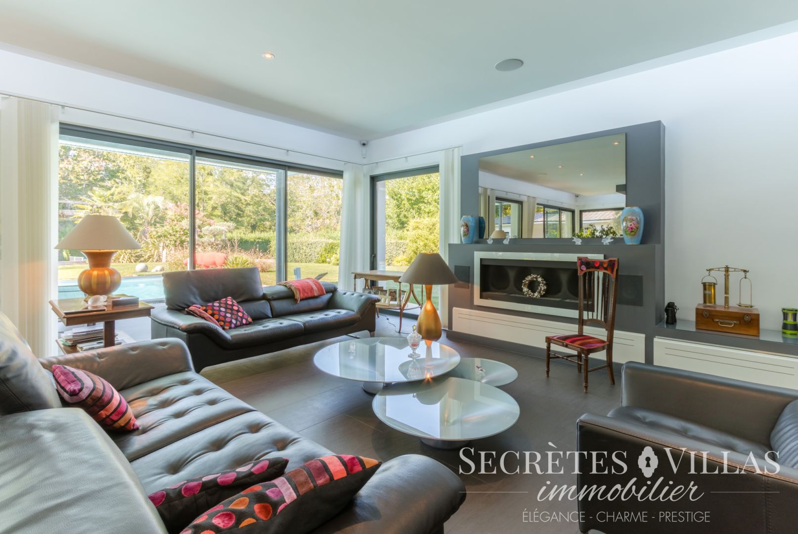 CAMBLANES ET MEYNAC commune de la RIVE DROITE très recherchée avec toutes les commodités , au calme et environnement boisé, Ensemble 405m2 utiles: superbe villa contemporaine 293m2 de 2012 aux baies vitrées multiples inondant de lumière l'ensemble des pièces et vous offrant: entrée placards, magnifique réception 81M2: séjour, belle cuisine US équipée haut de gamme et salon cheminée éthanol. Cellier. Aile parent avec couloir dégagement, suite parentale: chambre, dressing, Sde vaste douche italienne et Wc indépendant accès terrasse privative. Aile enfant: Couloir vitré et dégagement, Wc lave main, suite aménagée PMR: chambre, dressing et grande sde contemporaine douche italienne, 2 chambres placards dressing et leur sde douche italienne. Rez de jardin et patio végétalisé: family room salle de jeux billard 34m2, véritable salle home cinéma 24m2 superbement équipé, chambre ou bureau, sde et wc indépendant. Buanderie. Salle de contrôle (alarme,écrans, tableau edf....). Des dépendances viennent valoriser ce bien: ensemble 63m2 de plain pied totalement aménagé en 2 parties avec entrées indépendantes et possibilité appartement utilisé actuellement comme: superbe espace sport détente 34m2 avec déshumidificateur, cheminée éthanol comprenant sauna, spa et hammam, 2ème pièce avec exceptionnelle cave à vin climatisée 29m2 équipée luxueusement. Ensemble Pool house 50m2: Cuisine d'été équipée avec coin salon, local technique, douche italienne et Wc, pièce rangement matériel jardin. Terrasses carrelées. Patios joliment végétalisés. Boulodrome. Le tout sur un beau terrain clos paysagé de 2570m2 accès direct zone boisée protégée et belle piscine maçonnée 12X6 chauffée au sel, liner renfocé et rideau de sécurité immergé. Ensemble intérieur et extérieur soigné. Construction de qualité et nombreuses prestations: système drainage, micro station, puisard, arrosage automatique, éclairage et sono intégrée jardin et patios, construction béton, huisseries Alu à galandage et verres sécurit, pompe à chaleur clim réversible, 2 adoucisseurs, portail élecctrique, domotique (volets centralisés, alarme, système vidéo surveillance...). Surface résiduelle constructible possibilité garage. Idéal famille, profession libérale...Ecoles maternelle et primaire. Proximité commerces. Au bout de l'allée bus scolaire pour collège et lycée. 20mn Bordeaux centre et gare St Jean. Son emplacement, ses volumes, ses nombreuses prestations font de ce bien un produit rare sur le marché actuel! Les informations sur les risques auxquels ce bien est exposé sont disponibles sur le site Géorisques. (3.33 % honoraires TTC à la charge de l'acquéreur.)