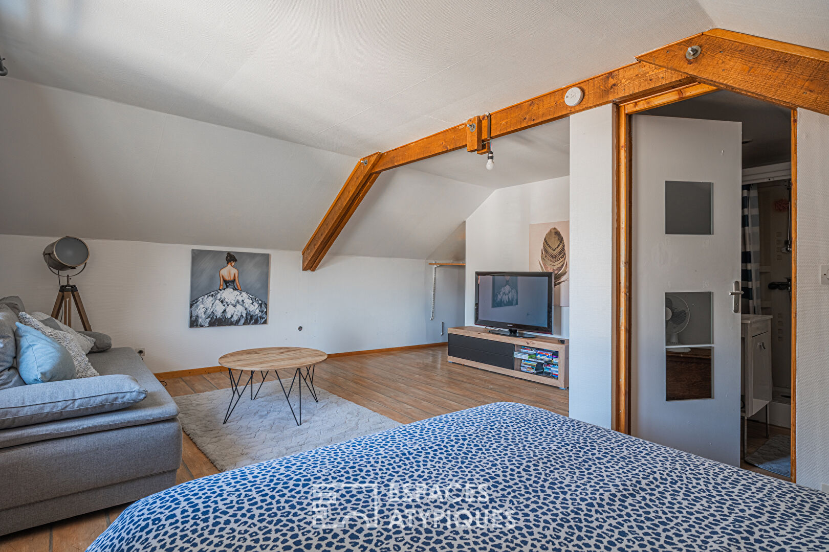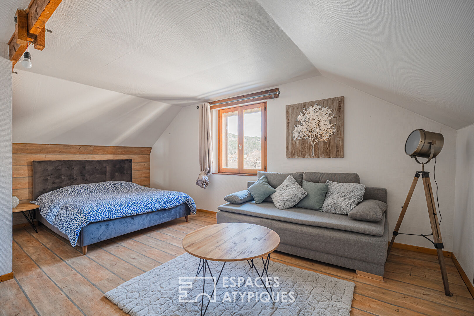 Cette ancienne grange typique de la région est située au coeur du Village du Sappey en Chartreuse et offre, outre un accès immédiat à toutes les commodités, une vue dégagée sur les montagnes environnantes. Actuellement à usage commercial, le rez-de-chaussée de 90 m2 avec sa véranda de 33 m2 a été requalifié en habitation et offre une belle surface à repenser en espace de vie ou en appartement indépendant. Les étages proposent une superficie d'habitation confortable de 125 m2 avec au premier niveau une pièce de vie chaleureuse, baignée de lumière et offrant une vue entièrement dégagée. Une cuisine ouverte sur le salon invite instantanément à la convivialité dans cet espace où trône fièrement l'escalier menant à l'étage. L'accès à un grand balcon, deux belles chambres, une salle de bains empreinte de bois, un espace buanderie et des toilettes indépendantes viennent compléter ce niveau. Le dernier niveau avec sa charpente apparente surplombe le salon et propose quant à lui un grand dégagement avec de multiples rangements faisant actuellement office de bureau, une suite parentale avec sa salle d'eau et WC et un dernier balcon. Un abri de jardin ainsi qu'une grande dépendance avec un studio de 22 m2 en étage pouvant être totalement indépendant, un garage de 13 m2 et espace de stockage de 27 m2 complètent l'ensemble sur un terrain de 538 m2. Le rez-de-chaussée permet de nombreuses possibilités d'aménagement et pourrait être rendu complètement indépendant grâce à ses différentes entrées. Taxe foncière : 3 150 euros CLASSE ENERGIE : E / CLASSE CLIMAT : B Montant moyen estimé des dépenses annuelles d'énergie pour un usage standard, établi à partir des prix moyens des énergies indexés de l'année 2021 (abonnements compris) : entre 1 790 euros et 2 470 euros Les informations sur les risques auxquels ce bien est exposé sont disponibles sur le site Géorisques : www.georisques.gouv.fr Contact : Sylvie BARRIER (EI) - 06 95 66 27 08 Agent commercial indépendant RSAC Grenoble n° 831 535 372 Sylvie BARRIER (EI) Agent Commercial - Numéro RSAC : 831535372 - GRENOBLE.