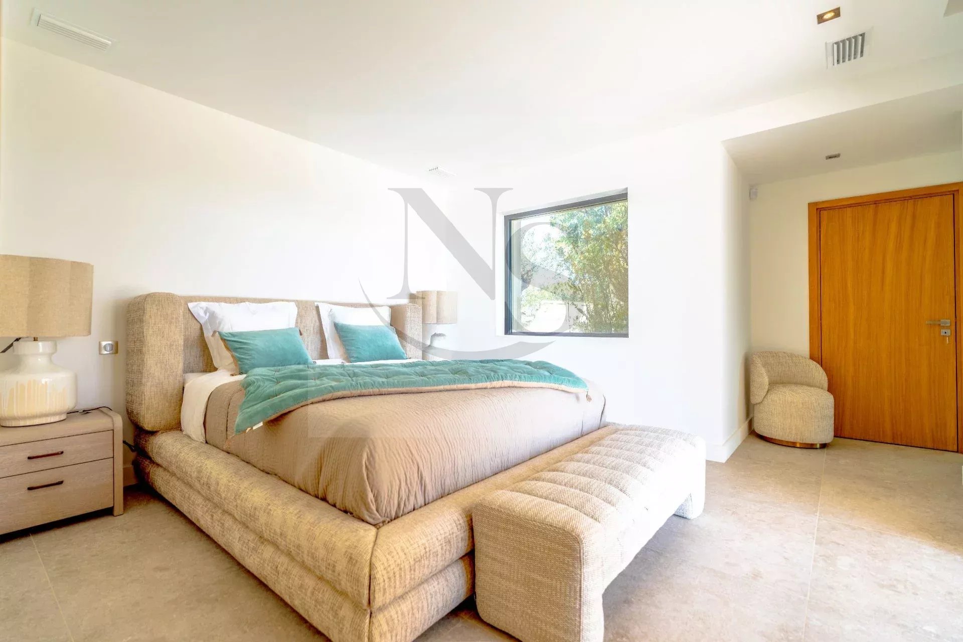 Sainte-Maxime, Coteaux de la Nartelle – 5 chambres dont 4 suites parentales – Terrain de 3 250 m² – 6 900 000 € Dans le secteur résidentiel du Domaine de la Nartelle, à Sainte-Maxime, cette villa contemporaine rénovée en 2024 offre une vue mer panoramique, une exposition plein Sud et un environnement calme. Édifiée sur un terrain paysagé de 3 250 m², la maison développe une surface habitable de 358 m2, répartis sur plusieurs espaces de vie confortables. Elle se compose de 5 chambres, dont un dortoir, avec au total 1 salle de bains, 4 salles de douches et 6 toilettes. Le rez-de-chaussée accueille un hall de réception, un vestiaire avec WC invités, un vaste séjour avec cheminée, ouvrant sur une terrasse couverte et un patio avec fontaine, une salle à manger, une cuisine américaine entièrement équipée, ainsi qu’un cellier avec chambre froide. La villa dispose également d’un hammam et d’une salle de sport. Prestations et équipements : • Piscine à débordement chauffée • Hammam • Salle de sport • Cheminée • Climatisation réversible • Eau chaude par système thermodynamique • Double vitrage • Volets roulants électriques • Buanderie • Arrosage automatique • Calme Annexes : • 2 garages • 1 cave • 2 terrasses • Nombreux rangements Informations techniques : • Chauffage / climatisation : réversible • Eau chaude : thermodynamique • Assainissement : tout à l’égout • Toiture : tuiles • Année de construction : 2024 Contactez David HADIDA au +33 6 19 35 57 98