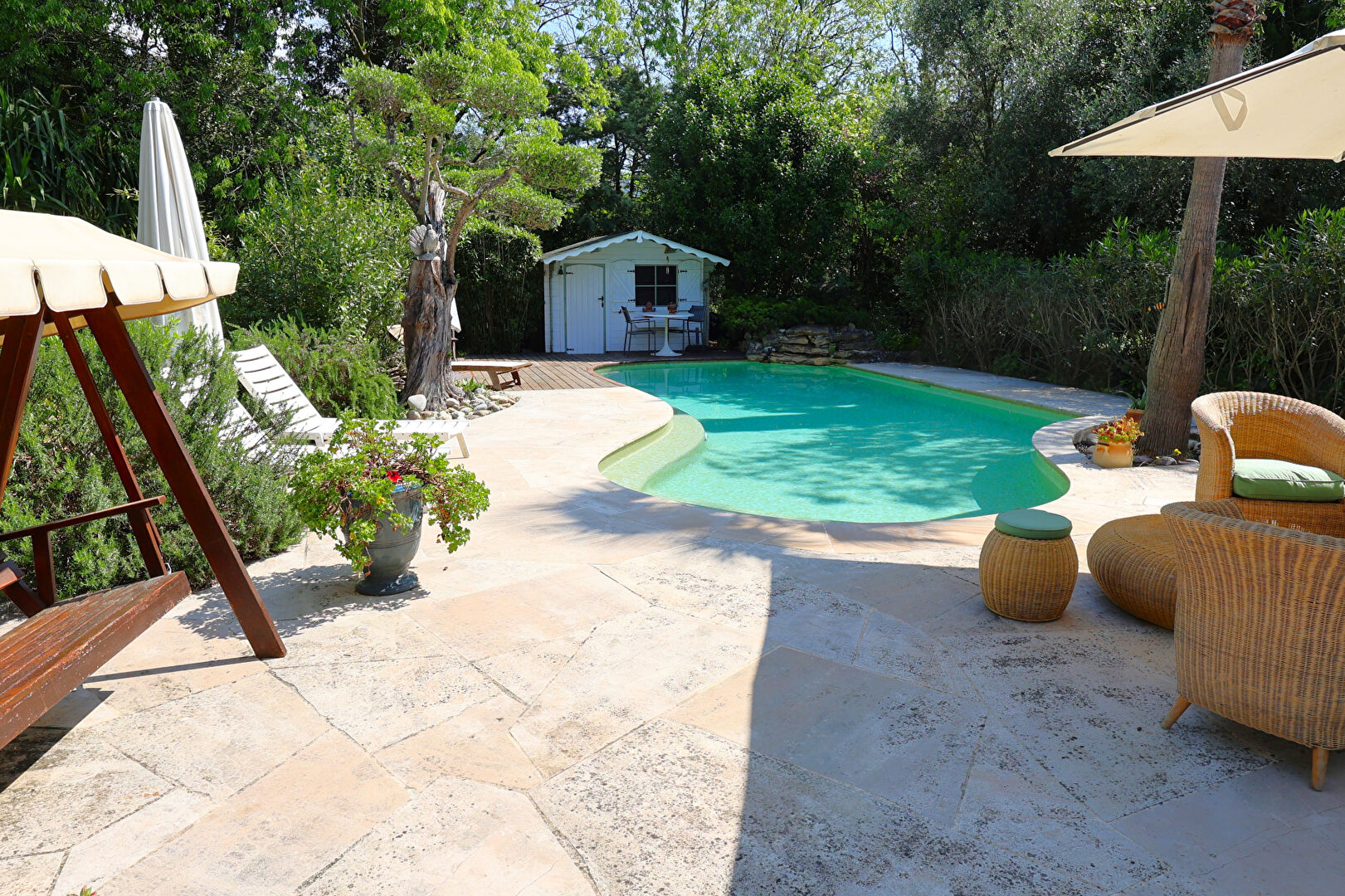 * PEYMEINADE secteur résidentiel * Tout le charme et l'authenticité pour ce vieux MAS de 160 m², entièrement rénové du XVIII, édifié sur un jardin paysagé 2277 m² et arboré d'oliviers centenaire avec de jolis bassins à poissons et une magnifique piscine de forme libre et son espace détente. Le Mas se compose: d'une cuisine équipée et aménagée "neuve" avec salle à manger, un salon avec cheminée, ouvrant sur très belle terrasse ombragée, 3 chambres, 2 salles de bains, un dressing, un bureau avec bibliothèque pouvant servir de quatrième chambre. Une bergerie rénovée avec salle d'eau-wc. au sous sol : cave, buanderie et pièce de rangement. Authentique roulotte de 1932 des Saintes Maries de la Mer restaurée servant de chambre d'amis. Garage 2 voitures avec porte automatique, raccordé au tout à l'égout. Coup de coeur assuré... (4.59 % honoraires TTC à la charge de l'acquéreur.)