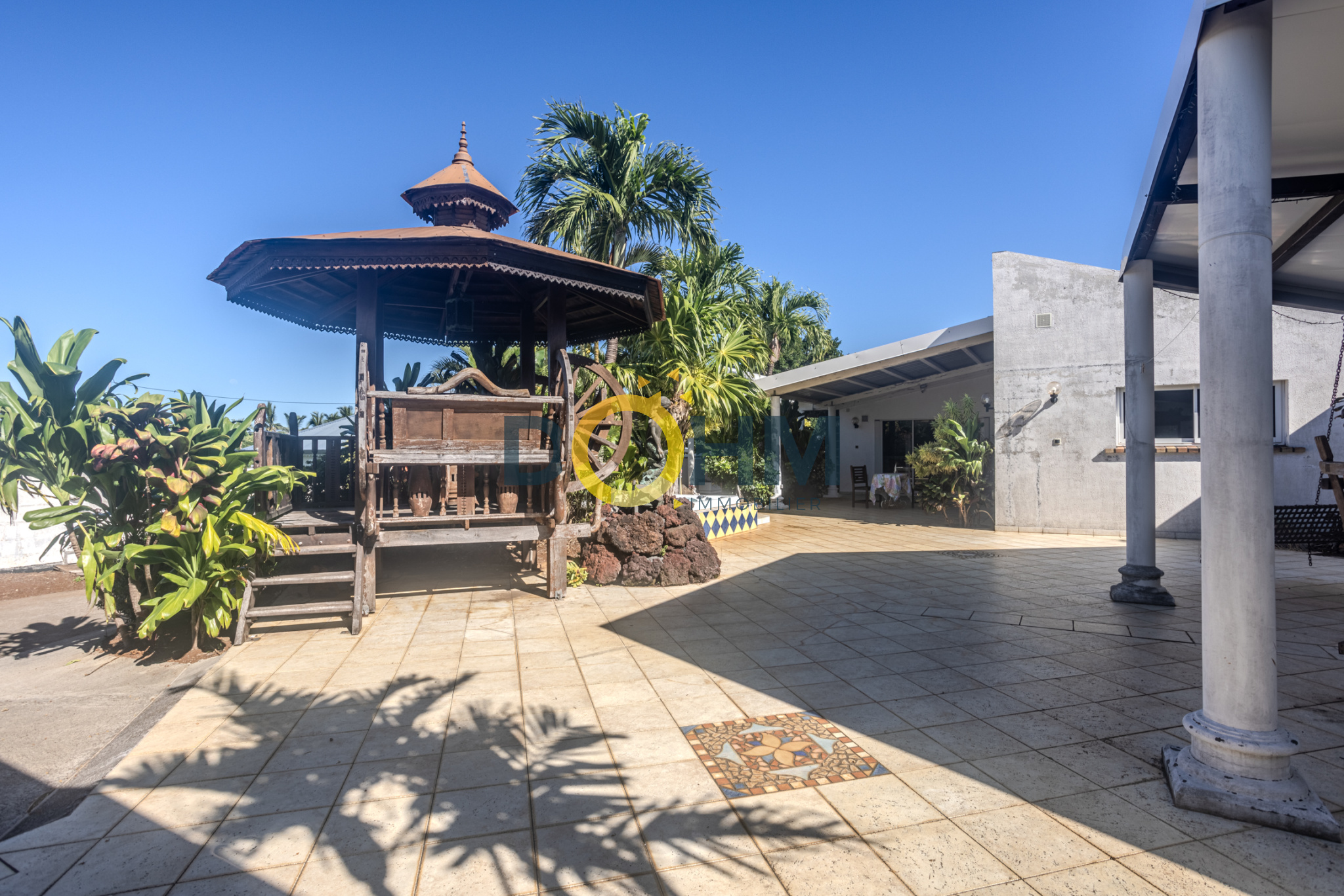 Une grande terrasse avec balançoire, espace détente jaccuzzi, et coin aménagé pour recevoir complète cet ensemble.