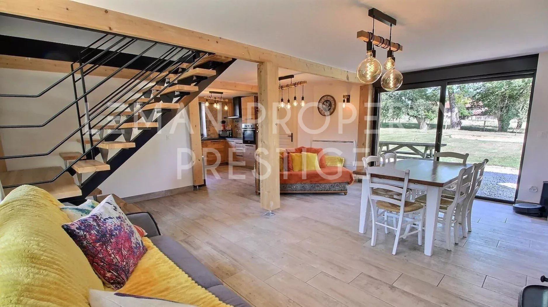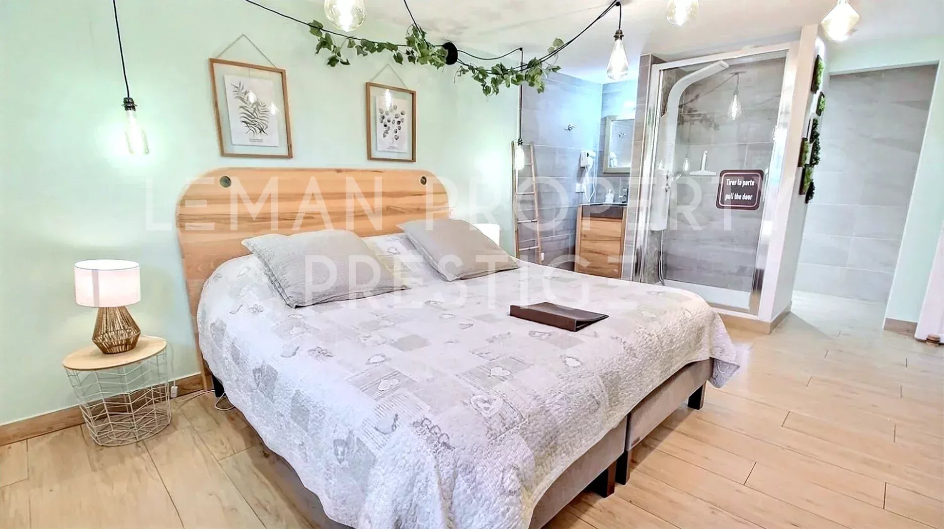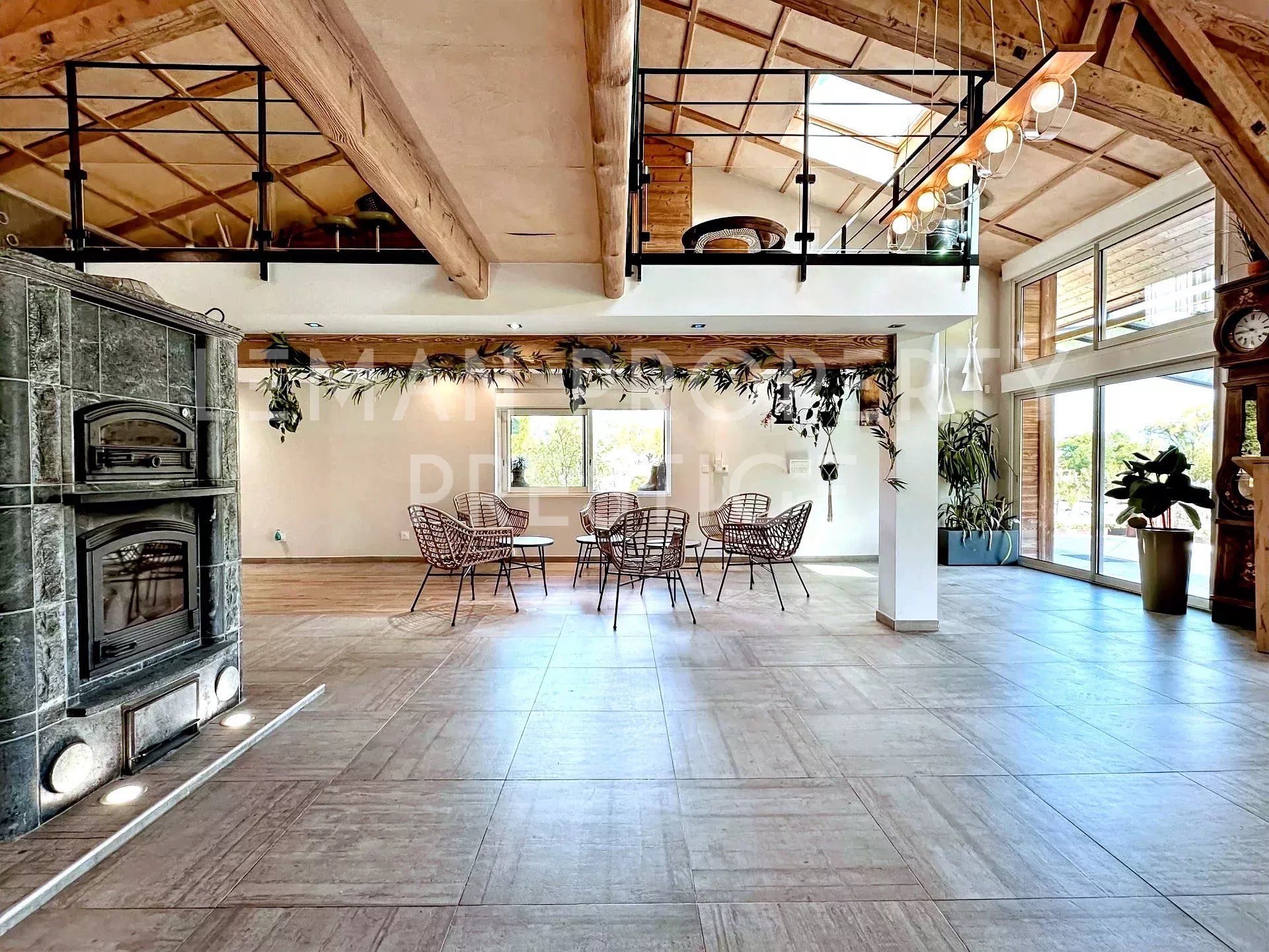Découvrez une propriété unique au cœur des paysages alpins, offrant une vue panoramique à 360° sur les montagnes environnantes. Ce bien rare dans le marché qui est initialement un Gîte de 4 étoiles, est proposé aujourd'hui à la vente devenant une réelle opportunité d'acquérir une propriété hors du commun. Ceinturée de plusieurs hectares Agricoles Protégées, cette propriété est composée de deux bâtisses d'environ 400m2 habitables au total, édifiées sur un terrain de plus de 4600m2. Construction de 1999 et rénovée au fil du temps, le bien propose un style moderne avec des belles finitions et des matériaux de qualité. Alliant tranquillité et accessibilité, bénéficiant d'une situation extraordinaire à seulement 15 minutes de Genève, 25 minutes d’Annecy et 35 minutes des pistes de ski. La première maison de 310 m² dispose d'une vaste pièce de vie d'environ 110m2, où la lumière naturelle est abondante grâce à ses grandes ouvertures. Vous serez séduits également par la belle hauteur sous plafond, la mezzanine qui surplombe ce volume en harmonie ainsi que par le majestueux poêle suédois en pierre réfractaire qui domine cette pièce. La cuisine indépendante est entièrement équipée avec des équipements de qualité professionnelle. L'espace nuit pour cette bâtisse est de 6 chambres, dont 3 suites avec sa propre salle d'eau, une salle de bains et 6 toilettes au total. La seconde, d'environ 90 m² se dispose ainsi : Au rez-de-chaussée : une cuisine équipée et moderne, ouverte sur la pièce de vie traversante et baignée de lumière. Cet espace charmant et cosy et agrémenté d'un poêle à bois et donne sur une terrasse privative. Une salle d'eau avec douche italienne et toilettes. Une pièce de rangement et installations techniques. À l'étage : Deux chambres. Ne manquez pas cette opportunité rare d’acquérir un bien d’exception bénéficiant de cette situation idyllique. Contactez-nous dès maintenant pour organiser une visite et laissez-vous séduire par le charme et le confort de cette propriété. NB : - Une source est captée dans le terrain que vous pourrez exploiter. - Il existe la possibilité d'acquérir davantage de terrain agricole pour vos projets personnels. Honoraires à charge du vendeur. Énergie - Consommation conventionnelle 212.3 kWhEP/m².an (D) Énergie - Consommation finale 157.5 kWhEF/m².an (C) Énergie - Estimation des émissions 6.5 kg CO2/m².an (B) « Les informations sur les risques auxquels ce bien est exposé sont disponibles sur le site Géorisques : georisques.gouv.fr ».