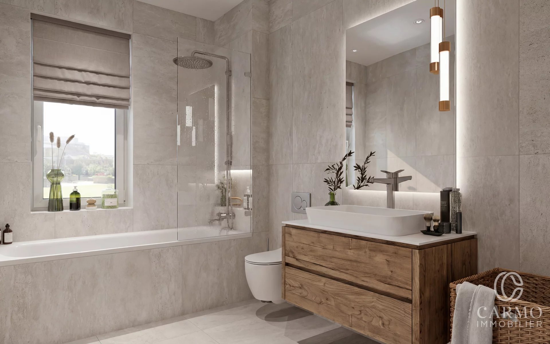 Un appartement neuf de rêve dans un endroit central Vous êtes à la recherche d'un appartement moderne et élégant dans un emplacement privilégié ? Alors cet appartement neuf est exactement ce qu'il vous faut ! L'appartement se situe dans la localité animée de Mertert. à seulement quelques minutes des commerces. restaurants. et transports en commun. L'appartement dispose d'une surface habitable de 85.88 m² et est situé au rez-de-chaussée. L'aménagement intérieur est le suivant : Un hall d'entrée. une cuisine. un salon avec sa salle à manger et accès à une loggia. une salle de bains. deux chambres à coucher. et un débarras. Toutes les unités d'habitation bénéficient de places de parking à l'intérieur et à l'extérieur ainsi que d'un jardin. Une place de parking souterrain est comprise dans le prix indiqué ; toute place supplémentaire peut être achetée moyennant un supplément de 35 000 €. TVA comprise. Information importante : Tous les murs non porteurs peuvent être adaptés aux souhaits du client. dans la mesure où l'avancement actuel des travaux le permet encore. Grâce à une technologie moderne et une installation solaire. le bien immobilier est extrêmement efficace sur le plan énergétique (classe énergétique ABA). ce qui a un effet positif sur vos frais de services. Situation En raison de sa situation géographique idyllique au bord de la Moselle et de sa proximité avec la frontière allemande. Mertert est un lieu très recherché et attractif. Connexions de transport (transport public gratuit au Luxembourg) Distances en voiture Aéroport de Luxembourg ± 23 km = 18 minutes en voiture Luxembourg-ville ± 31 km = 30 minutes en voiture Trèves-ville ± 14 km = 23 minutes en voiture. Un arrêt de bus se trouve à proximité immédiate et la gare de Mertert est accessible en ± 5 minutes à pied. Distances en train Gare Mertert - Gare Luxembourg | 39 minutes Distances en bus Mertert-Luxembourg Kirchberg | 27 minutes Loisirs / Établissements d'enseignement Dans les environs de Mertert. il y a de nombreuses pistes cyclables et chemins de randonnée. Le beau parc de Mertert offre également un parcours de fitness en plein air. une aire de jeux. une aire de jeux aquatiques. et bien plus encore. Une crèche. ainsi qu'une école fondamentale et primaire se trouvent également à proximité. Contactez David CARMO au +35220600816 ou office@carmoimmo.lu. Ce bien est présenté par Carmo Immobilier (+352-20600816). Plus d’infos sur www.carmoimmo.lu.