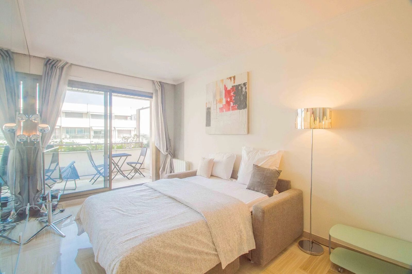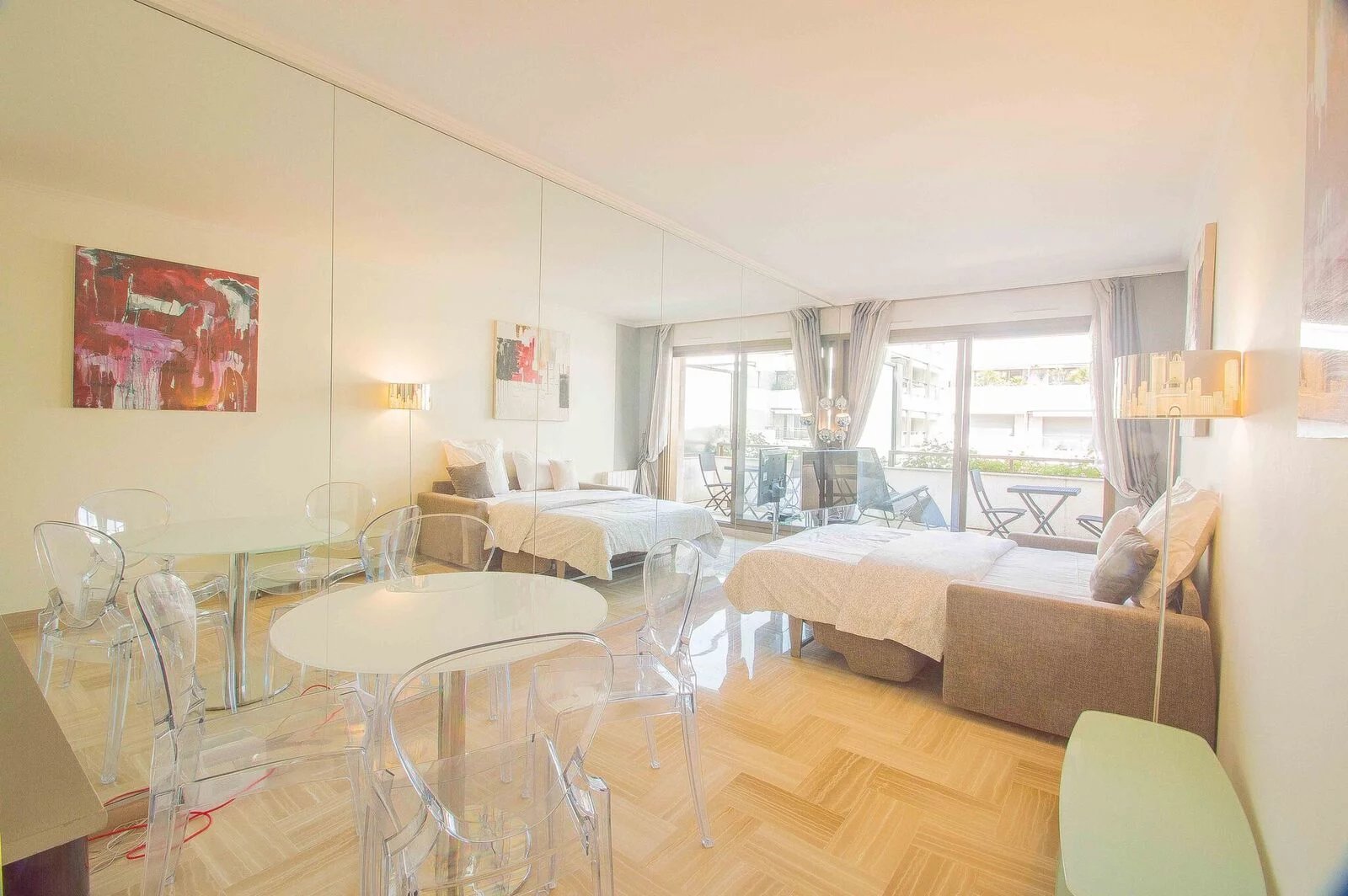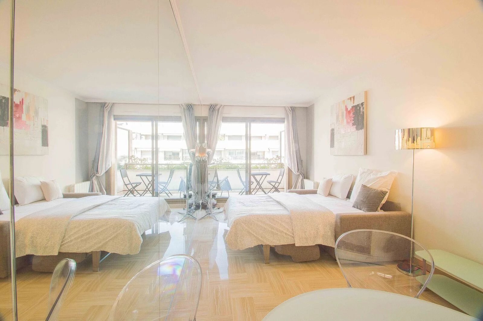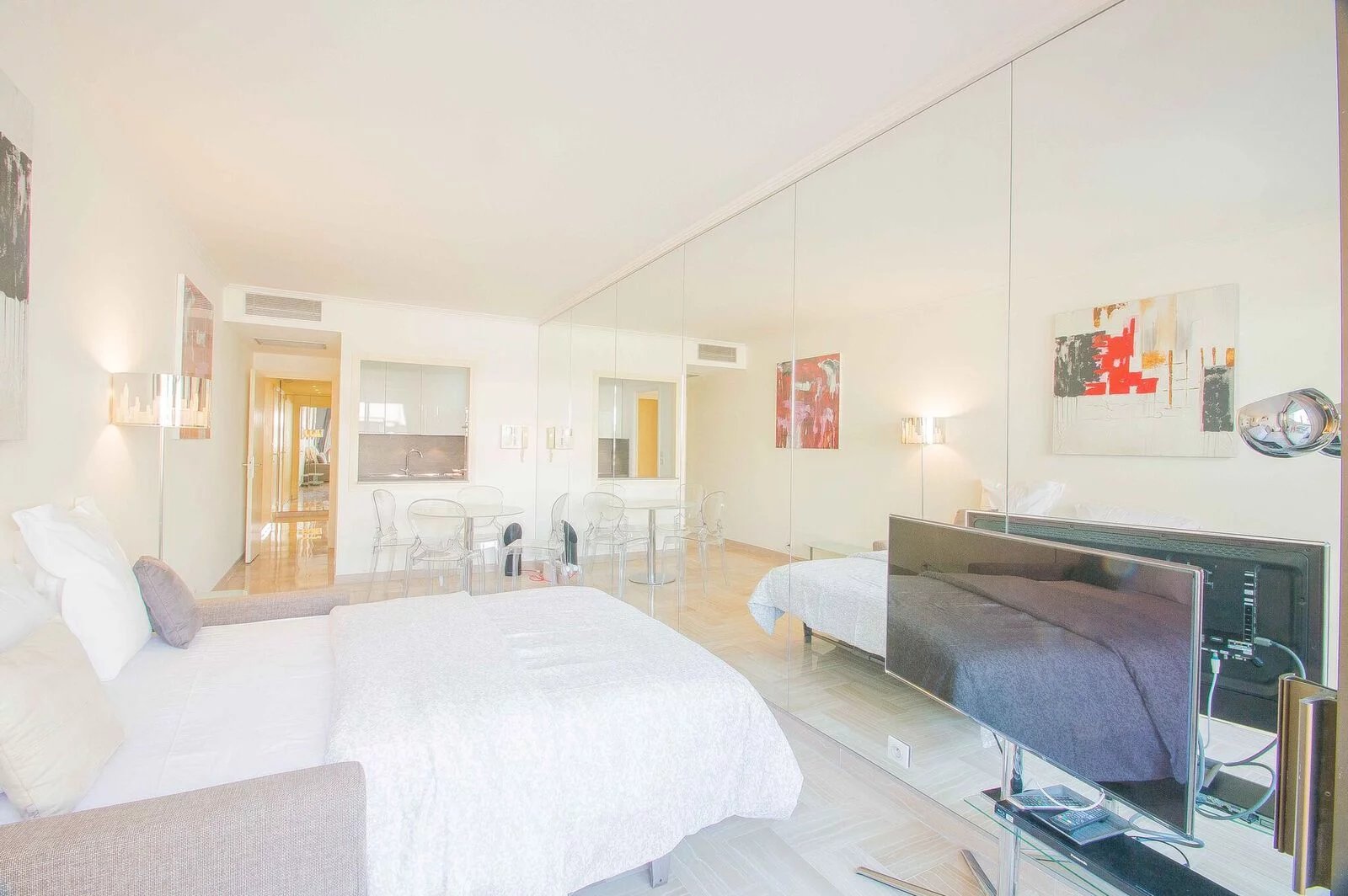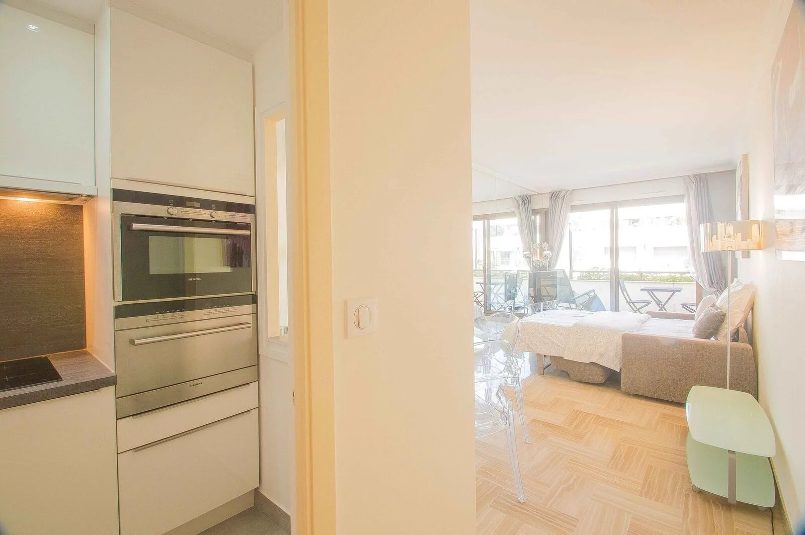 Magnifique appartement entièrement rénové avec goût au 6ème étage. Il est composé d'une entrée avec rengements, une salle de douche, une cuisine indépendante (ouverte avec un bar) entièrement équipée (four, micro-onde, grille-pain, machine à café, plaques de cuisson, hotte, lave vaisselle) Un coin repas, un canapé lit de qualité, une télévision à écran plat. Et la terrasse avec un transat. Appartement idéal pour séjours de vacances en couple comme pour les séjours professionnels seul.