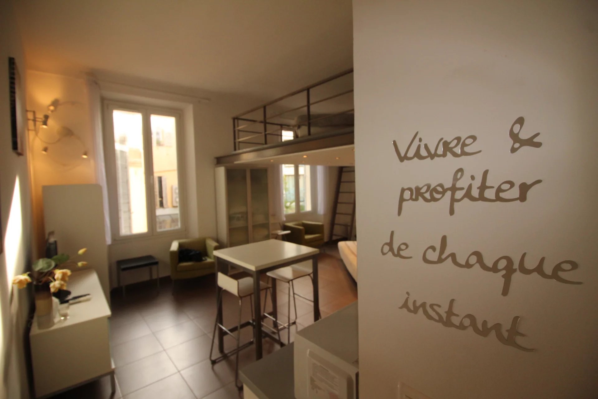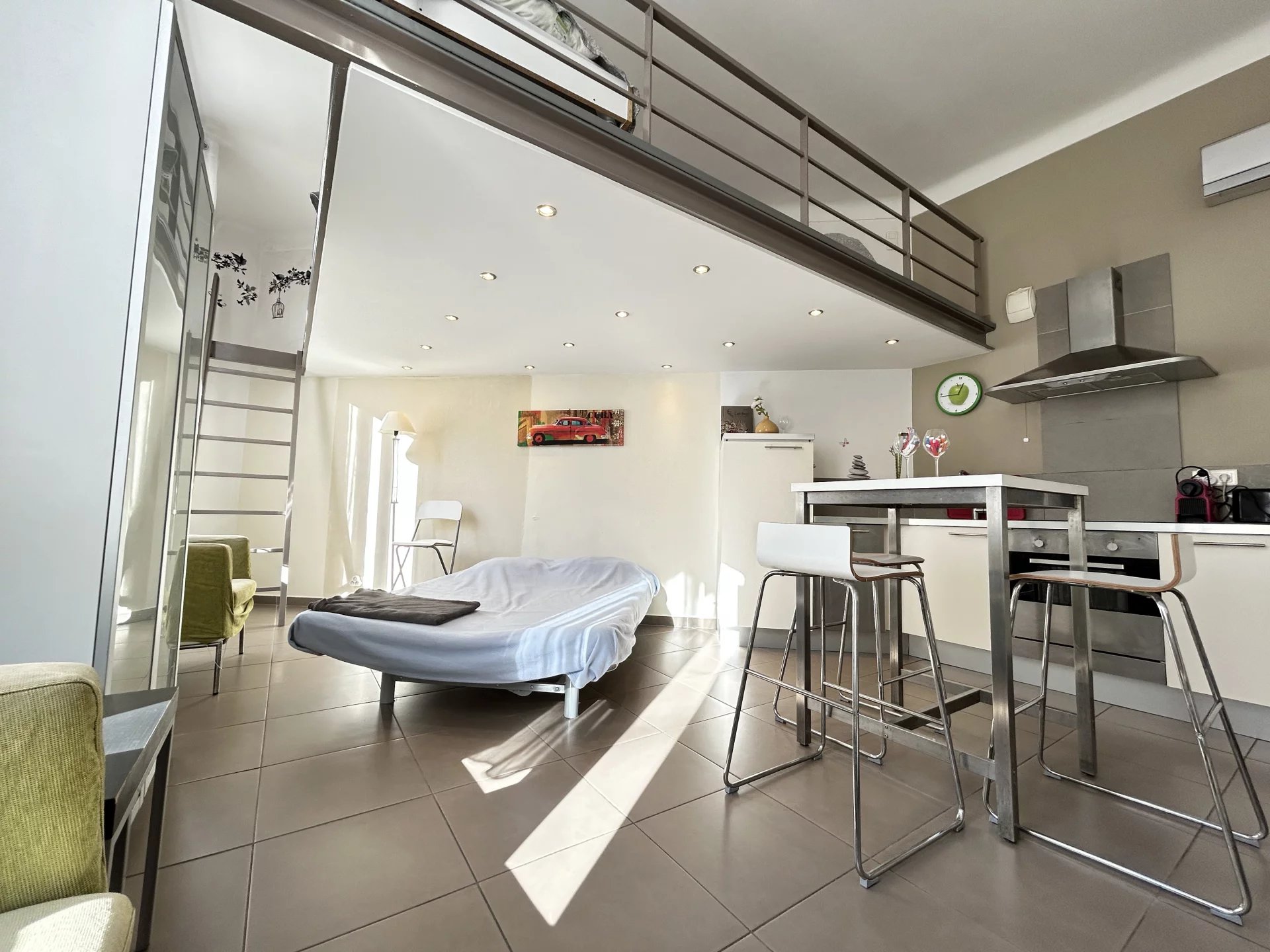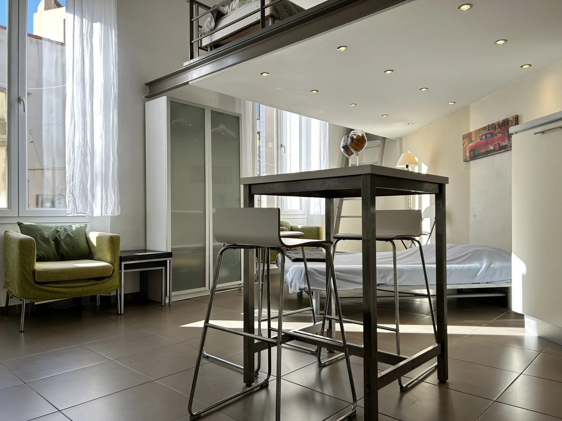 Rue Borniol, à quelques minutes à pied du centre ville, à proximité des commerces et moins de 10 minutes à pied des plages. Grand studio avec mezanine, composé d'une entrée, une pièce principale avec cuisine américaine, un canapé lit, 1 grand mit dans la mezzanine ( Impossible de se lever) , une salle de douche et un wc. Climatisation, lave linge, air conditionné, double vitrage