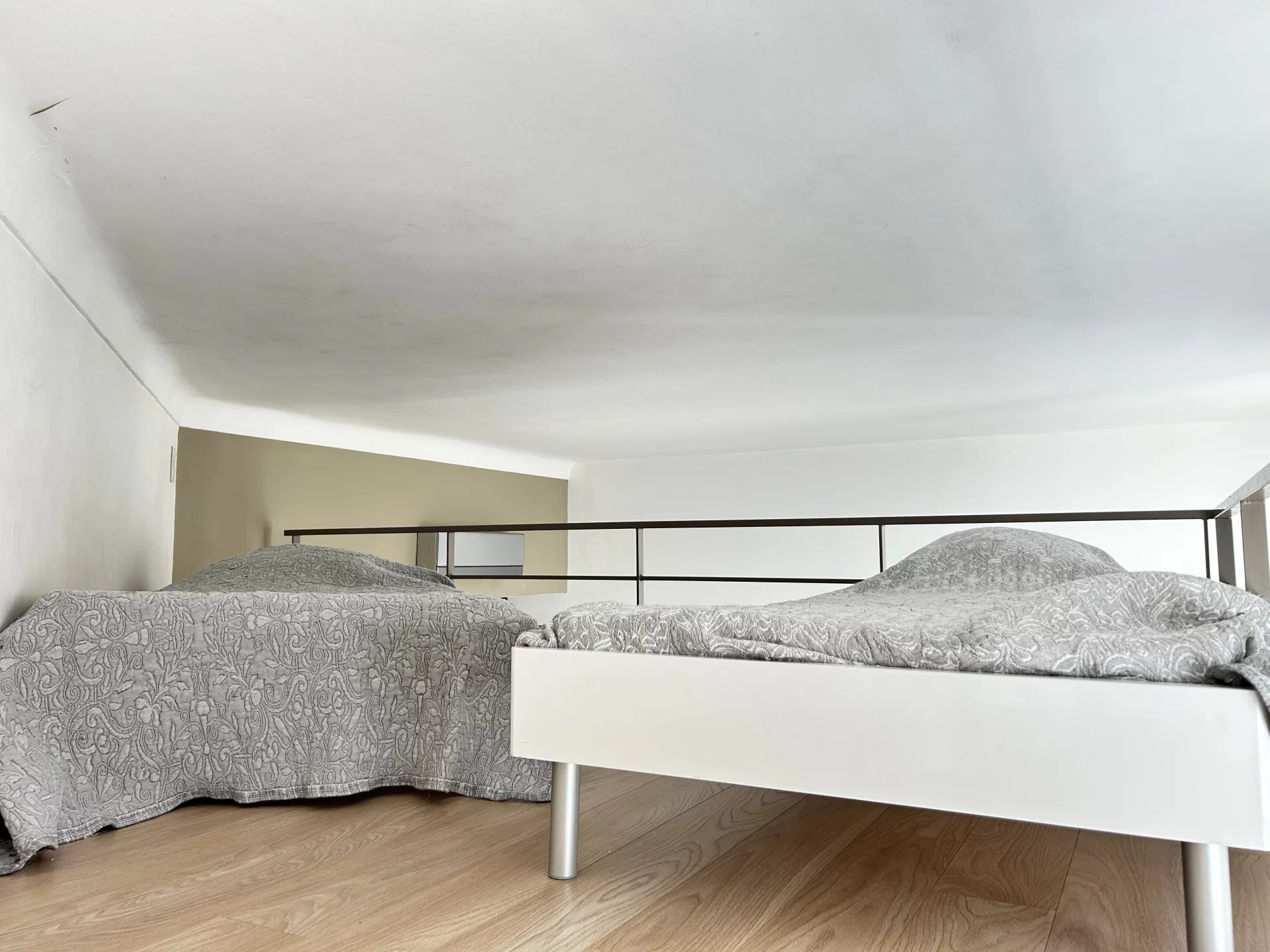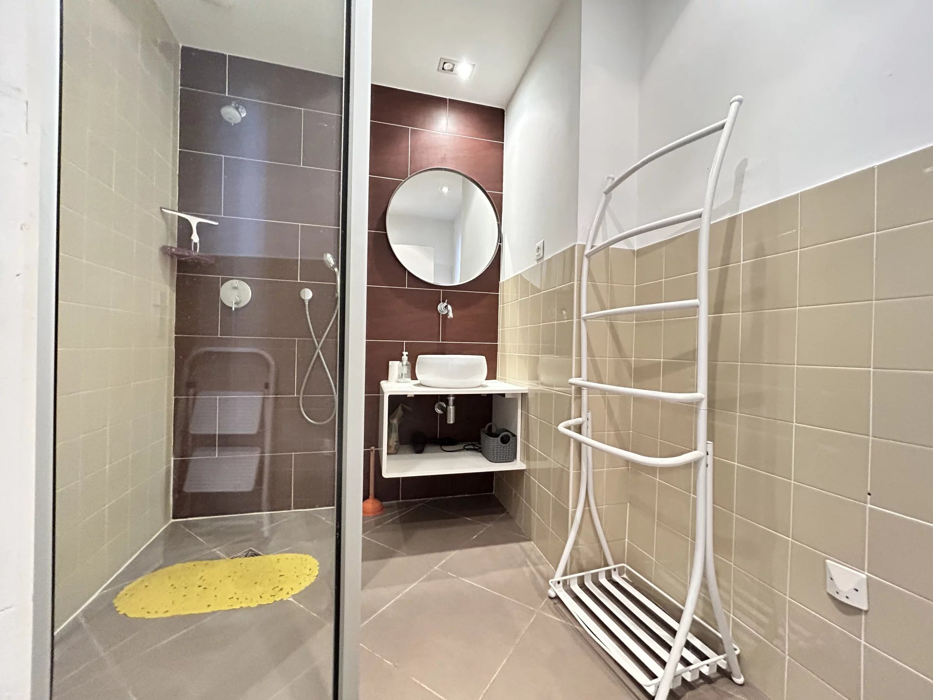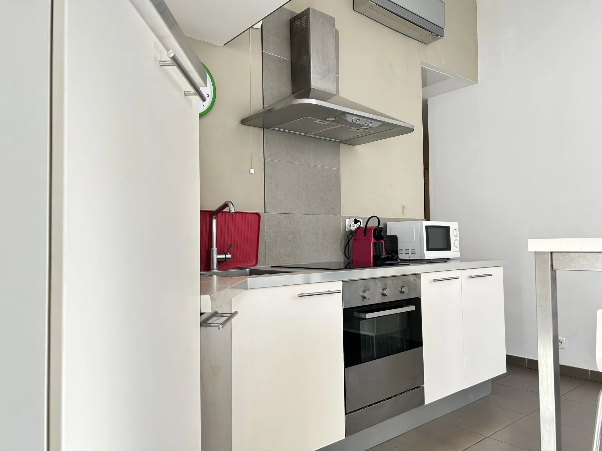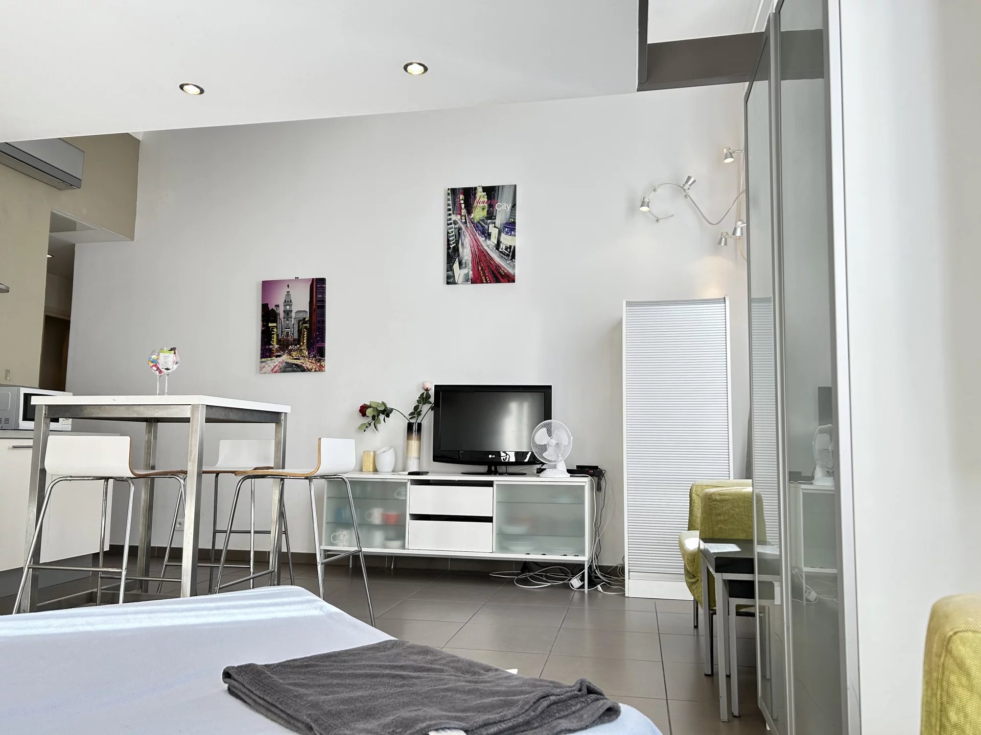 Rue Borniol, à quelques minutes à pied du centre ville, à proximité des commerces et moins de 10 minutes à pied des plages. Grand studio avec mezanine, composé d'une entrée, une pièce principale avec cuisine américaine, un canapé lit, 1 grand mit dans la mezzanine ( Impossible de se lever) , une salle de douche et un wc. Climatisation, lave linge, air conditionné, double vitrage
