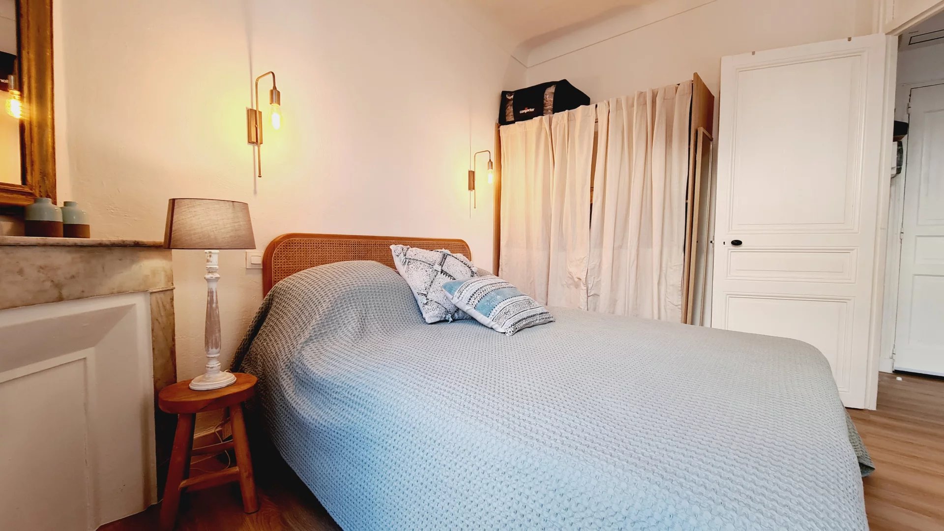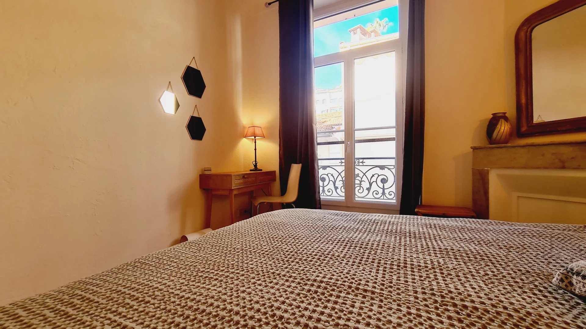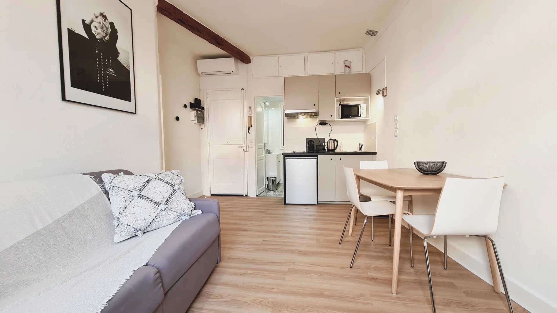 Cannes centre, Zone piétonne, au 2° étage d'un petit immeuble sans ascenseur, appartement tyope T2 en très bon état. Il se copose d'un salon avec coin cuisine, un espace repas et un canapé lit, une chambre avec un coin bureau, un grand lit et du rangement. salle de douche avec wc L'appartement est climatisé, dispose d'un accès internet et de double vitrage Idéal vacances et congrès