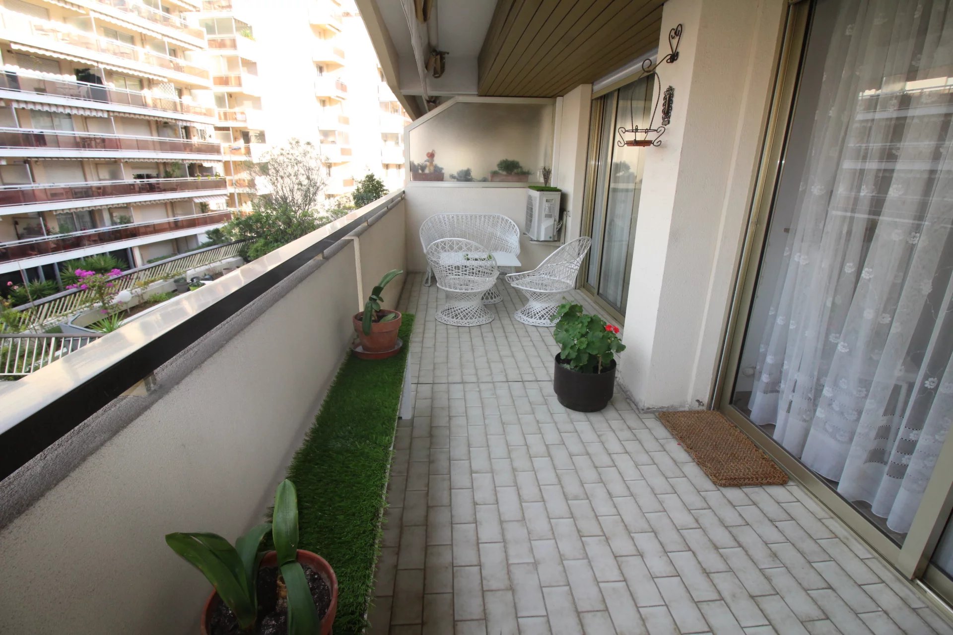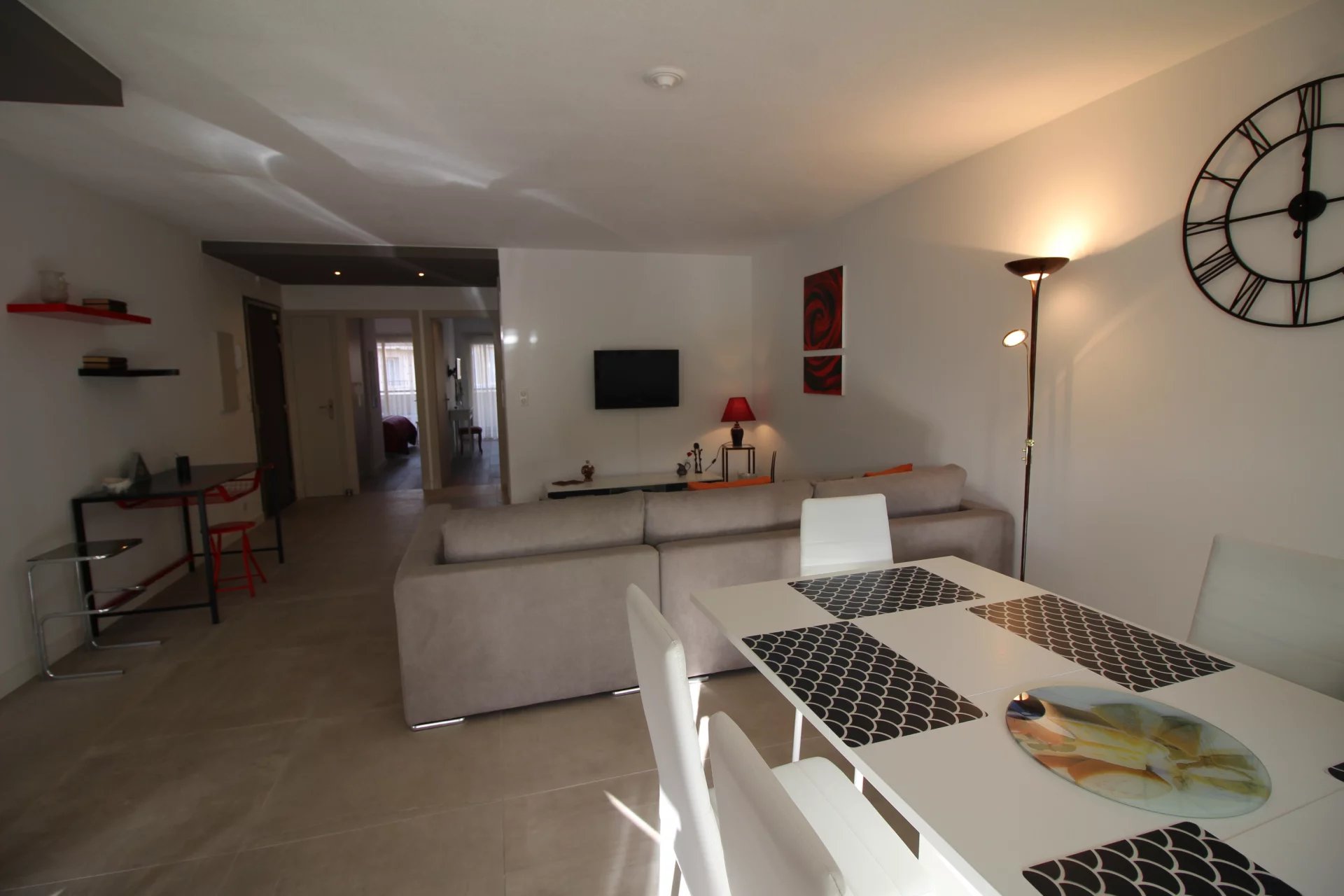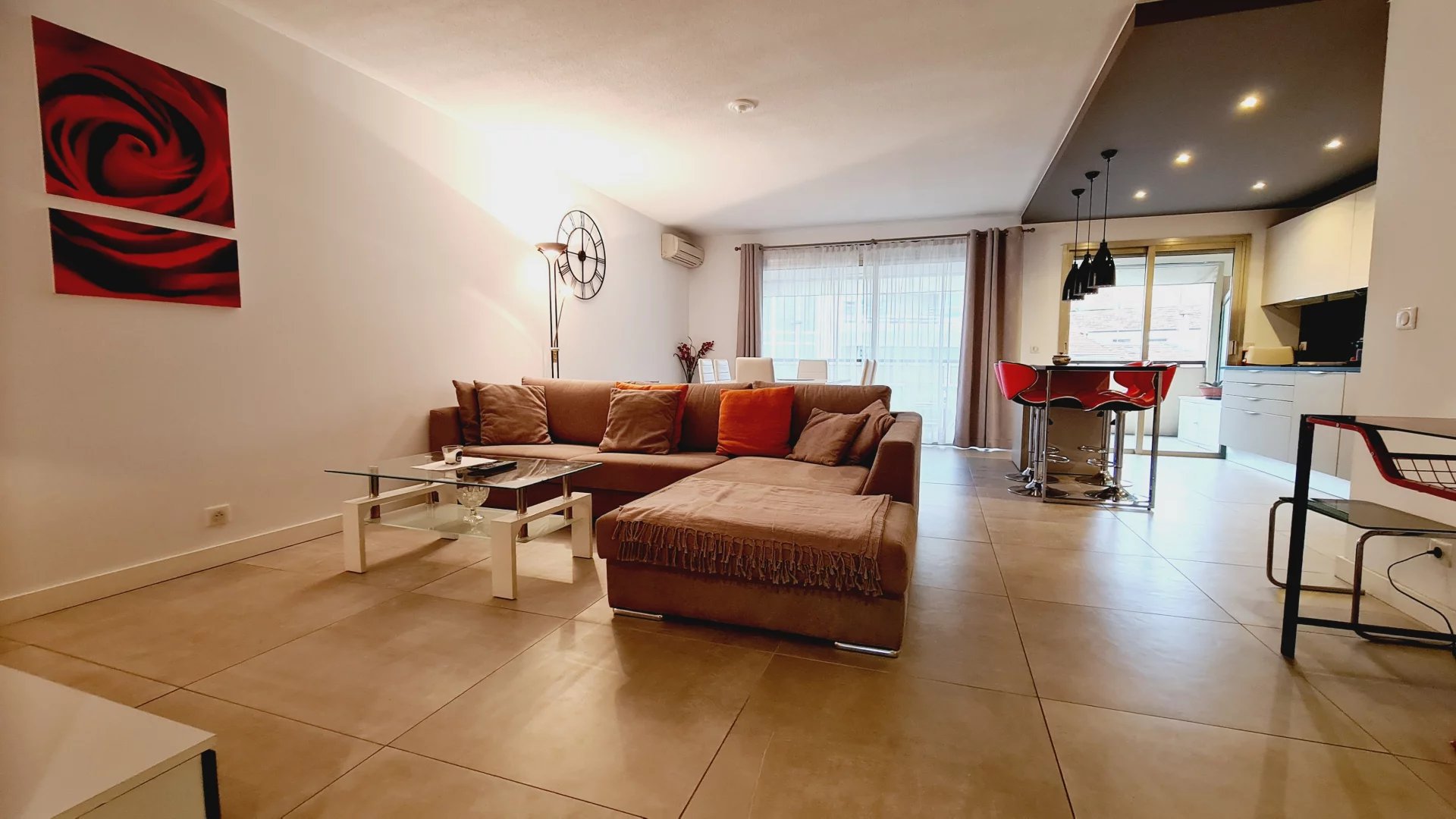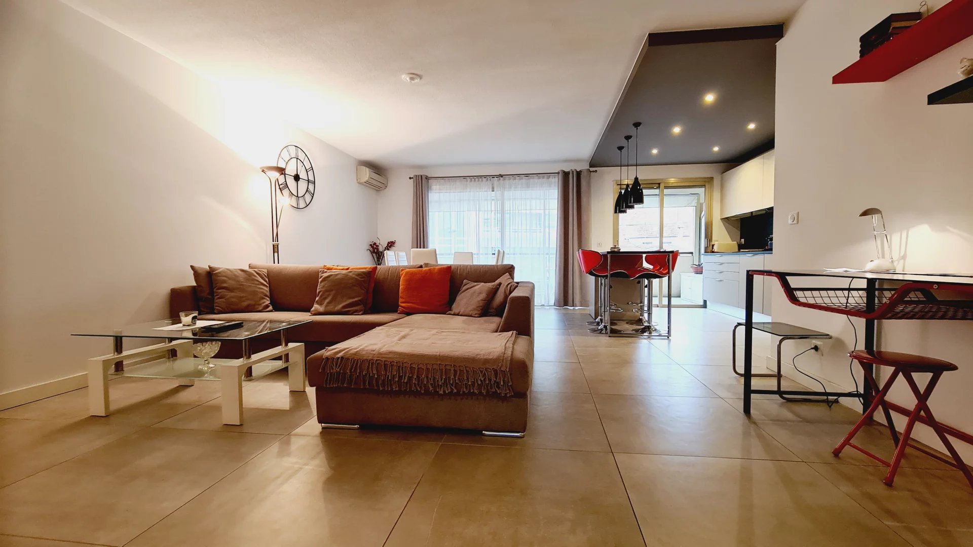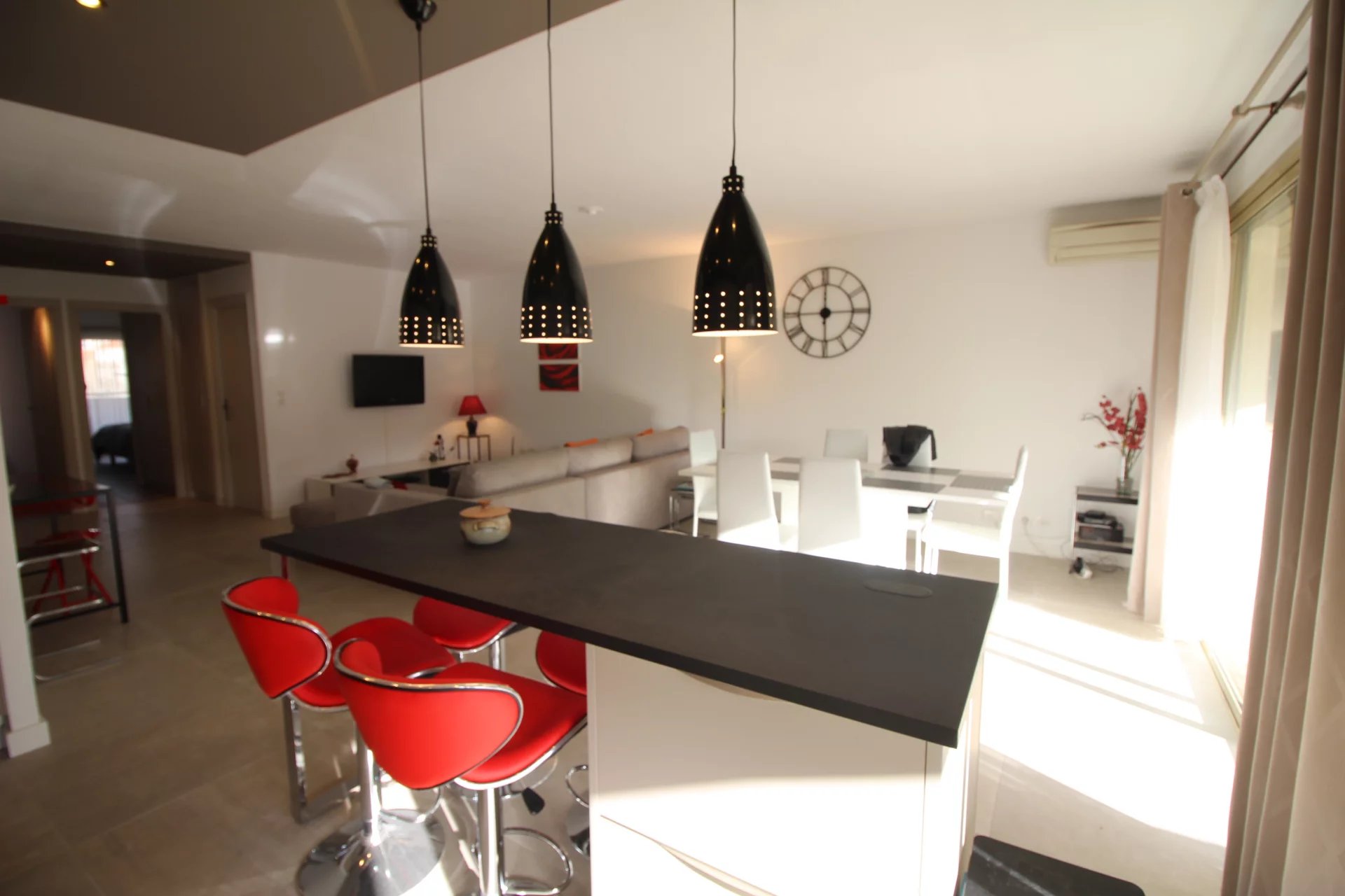 Appartement type 3 pièces, refait à neuf, de 80 m² composé : d'une entrée, un séjour-salle à manger, une cuisine équipée, 2 chambres, une avec sa salle de bains et la seconde avec sa salle de douches, 1 WC indépendant et deux terrasses de 14 et 12 m². Climatisation dans une chambre et le salon. Internet Fibre.