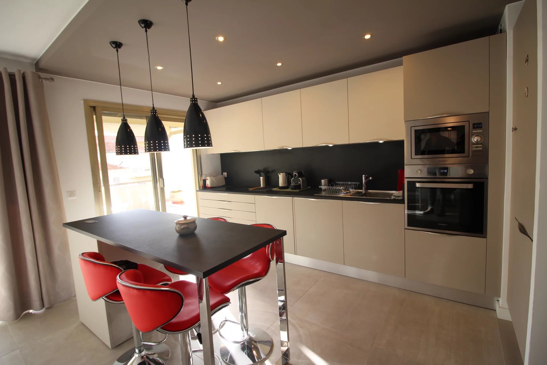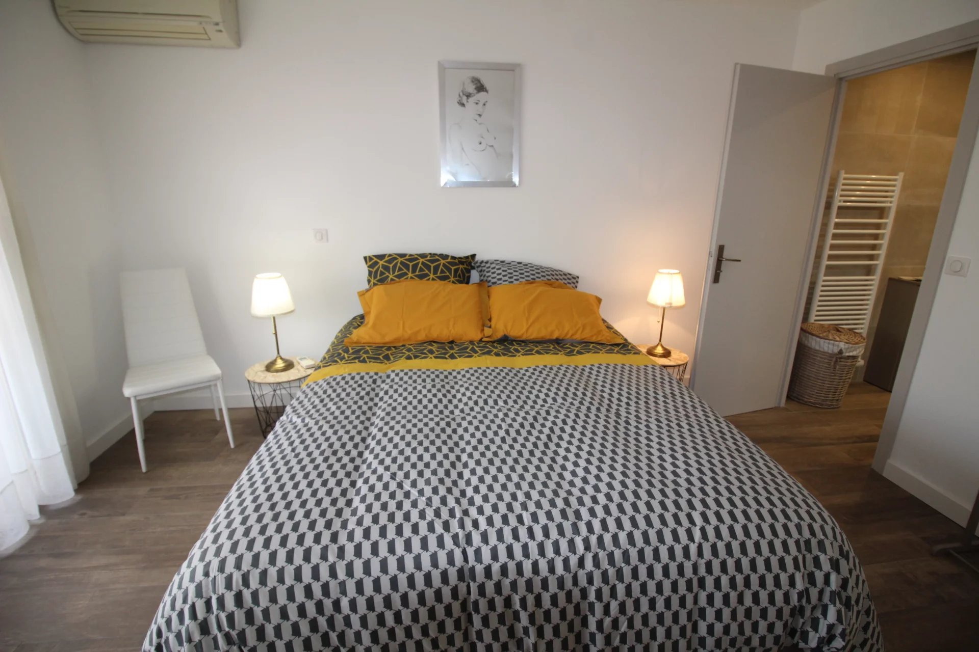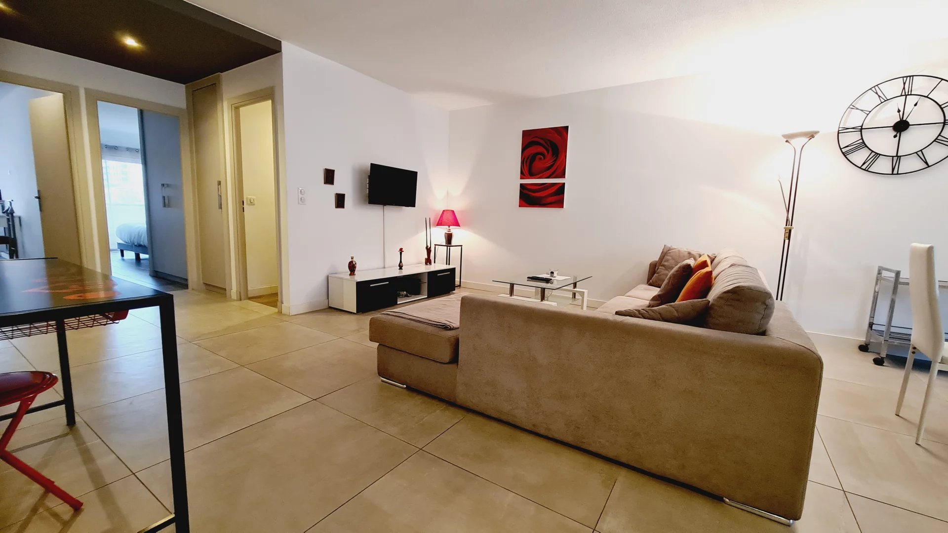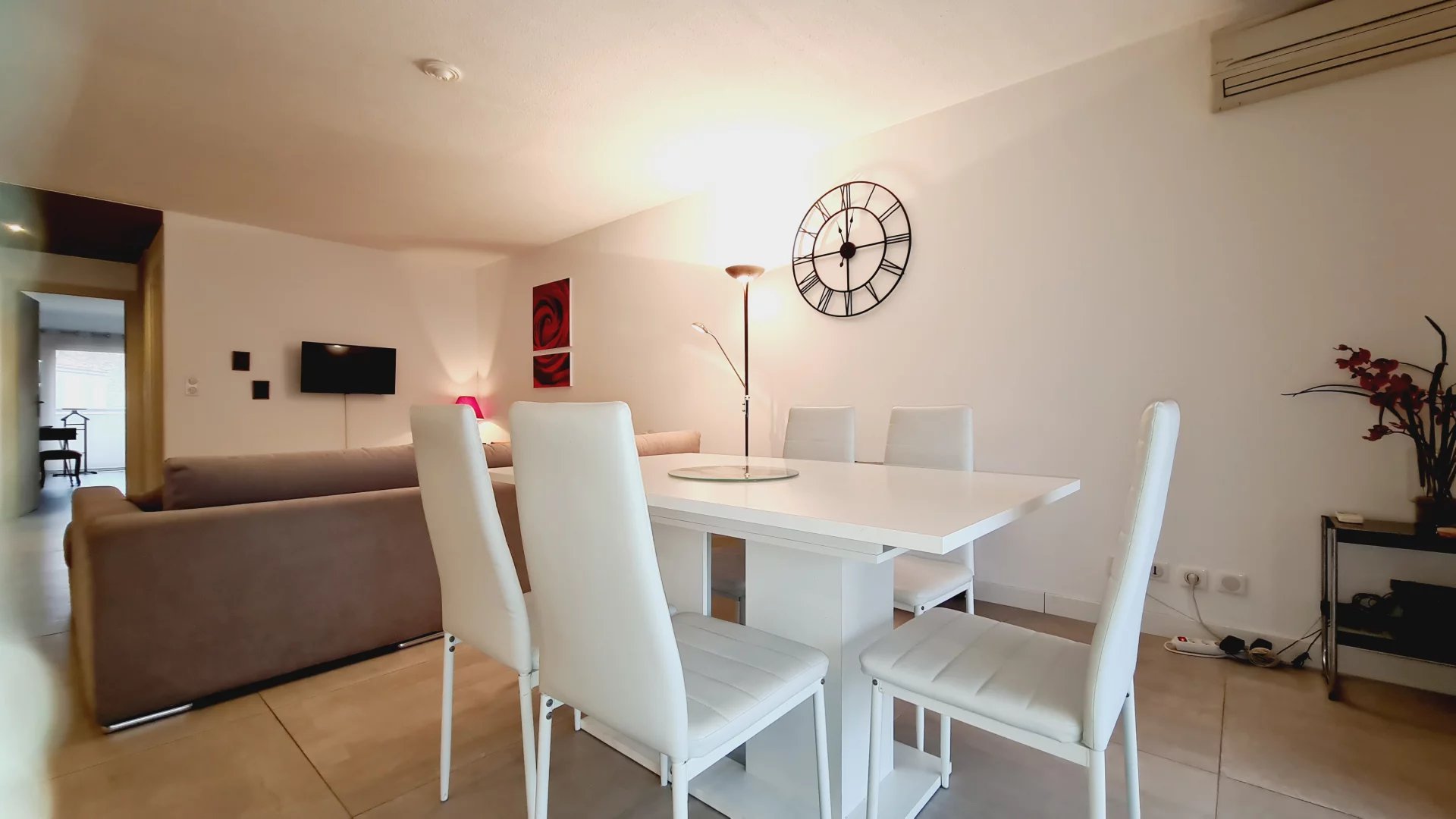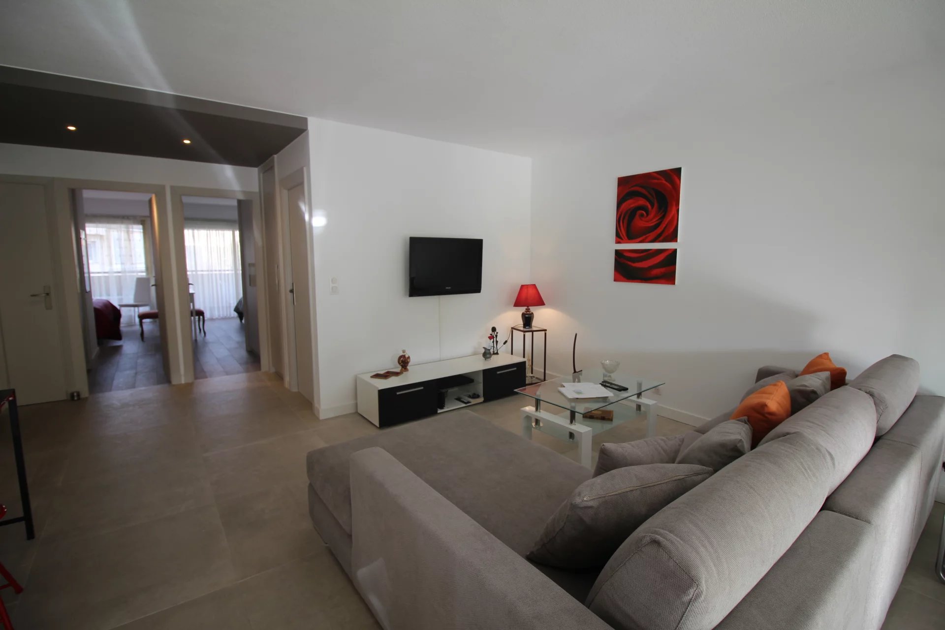 Appartement type 3 pièces, refait à neuf, de 80 m² composé : d'une entrée, un séjour-salle à manger, une cuisine équipée, 2 chambres, une avec sa salle de bains et la seconde avec sa salle de douches, 1 WC indépendant et deux terrasses de 14 et 12 m². Climatisation dans une chambre et le salon. Internet Fibre.