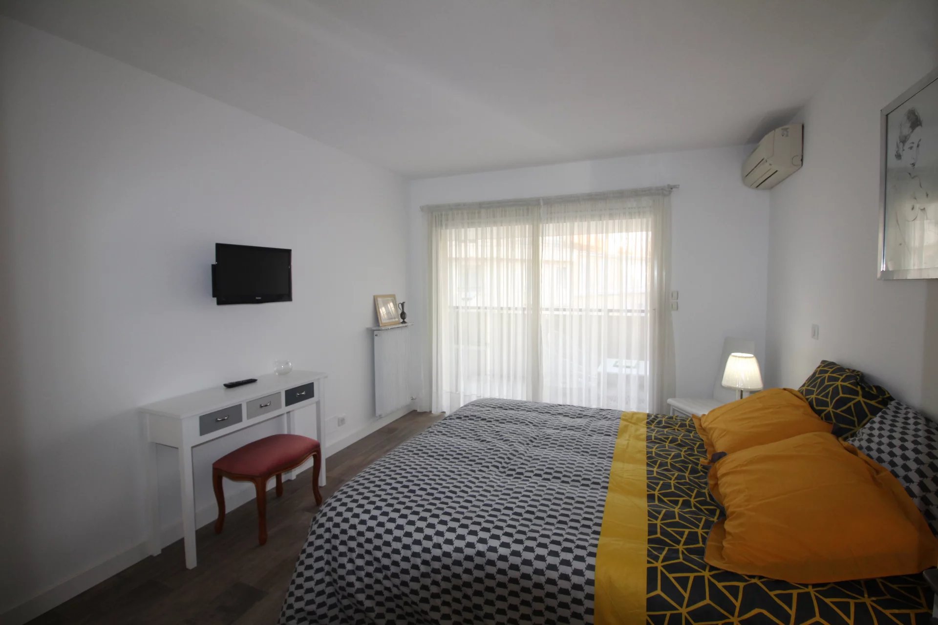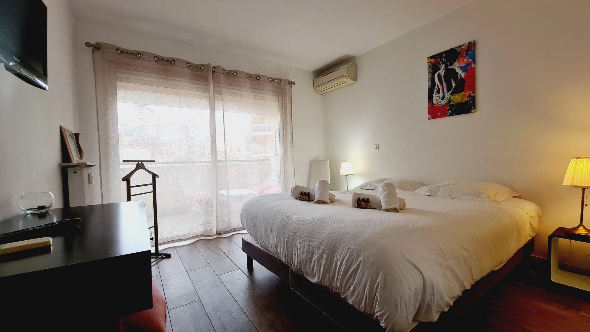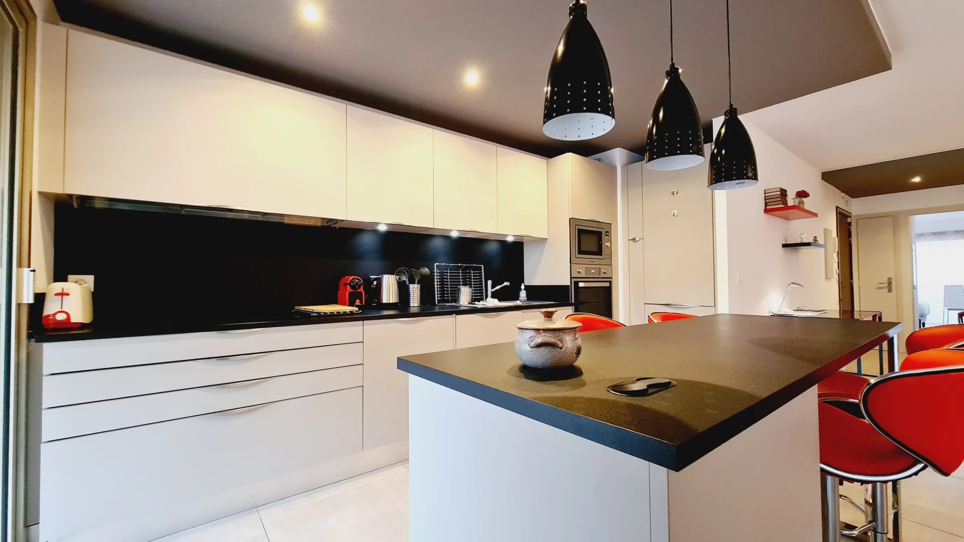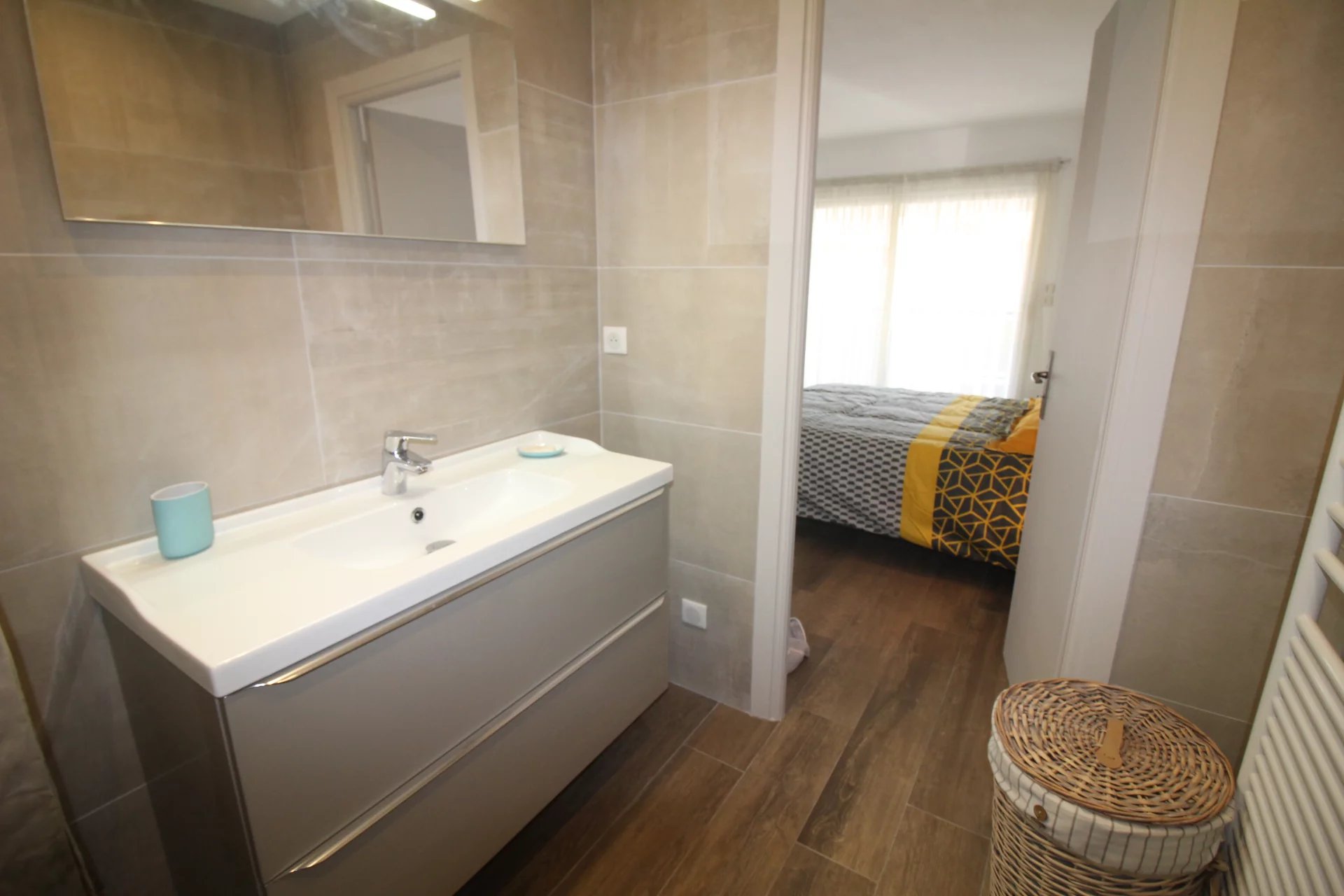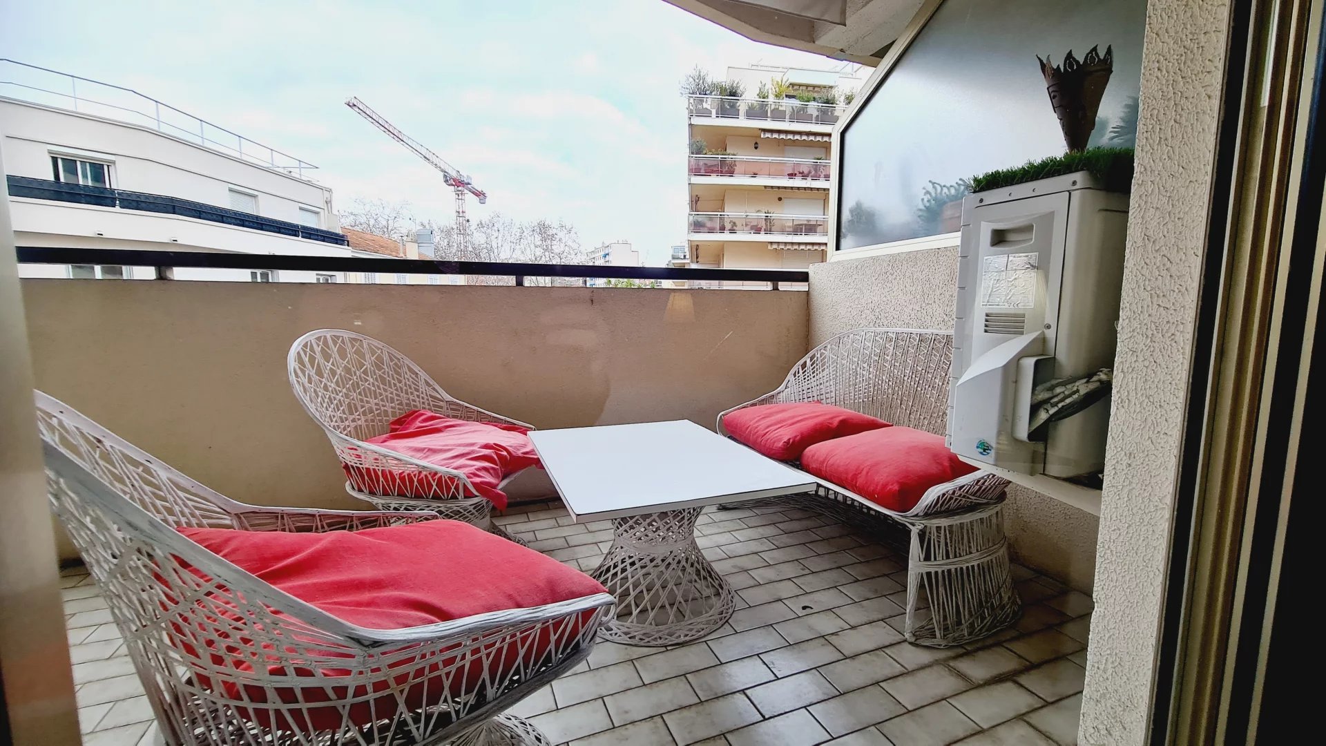Appartement type 3 pièces, refait à neuf, de 80 m² composé : d'une entrée, un séjour-salle à manger, une cuisine équipée, 2 chambres, une avec sa salle de bains et la seconde avec sa salle de douches, 1 WC indépendant et deux terrasses de 14 et 12 m². Climatisation dans une chambre et le salon. Internet Fibre.